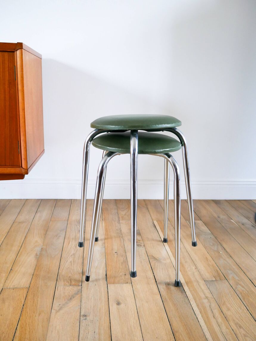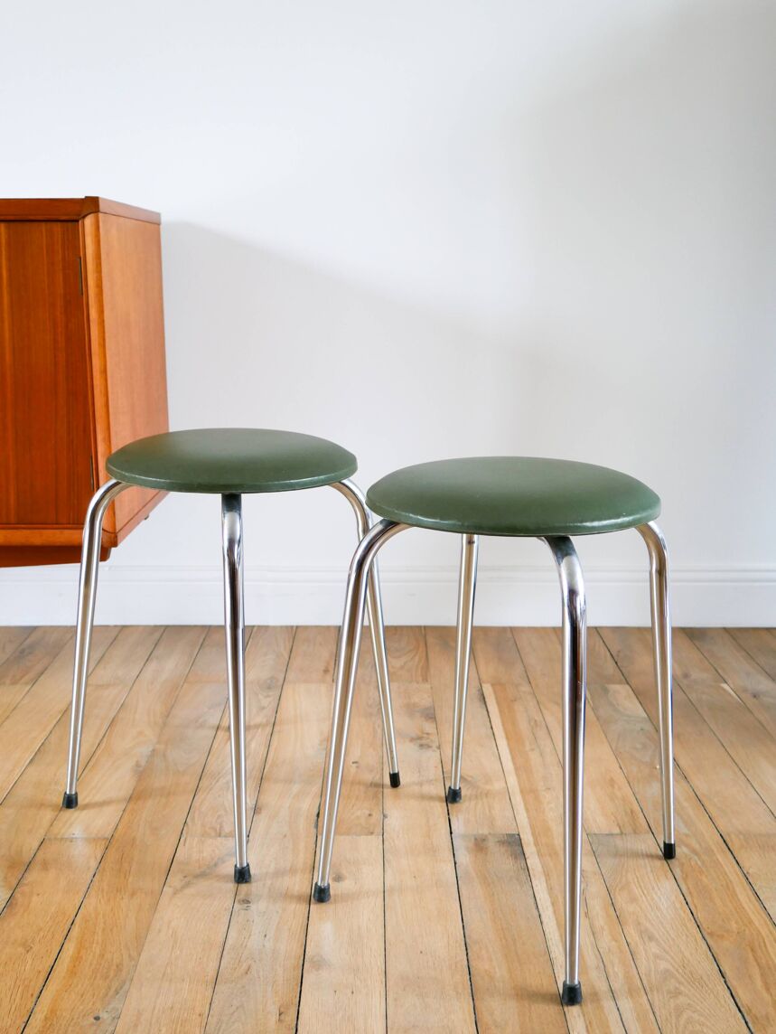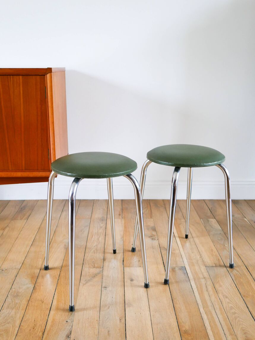 Joli paire de tabourets en chrome et skaï vert bouteille, Made in France, Modèle Déposé, 1970. En très bon état, de rares traces du temps. Envoi rapide et soigné. Possibilité d'envois groupés - plus économique et plus écologique ! Dimensions : 46 X 30 cm.