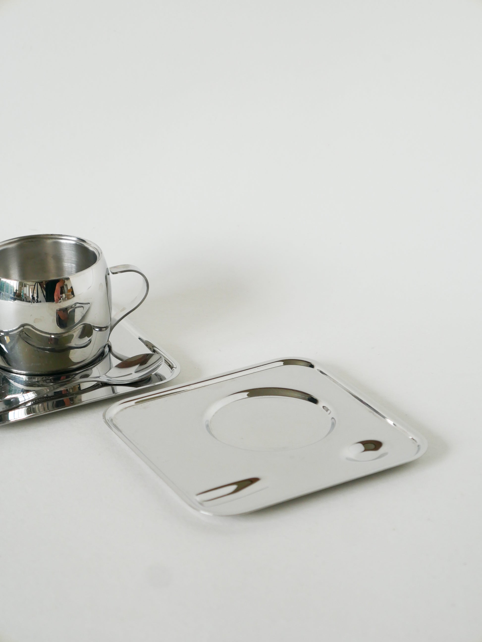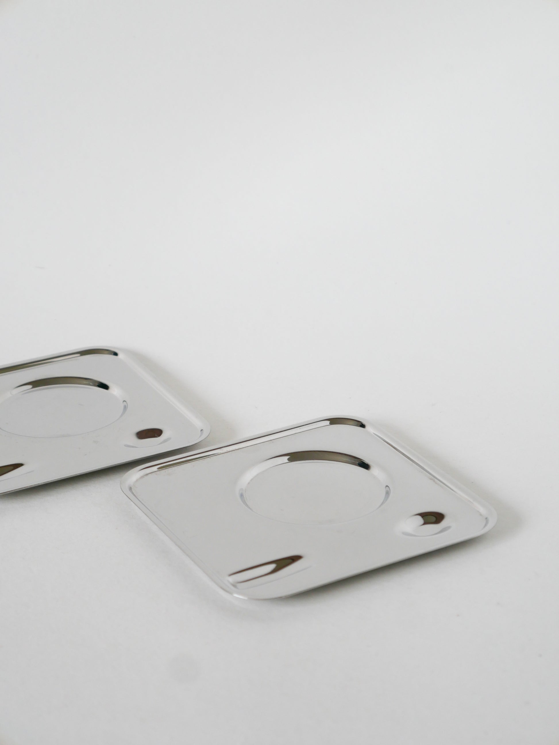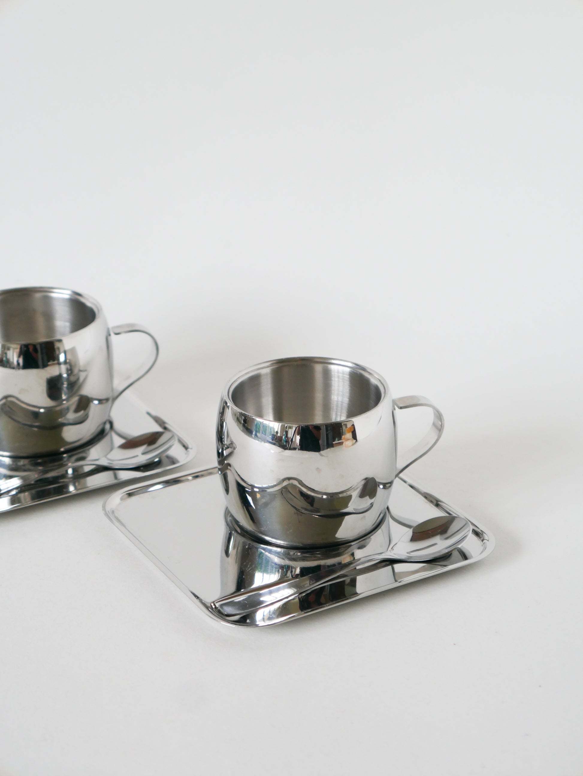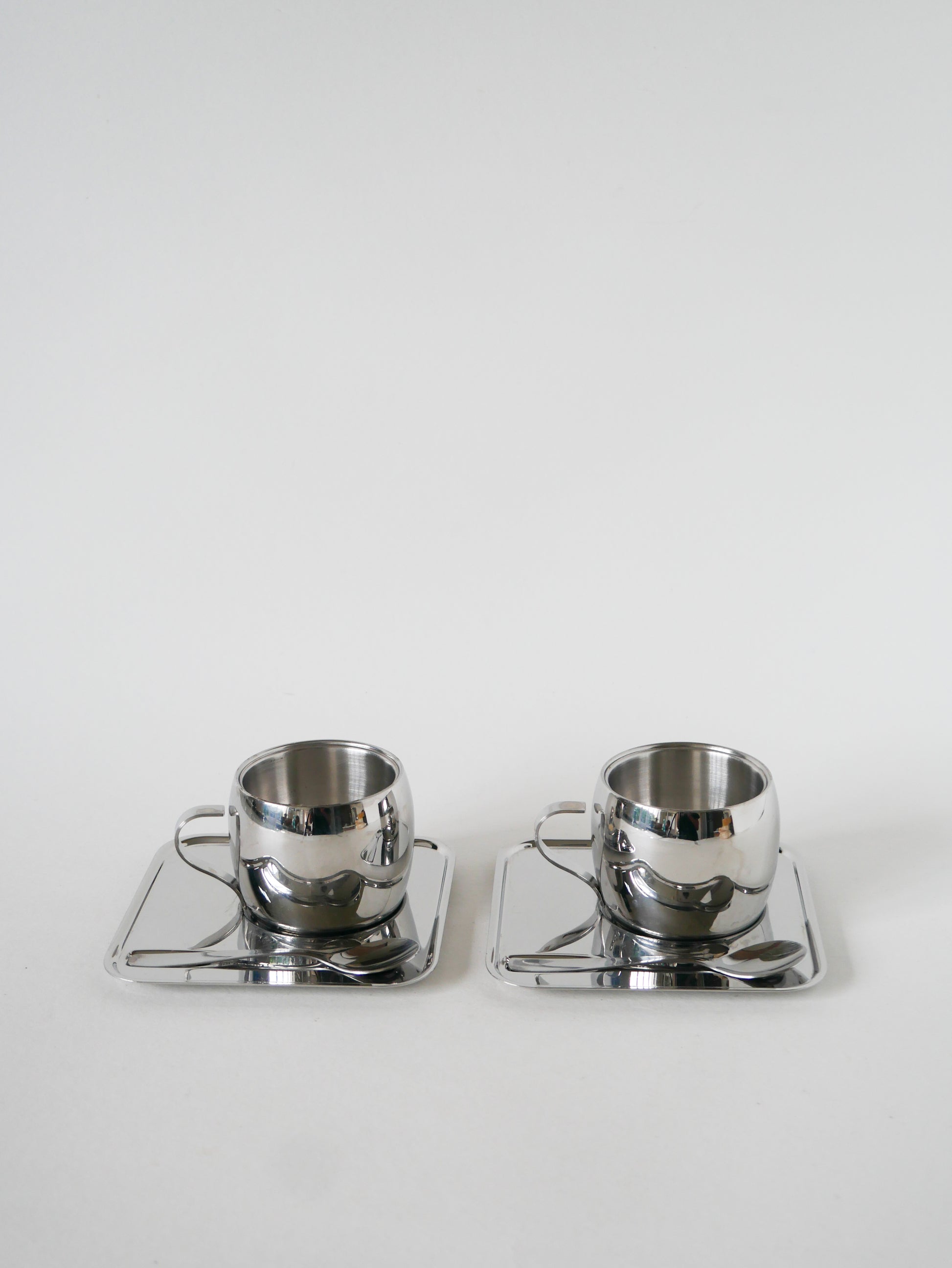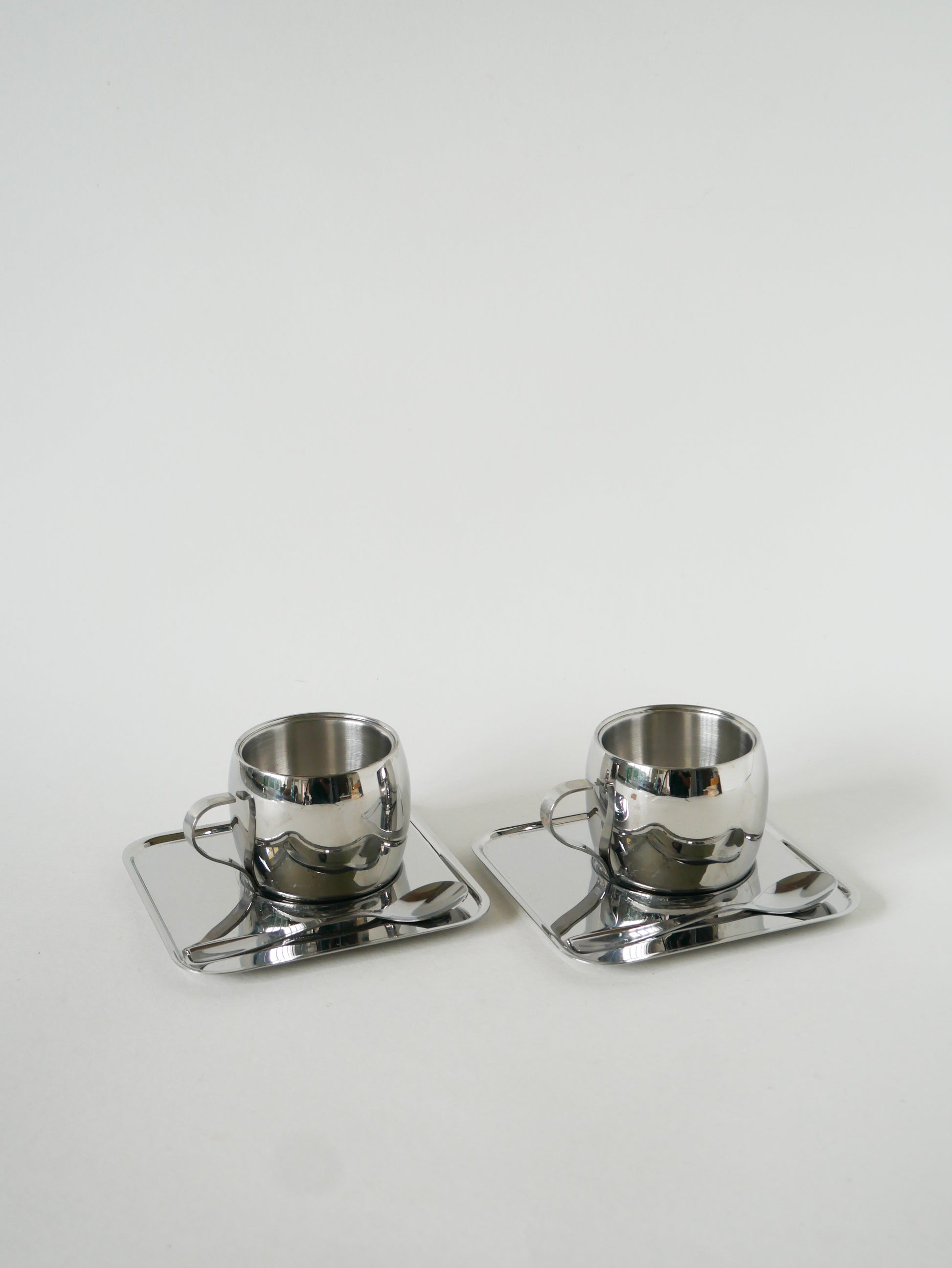 Superbe paire de tasses à café en inox, Made in Brazil, Design, 1980. En très bon état, de rares traces du temps. Envoi rapide et soigné. Possibilité d'envois groupés - plus économique et plus écologique ! Dimensions : Plateaux : 11.5 cm ; tasses : 6.5 X 5.5 cm.
