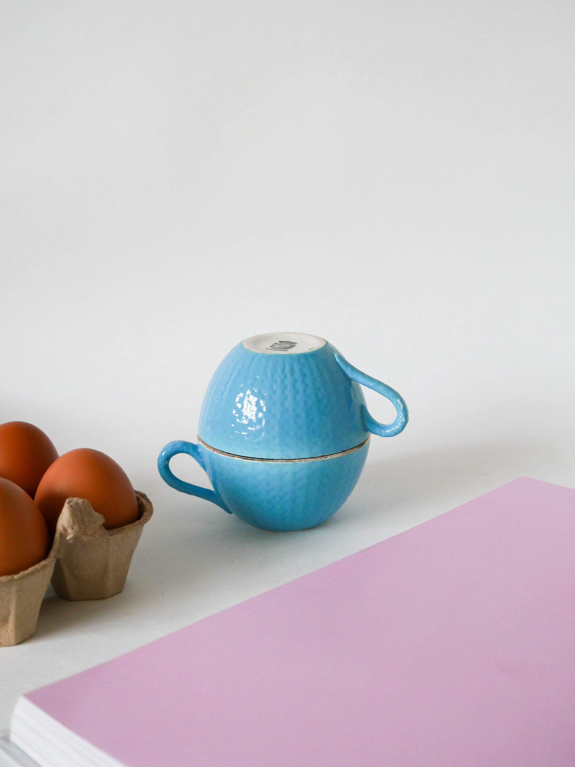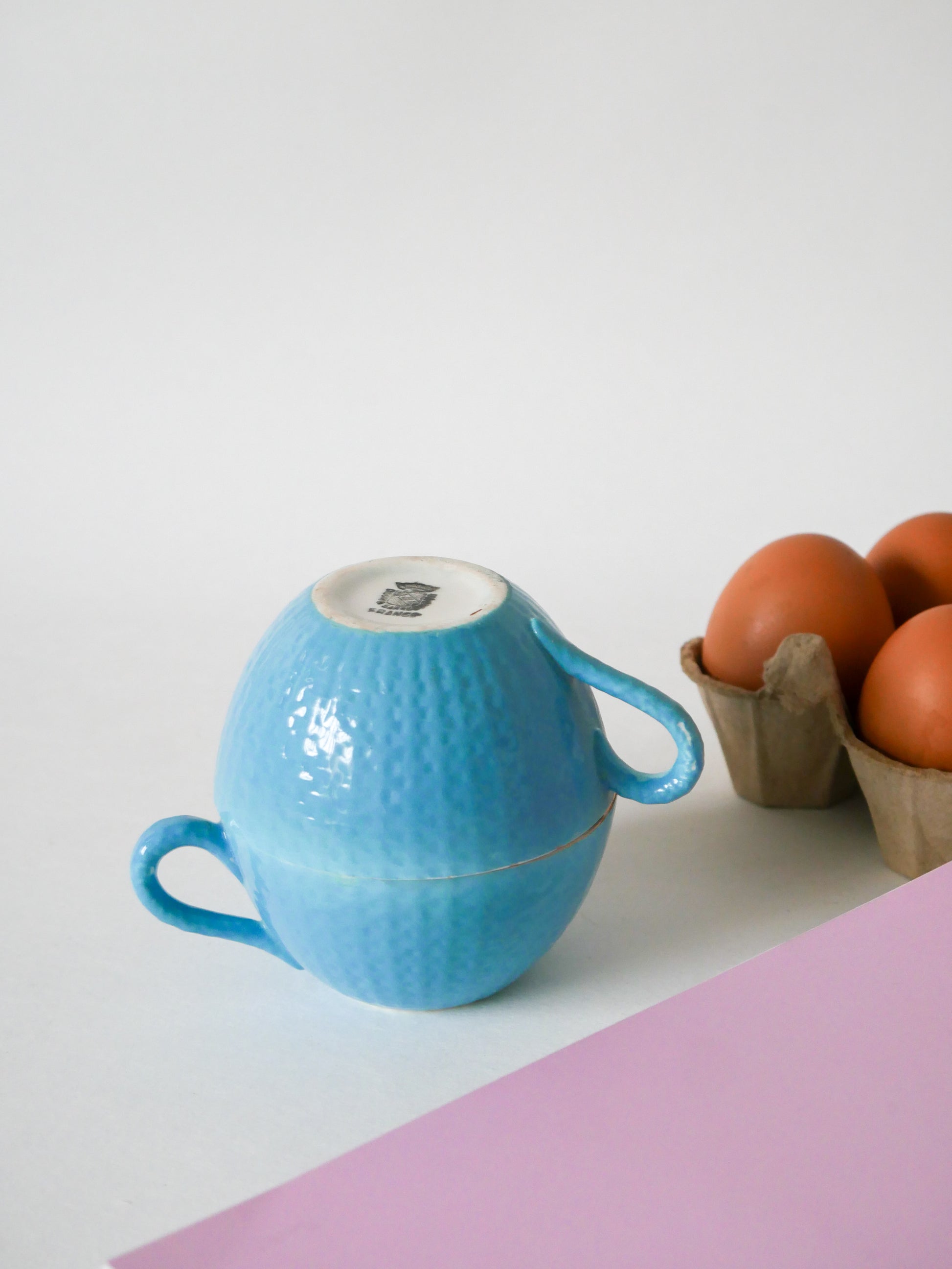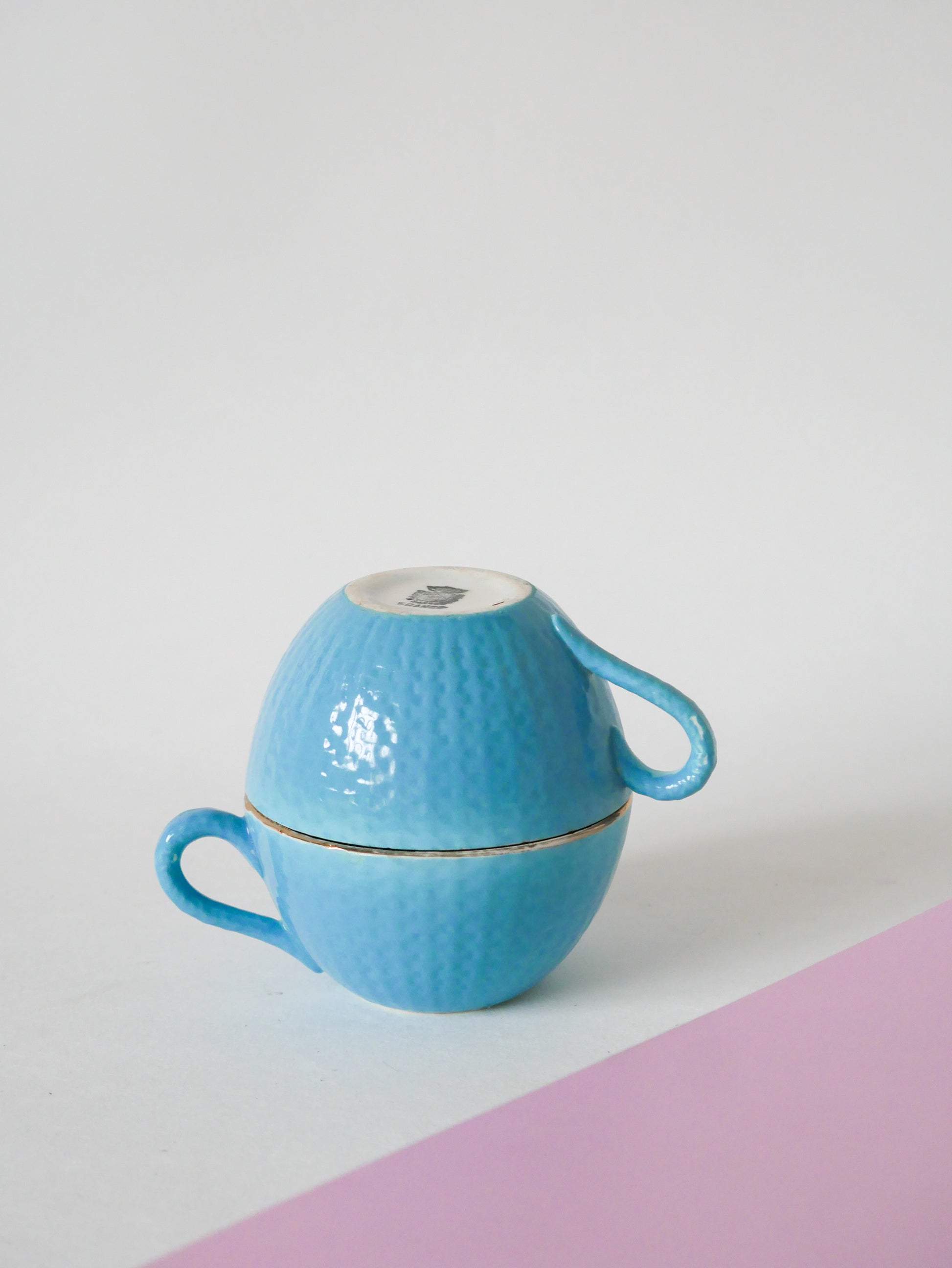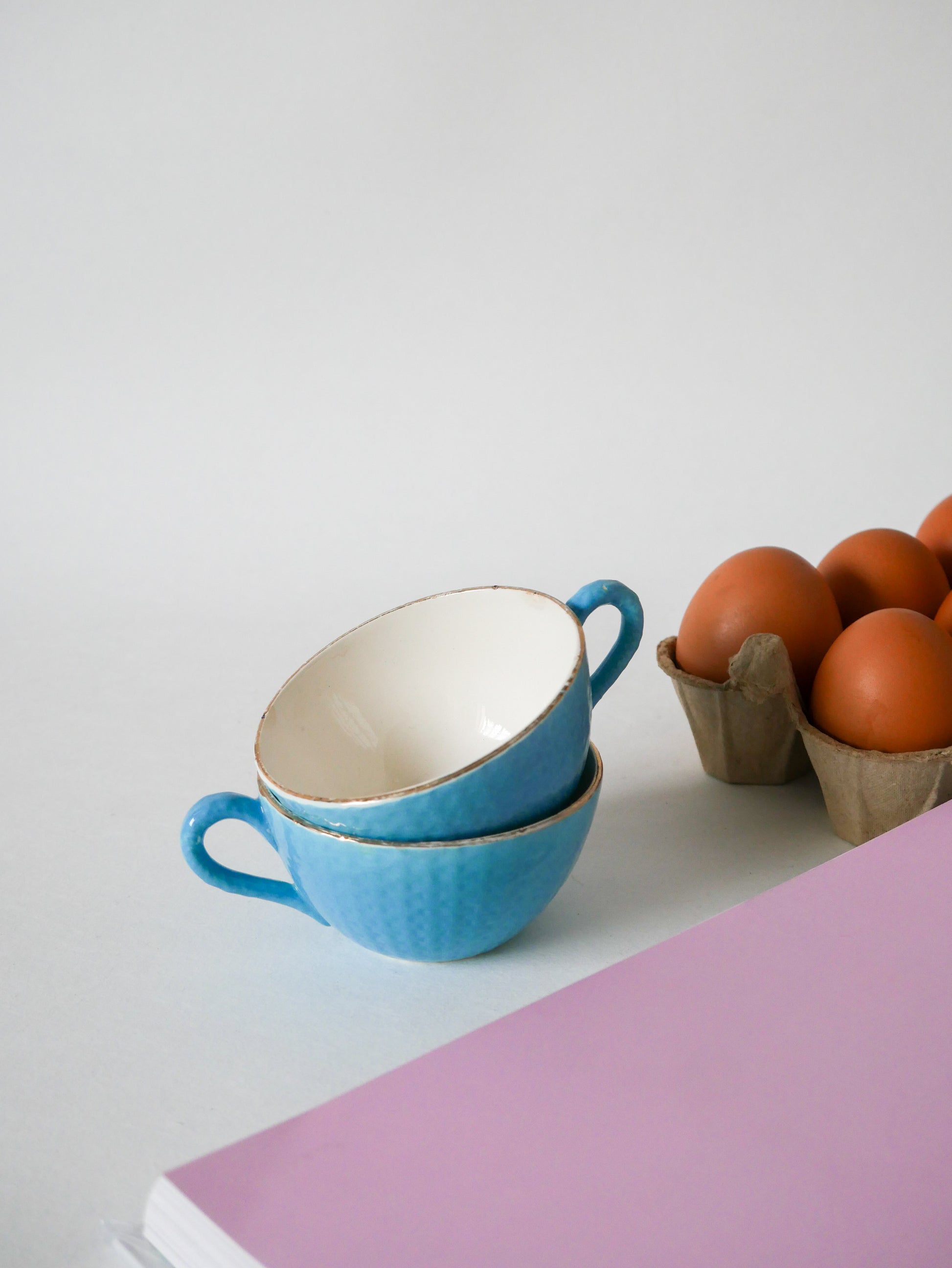 Paire de tasses Digoin Sarreguemines texturées bleu ciel et liseré doré 1950