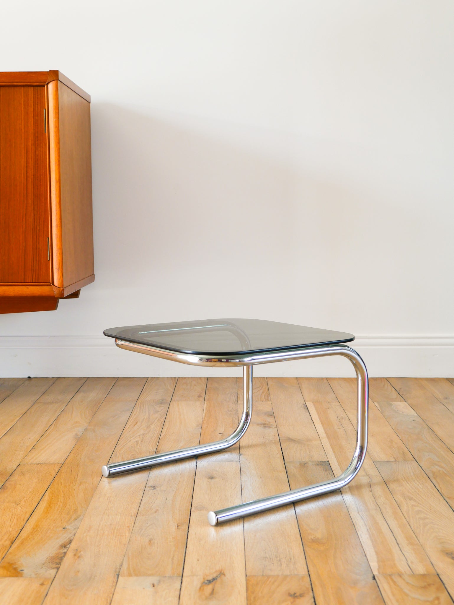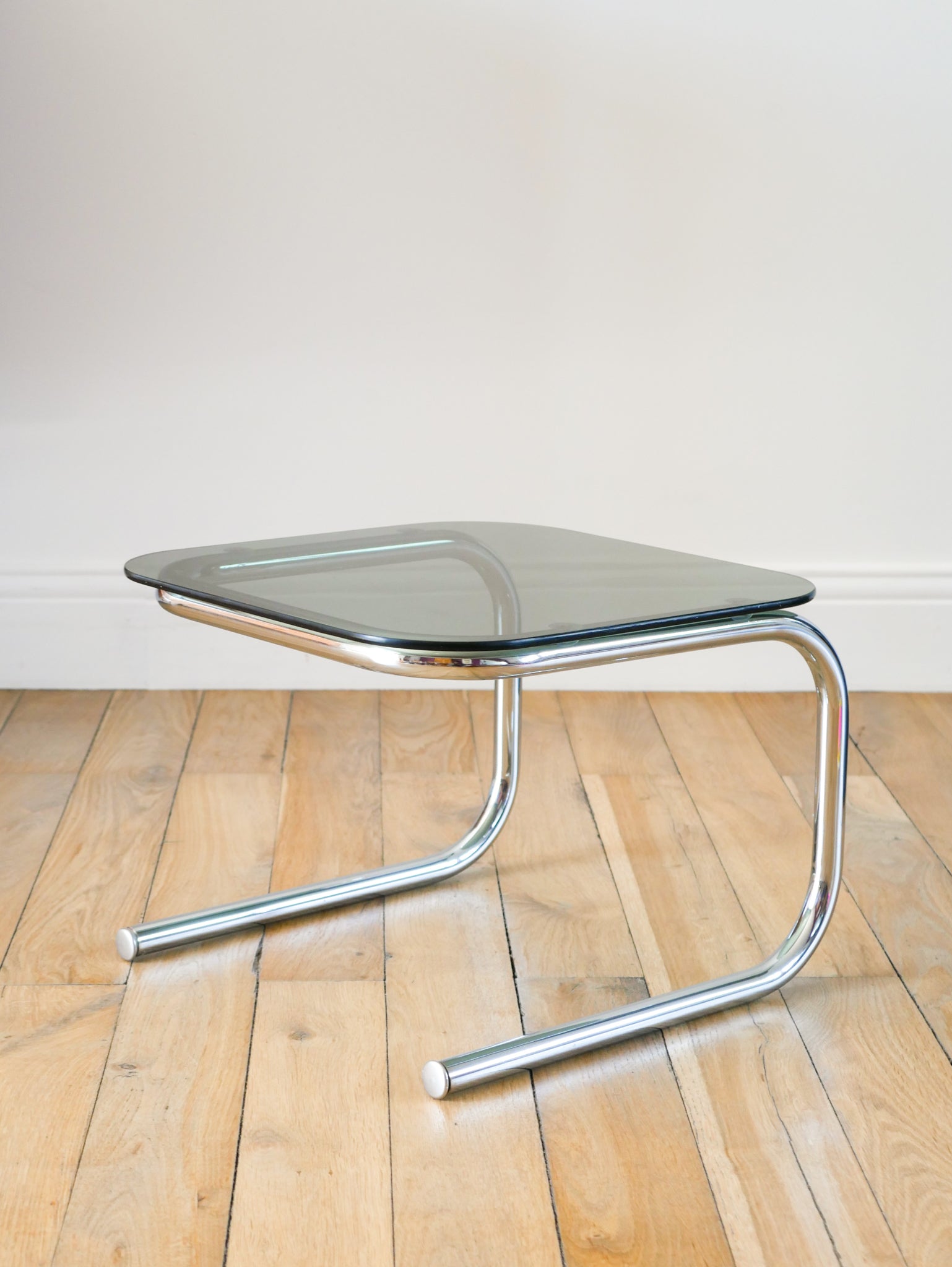 Petite table basse tubulaire en verre fumé et chrome, Design, 1970