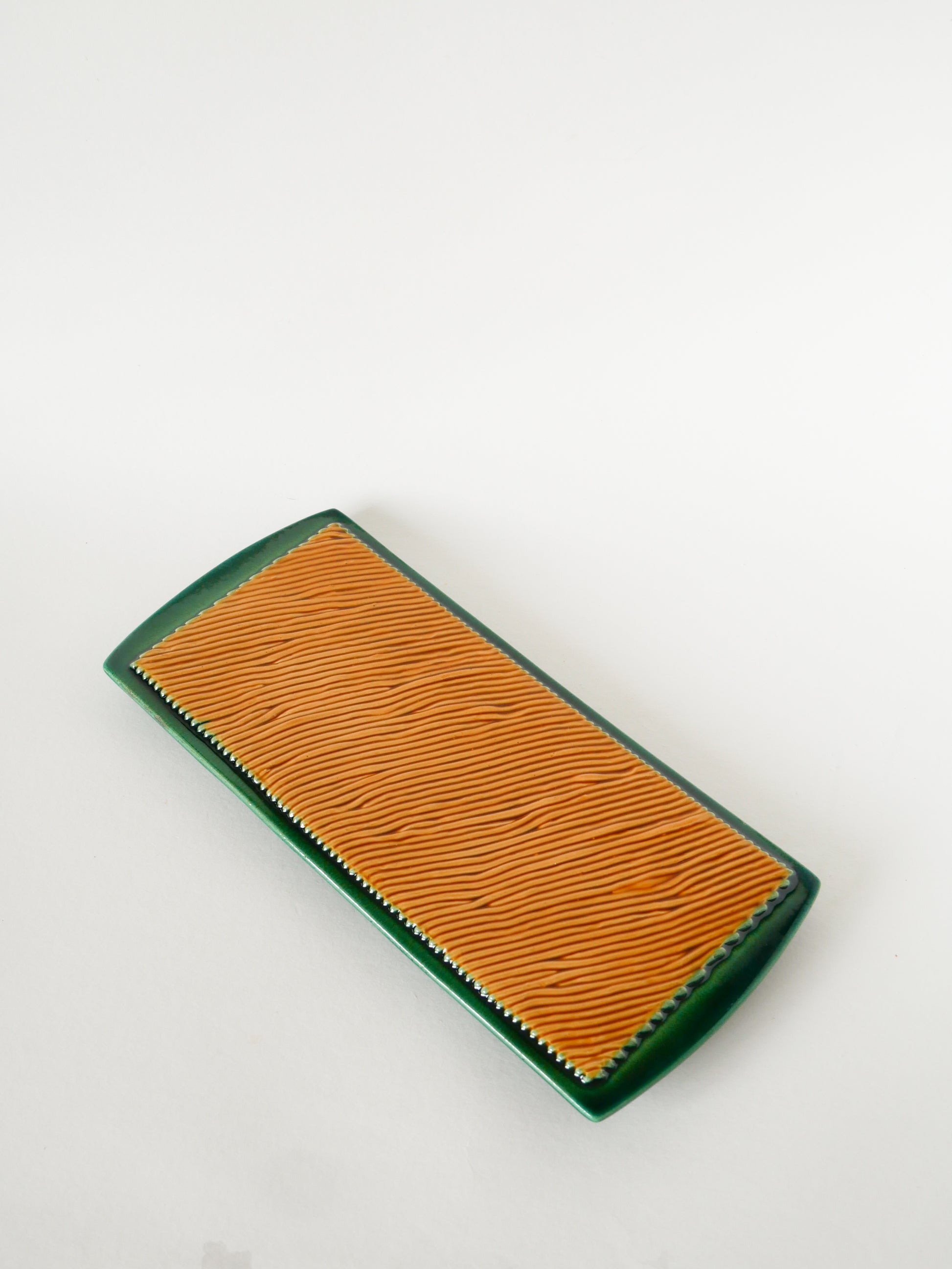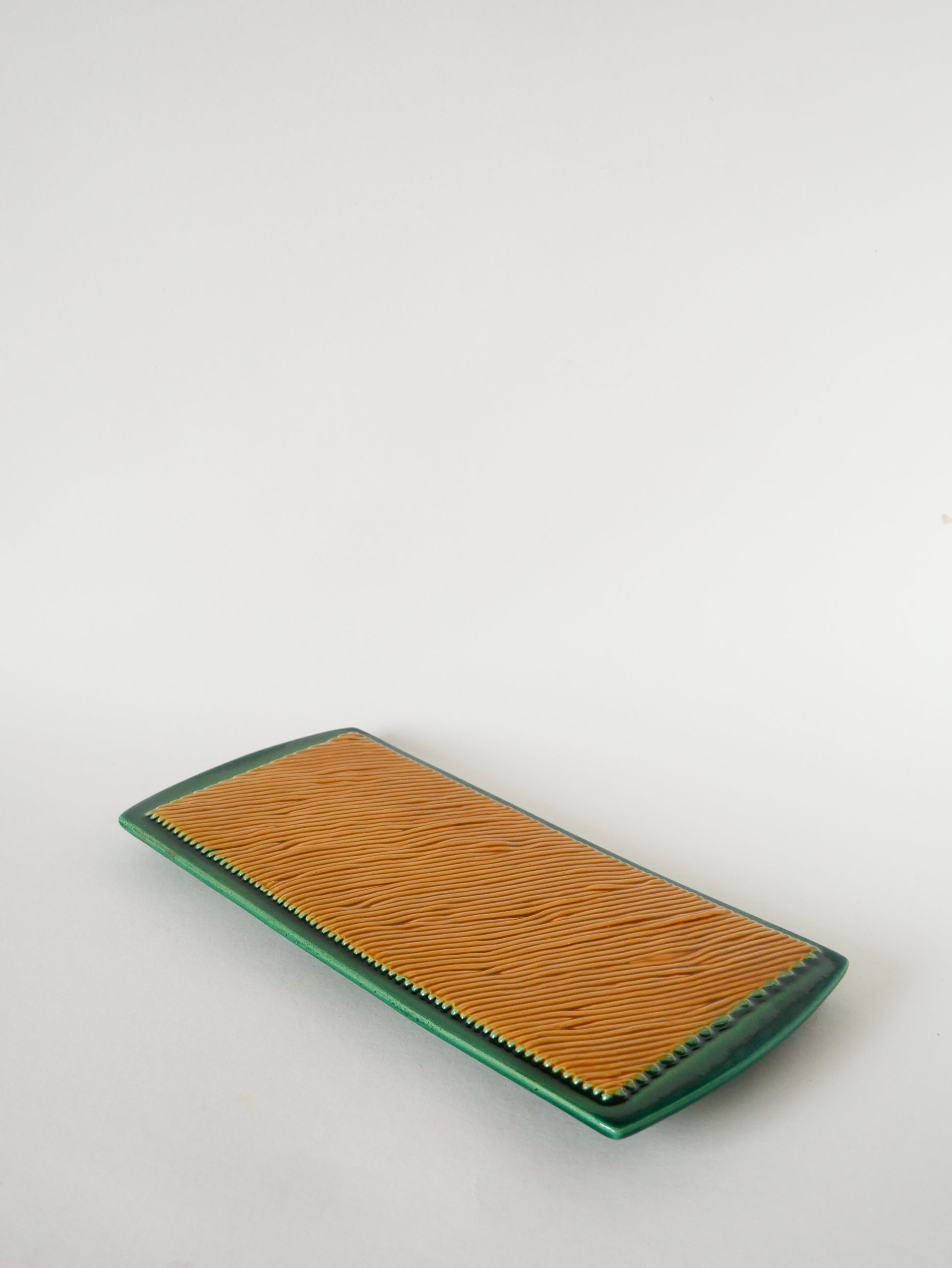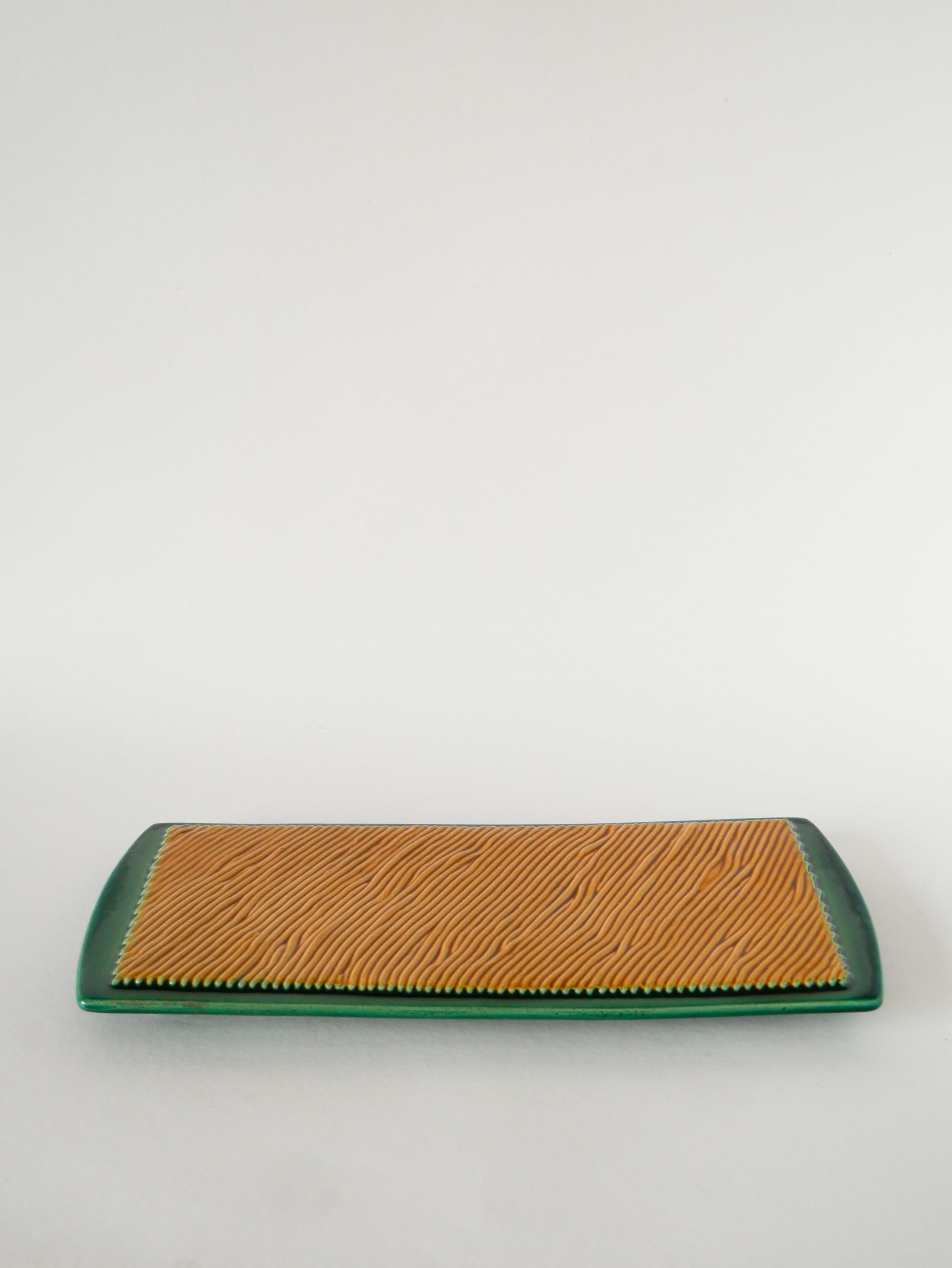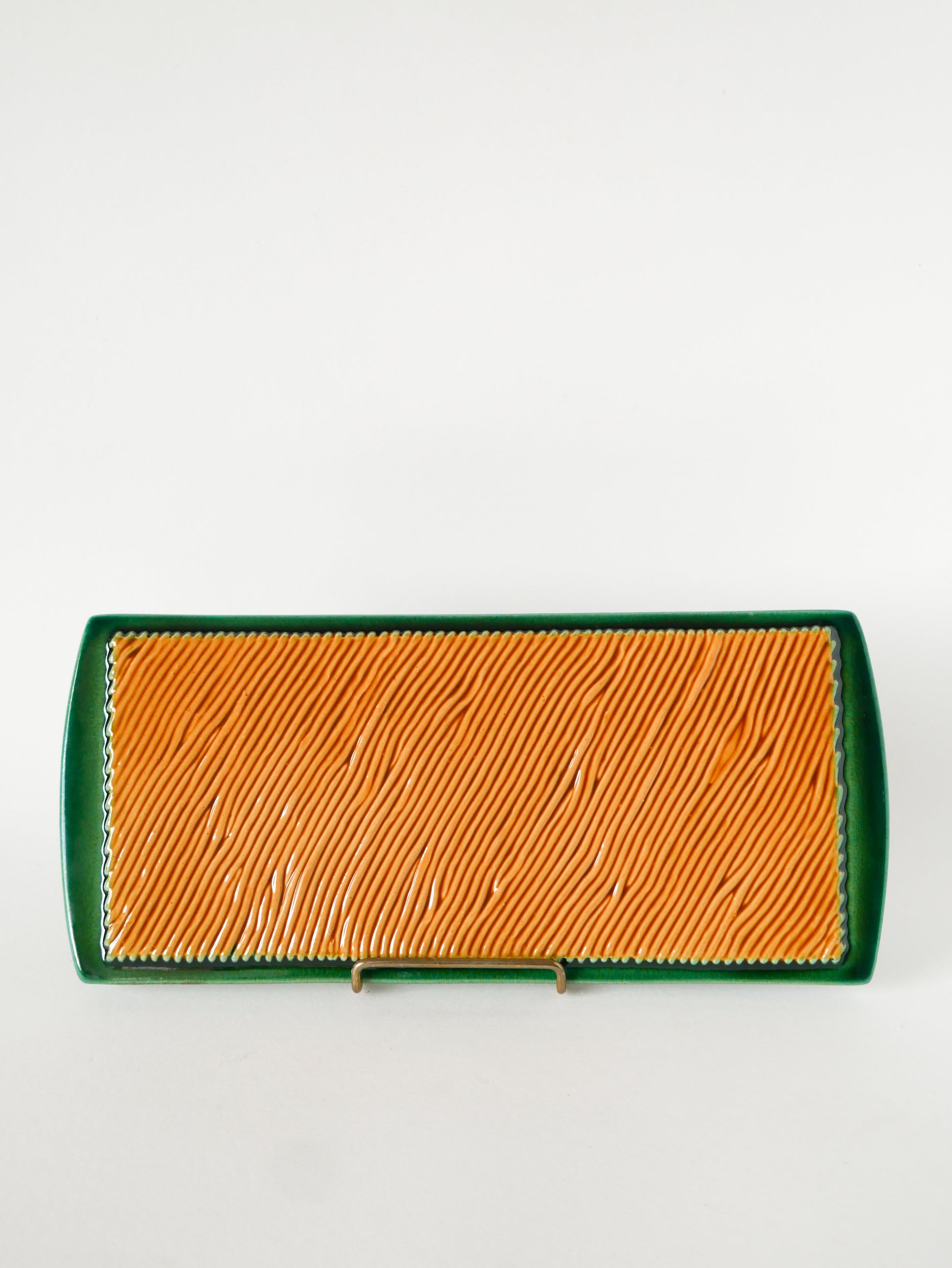 Superbe plat à cake en barbotine, Jaune et Verre, 1970. En très bon état, de rares traces du temps. Envoi rapide et soigné. Possibilité d'envois groupés - plus économique et plus écologique ! Dimensions : 35 X 15 cm.