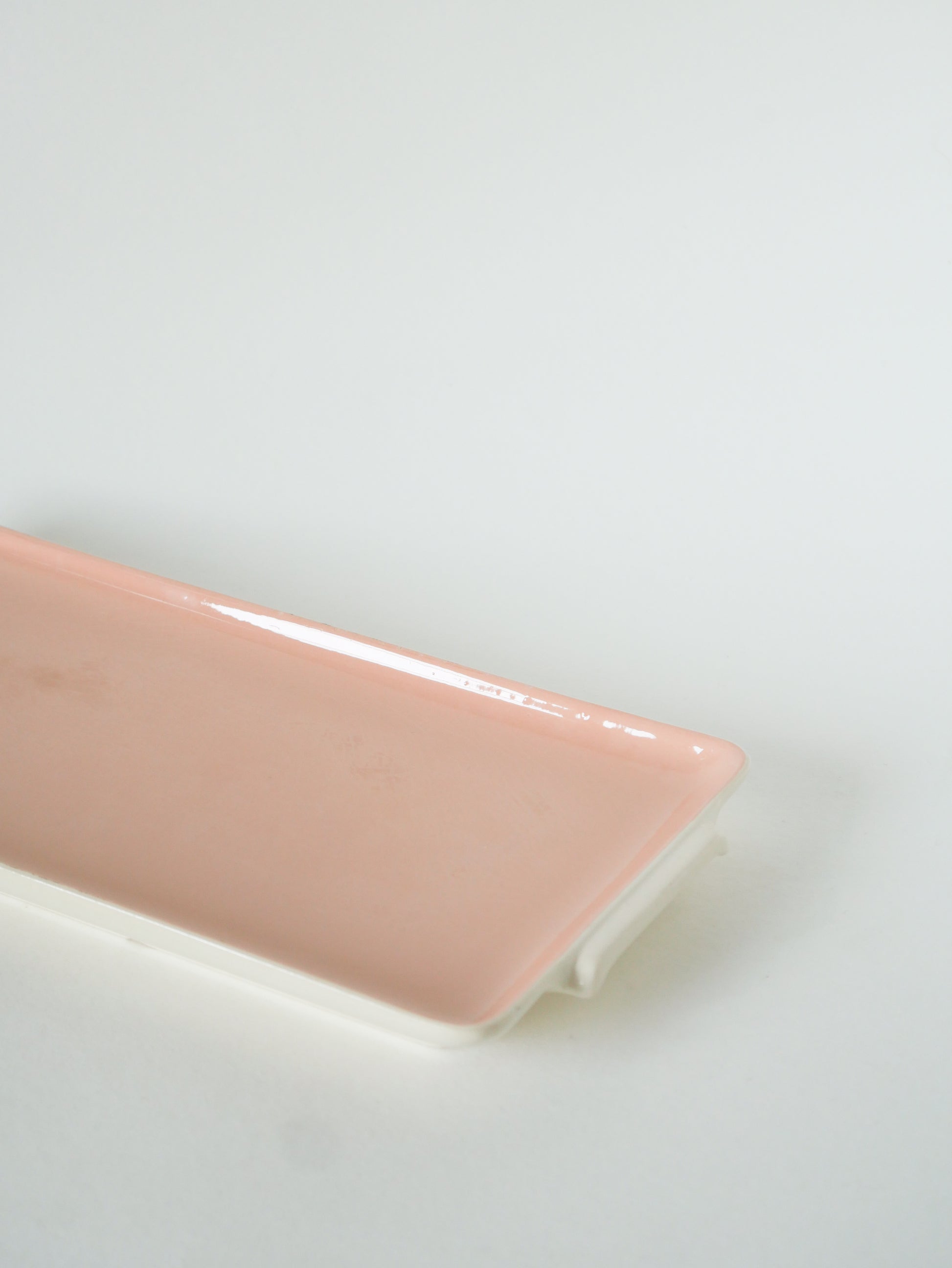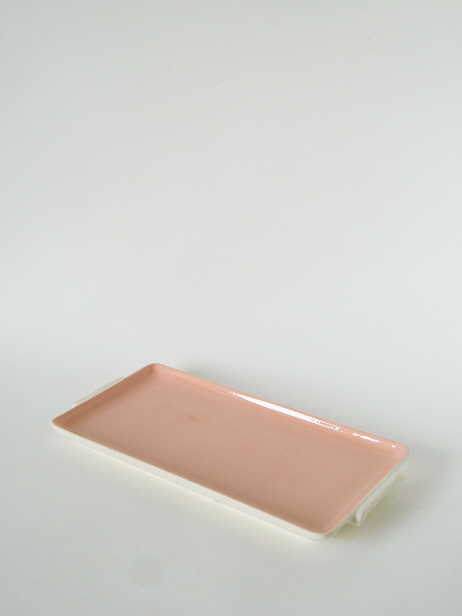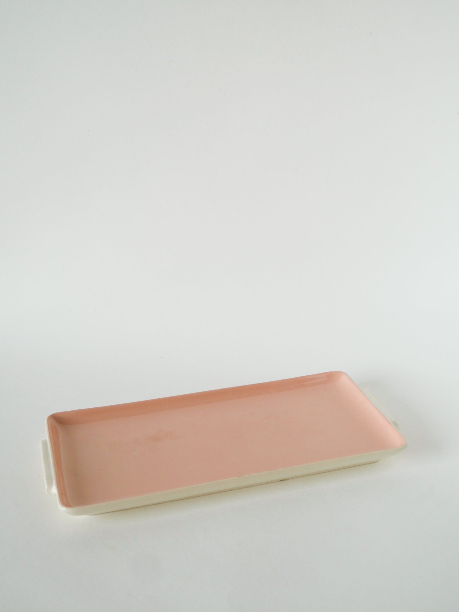 Joli plat à cake en faïence, Rose Poudré, 1950. En bon état général, à noter des traces du temps. Envoi rapide et soigné. Possibilité d'envois groupés - plus économique et plus écologique ! Dimensions : 33 X 15 cm.
