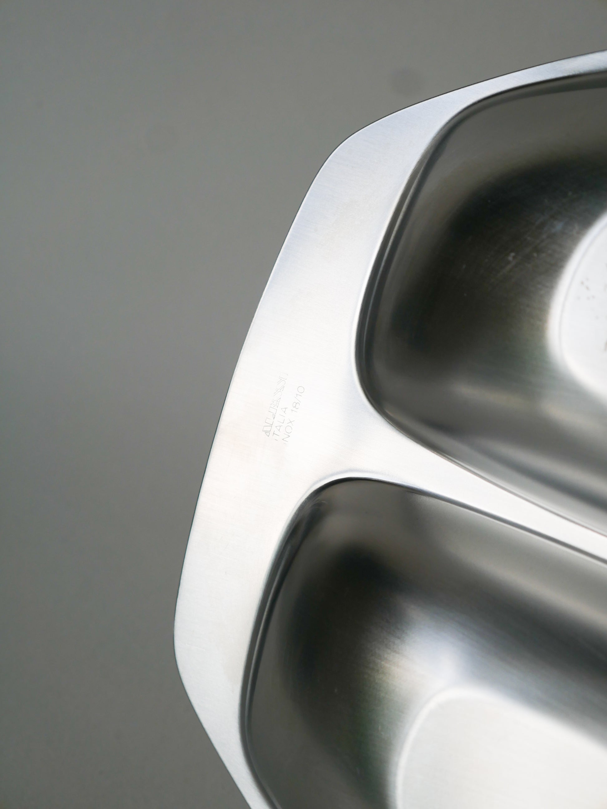 Superbe plat à compartiments en inox, Alessi, Design, 1980. En très bon état, de rares traces du temps. Envoi rapide et soigné. Possibilité d'envois groupés - plus économique et plus écologique ! Dimensions : 36.5 X 23.5 cm.