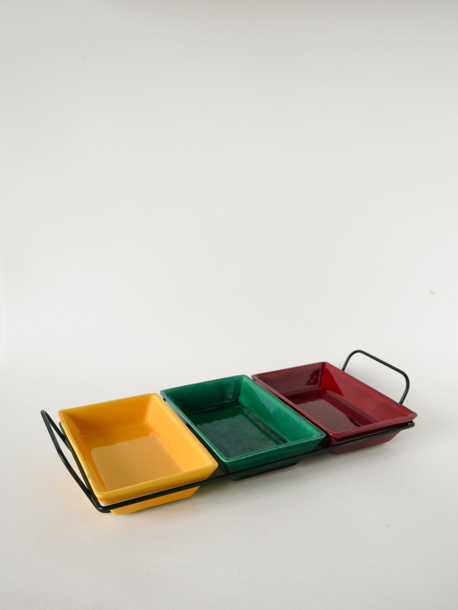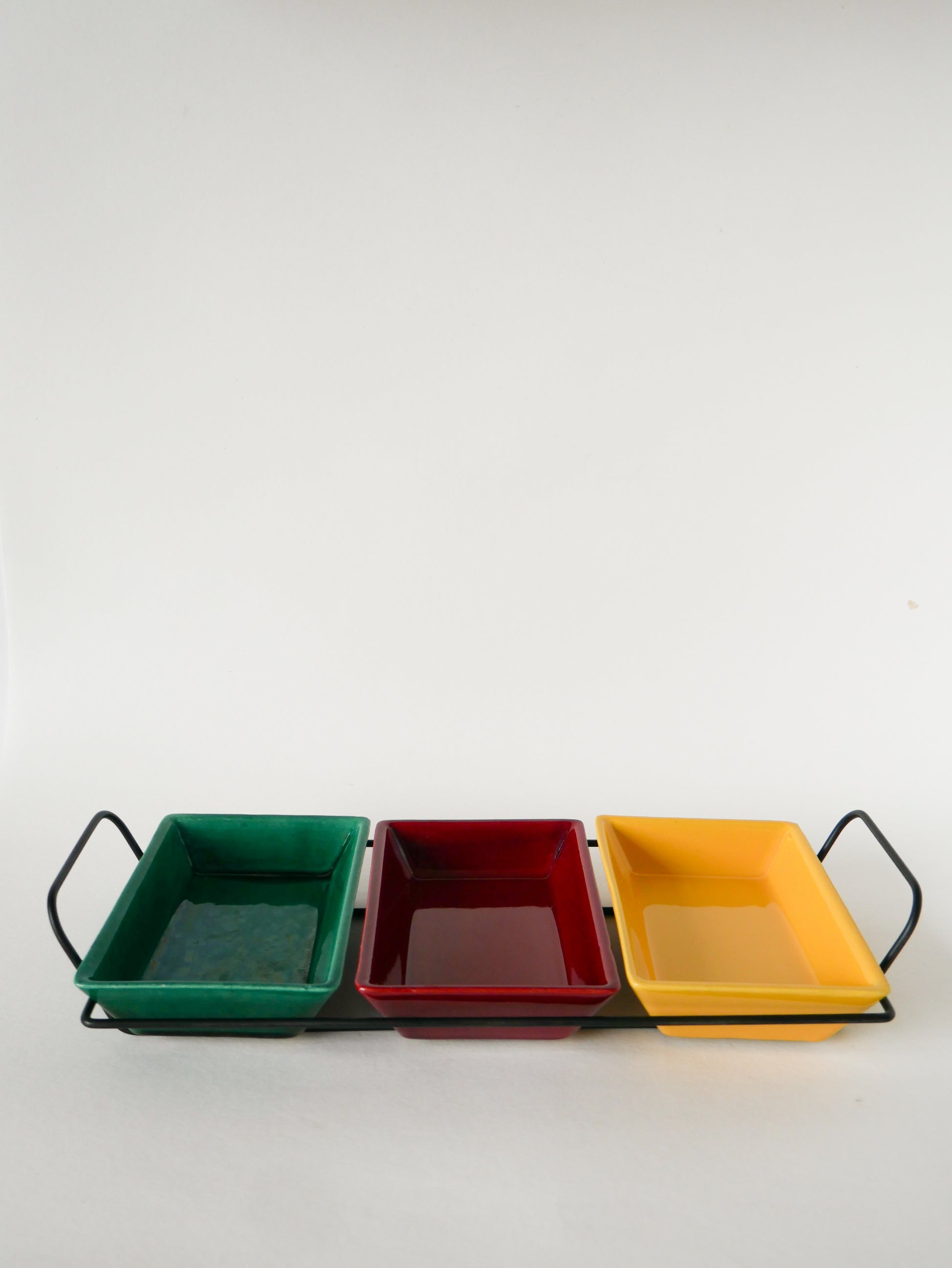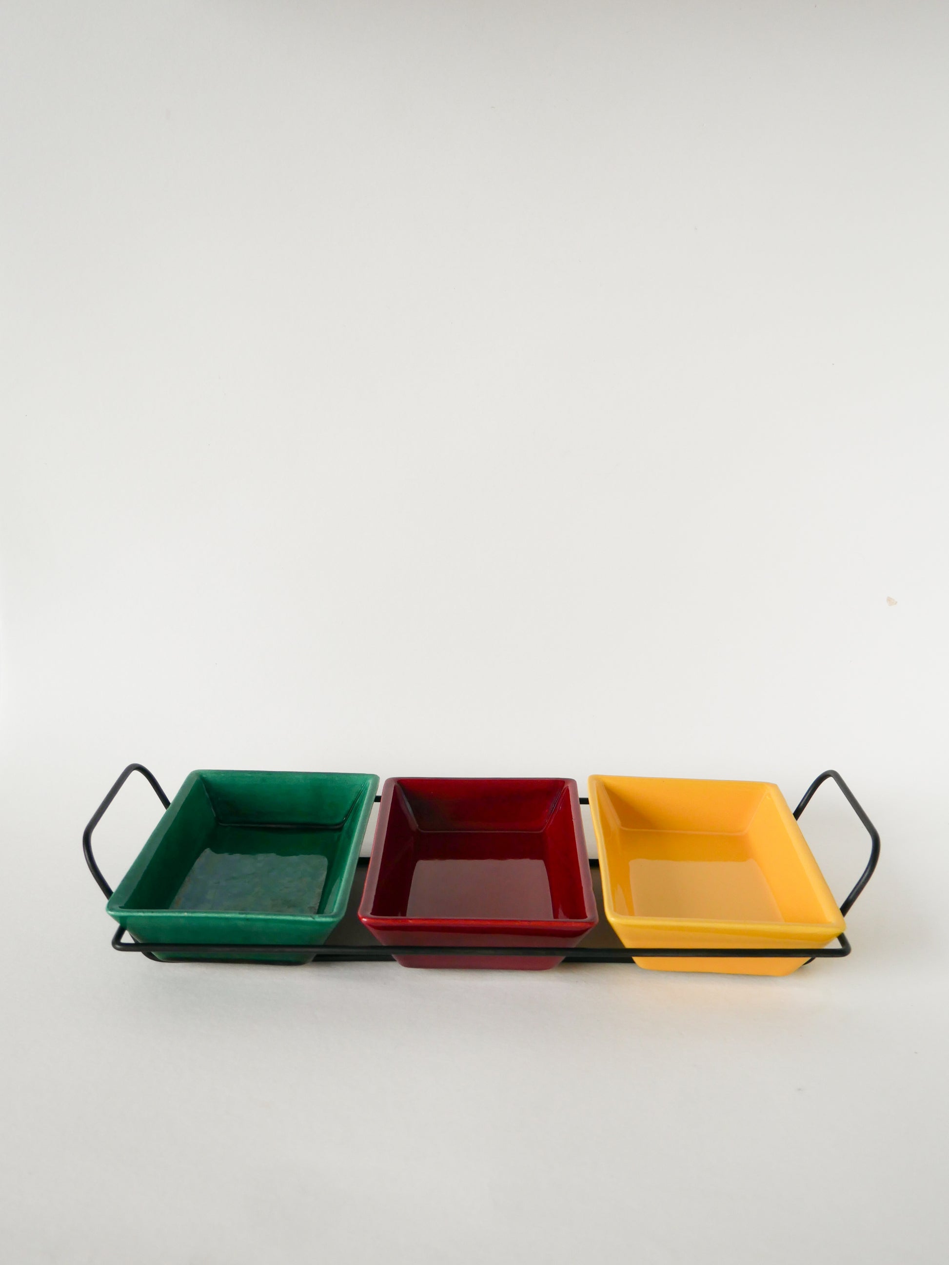 Joli plateau apéritif en fer forgé et ramequins en céramique, Vert, Jaune et Bordeaux, 1960. En très bon état, de rares traces du temps. Envoi rapide et soigné. Possibilité d'envois groupés - plus économique et plus écologique ! Dimensions : 39 X 18 cm.
