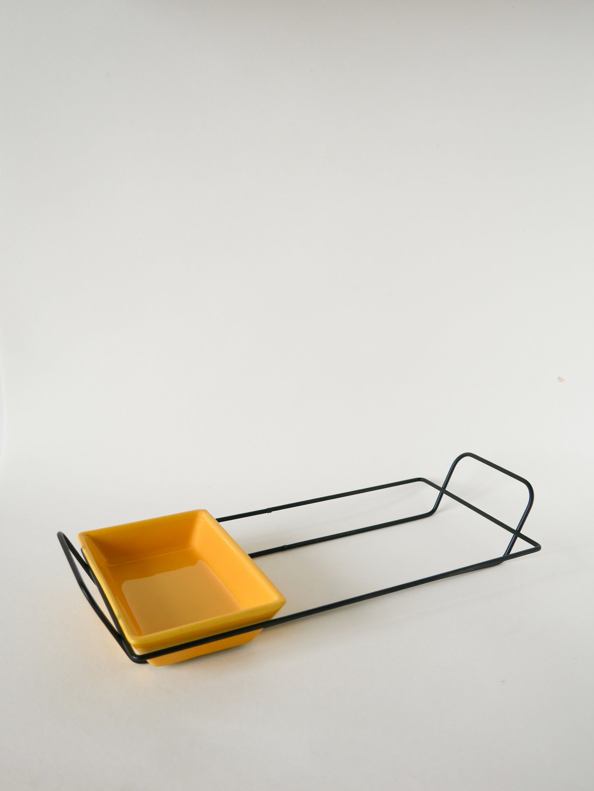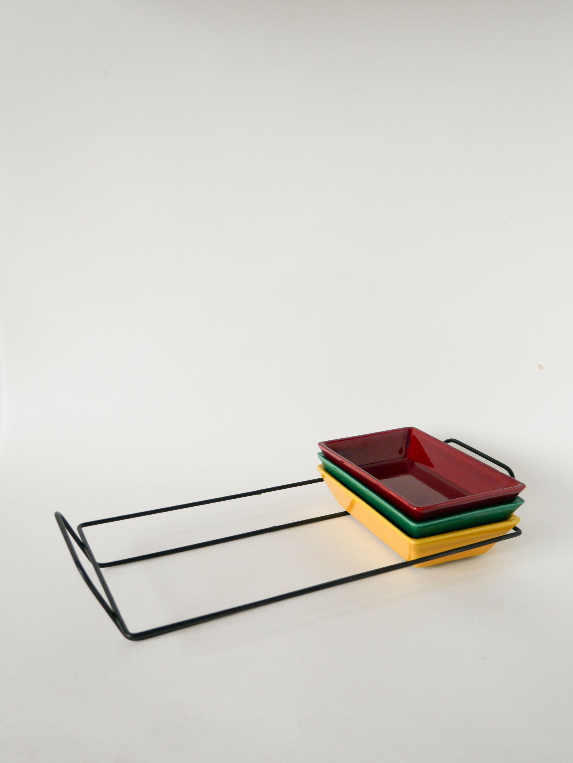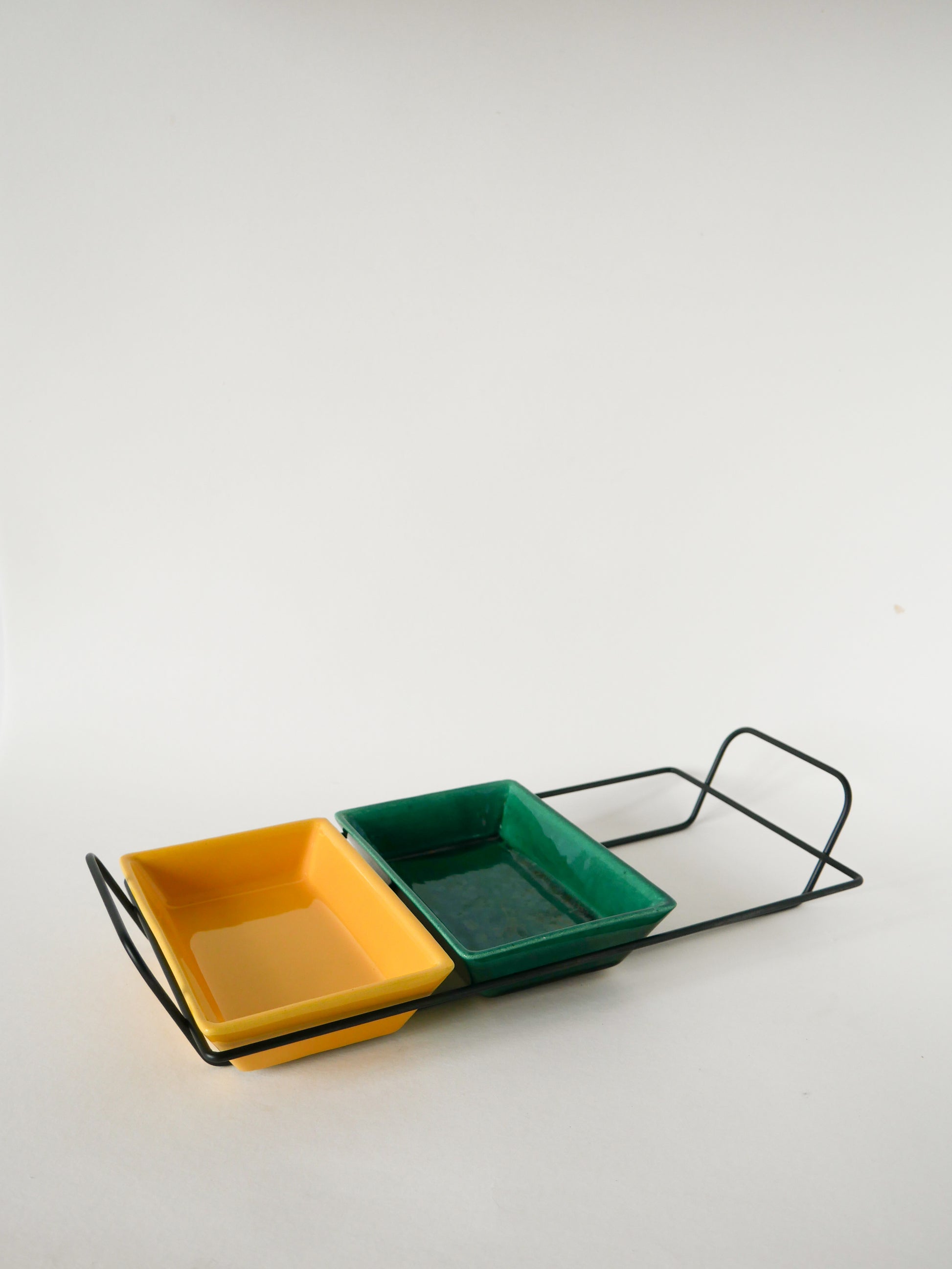 Joli plateau apéritif en fer forgé et ramequins en céramique, Vert, Jaune et Bordeaux, 1960. En très bon état, de rares traces du temps. Envoi rapide et soigné. Possibilité d'envois groupés - plus économique et plus écologique ! Dimensions : 39 X 18 cm.