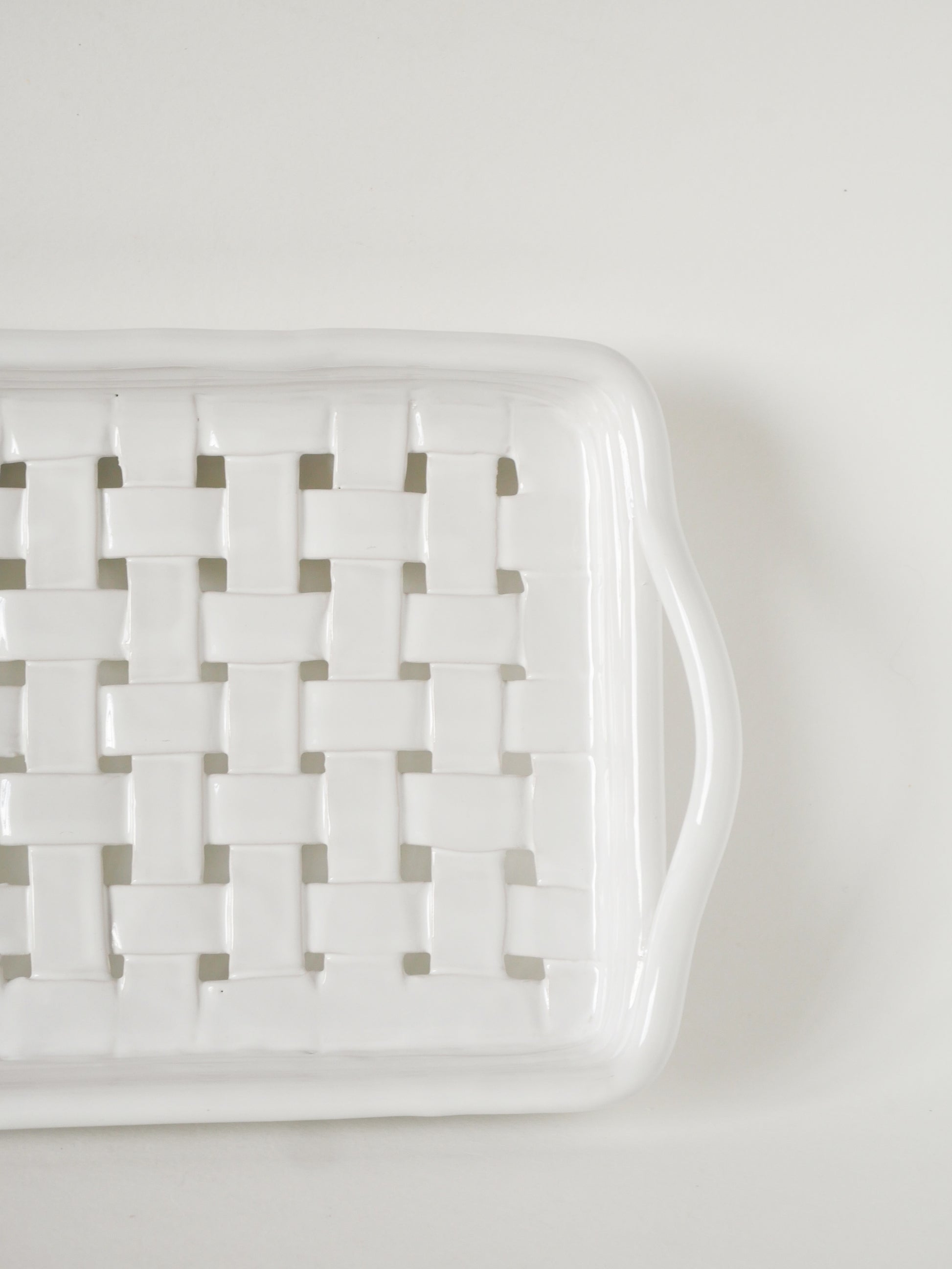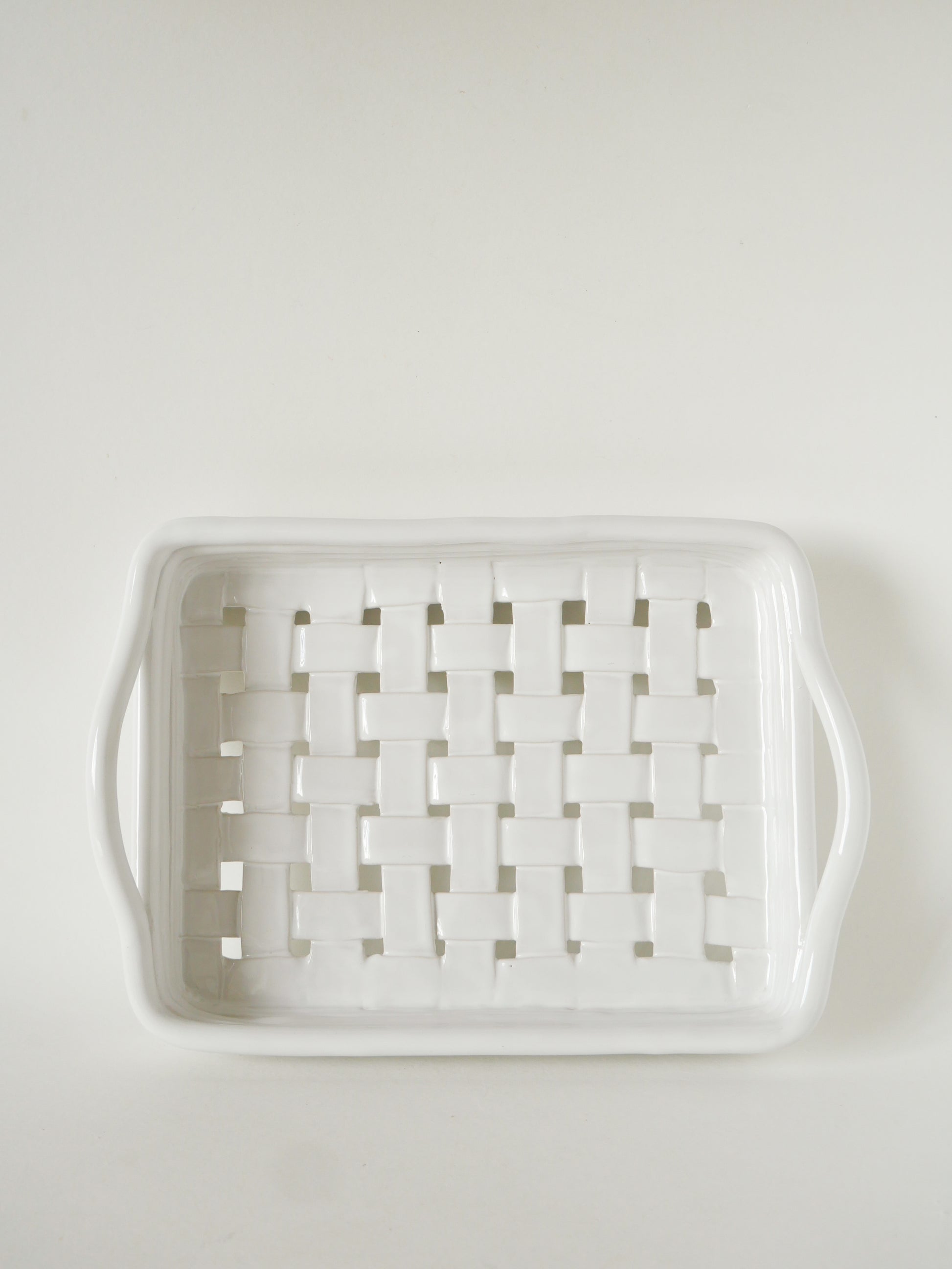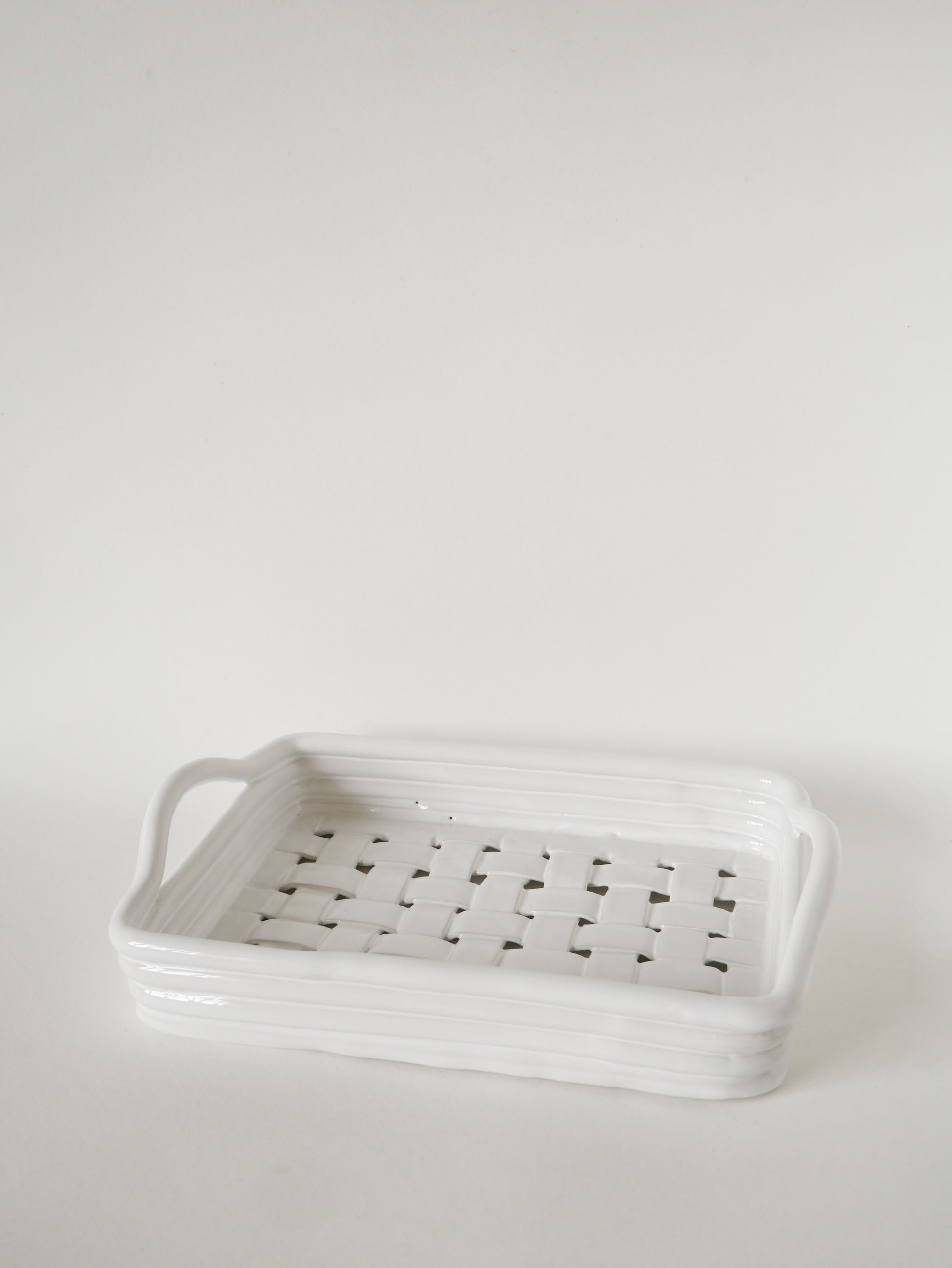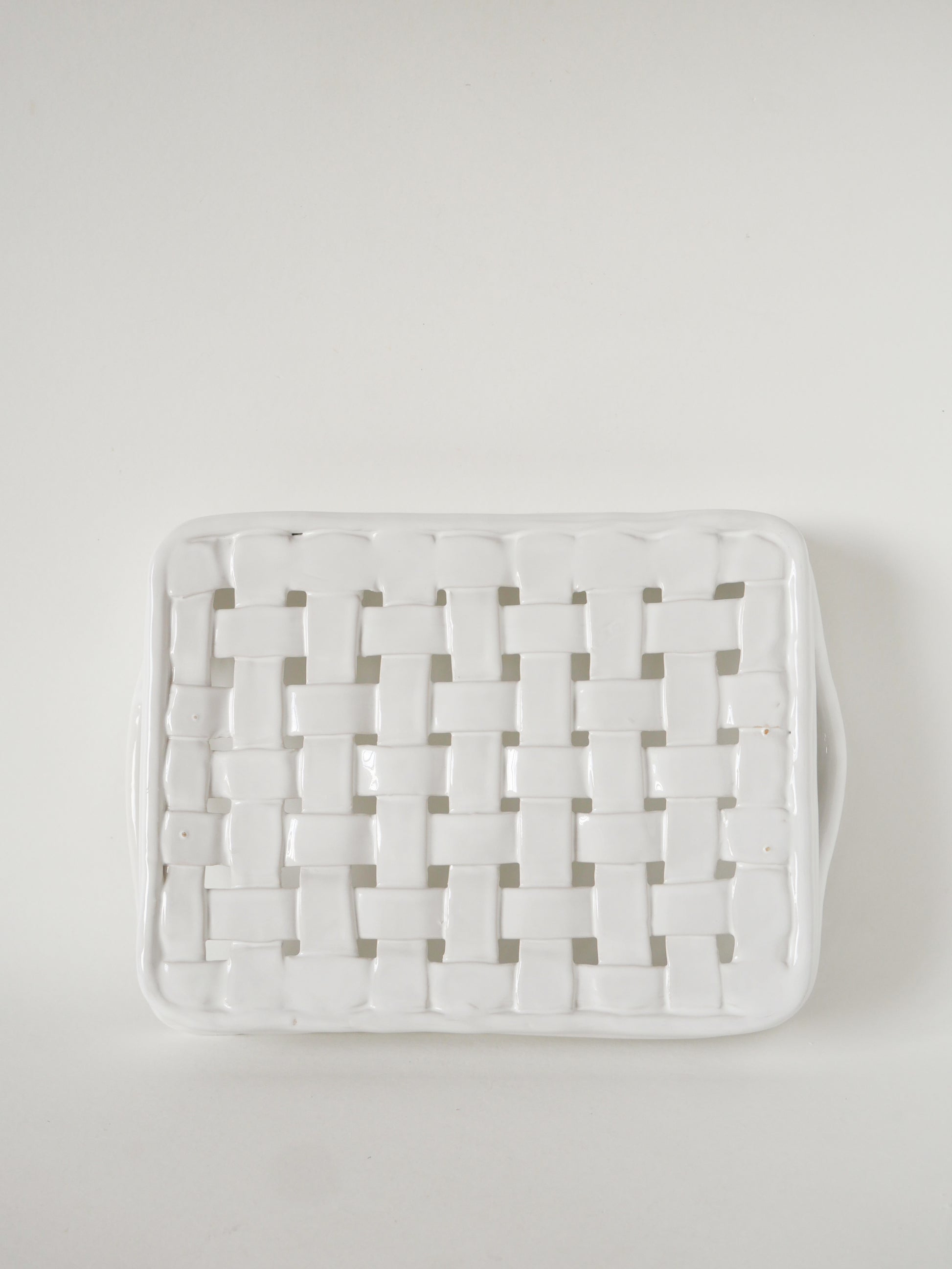 Superbe plateau en céramique tressée, Blanc, 1970. En très bon état, de rares traces du temps. Envoi rapide et soigné. Possibilité d'envois groupés - plus économique et plus écologique ! Dimensions : 30 X 23 cm.