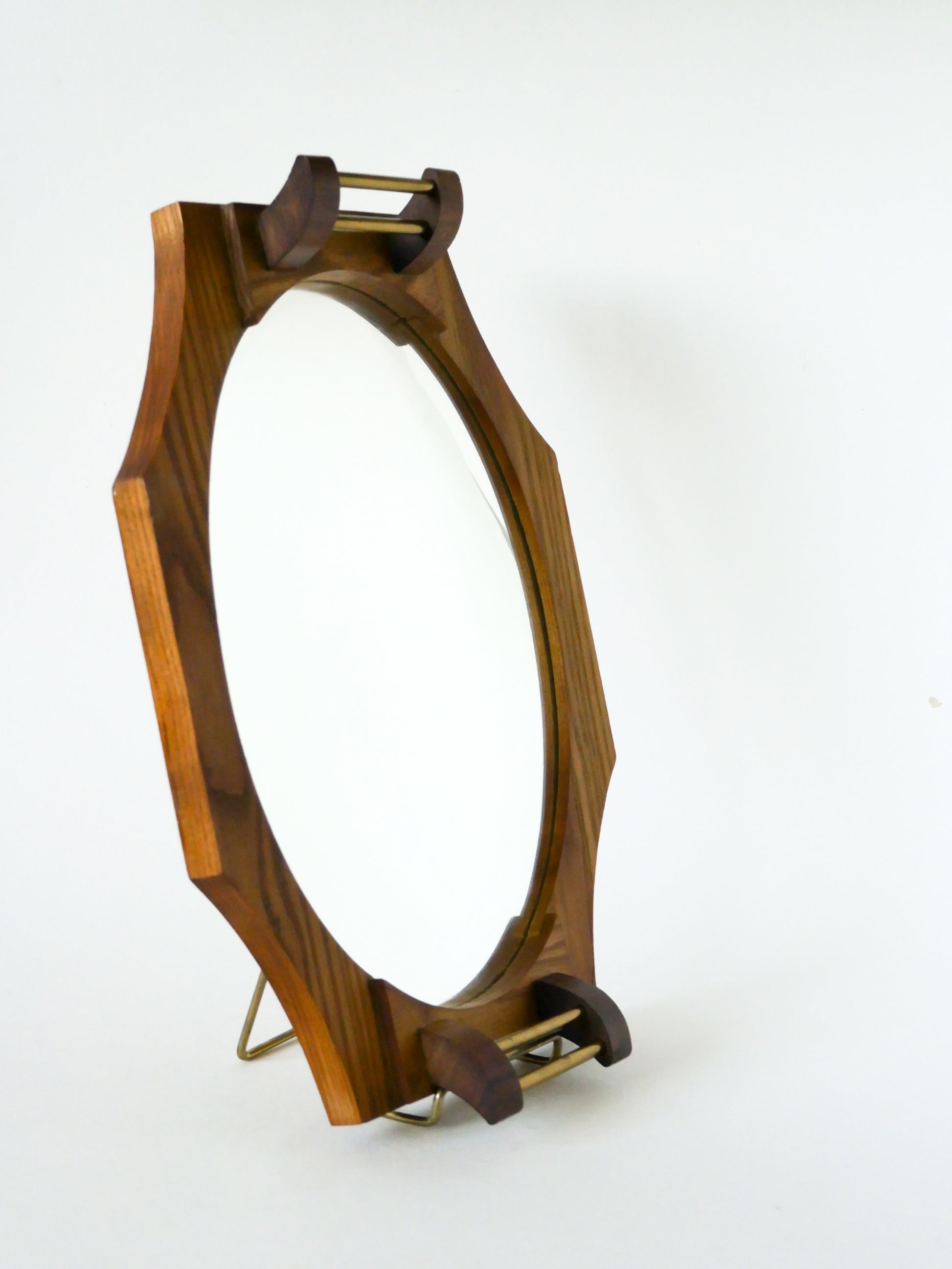 Plateau miroir en bois de hêtre, octogonal, poignées en laiton, 1950