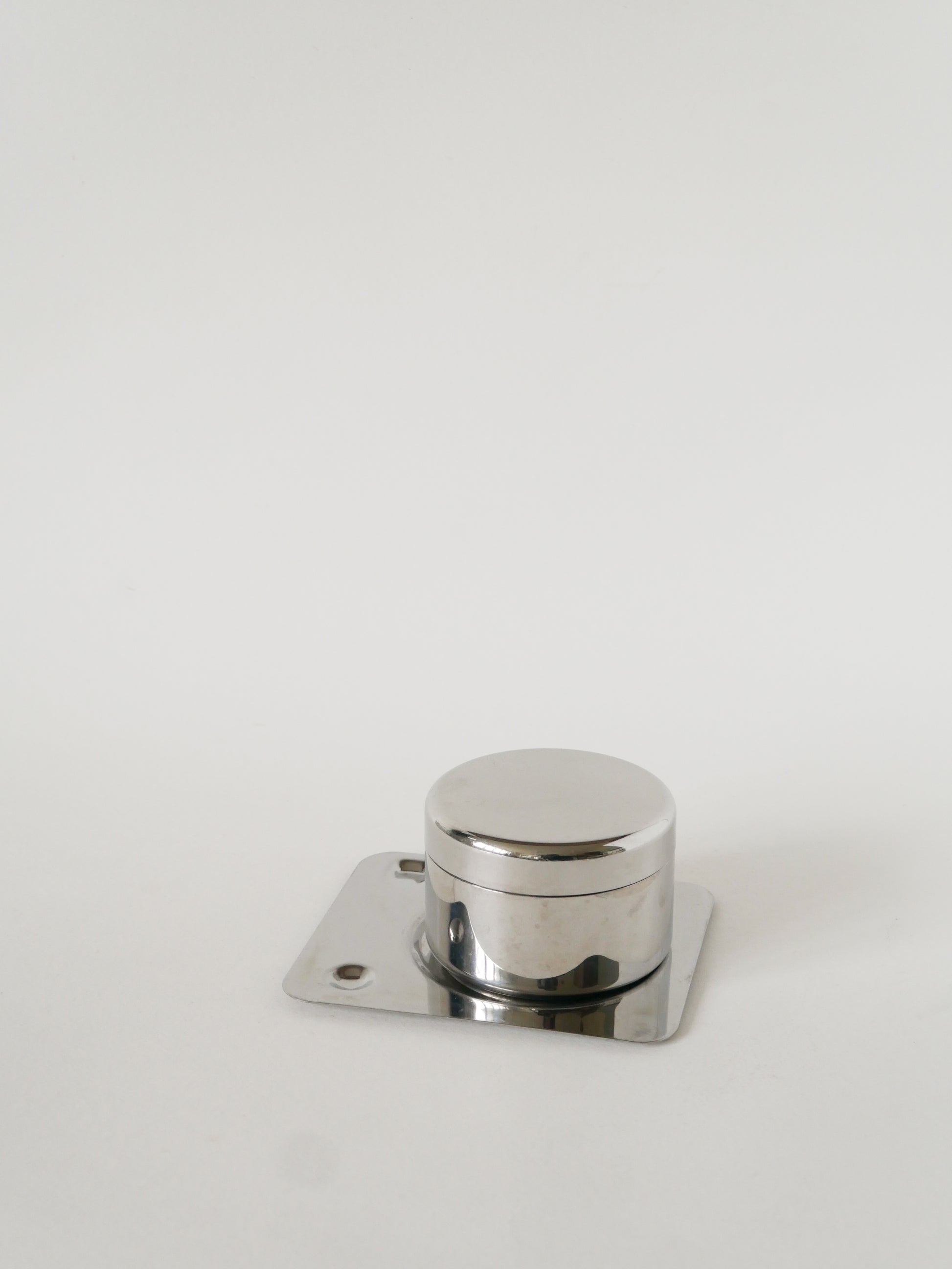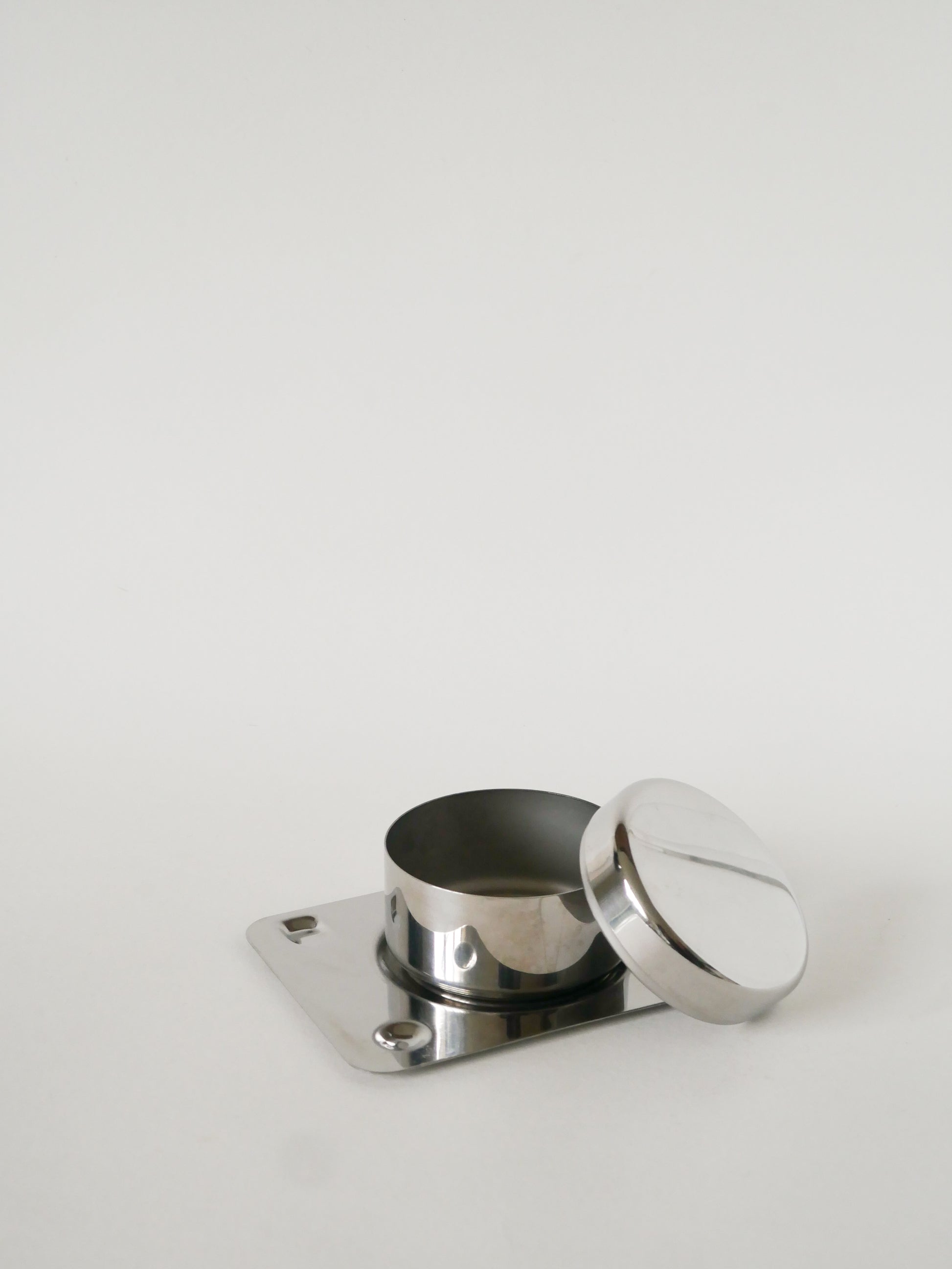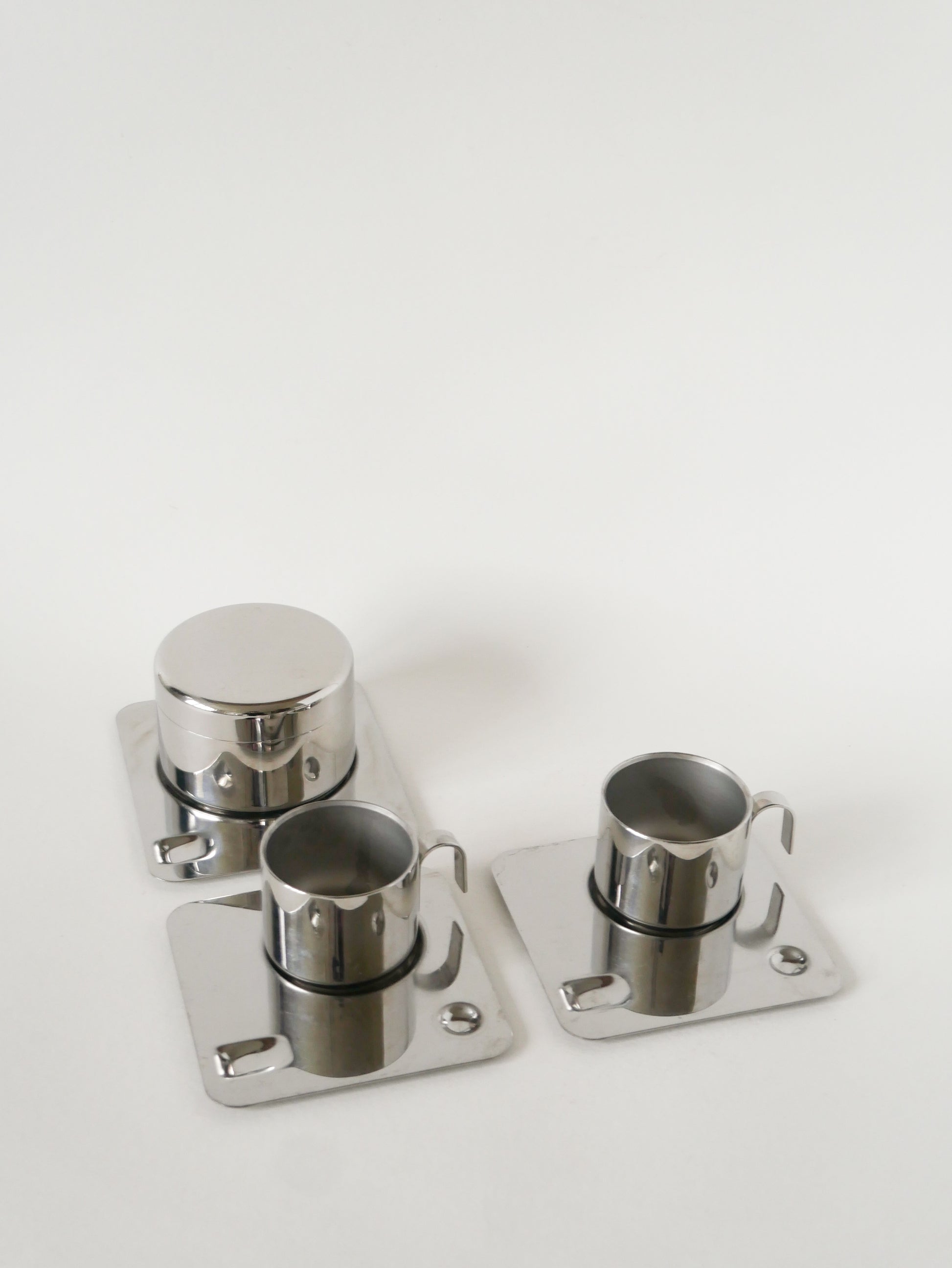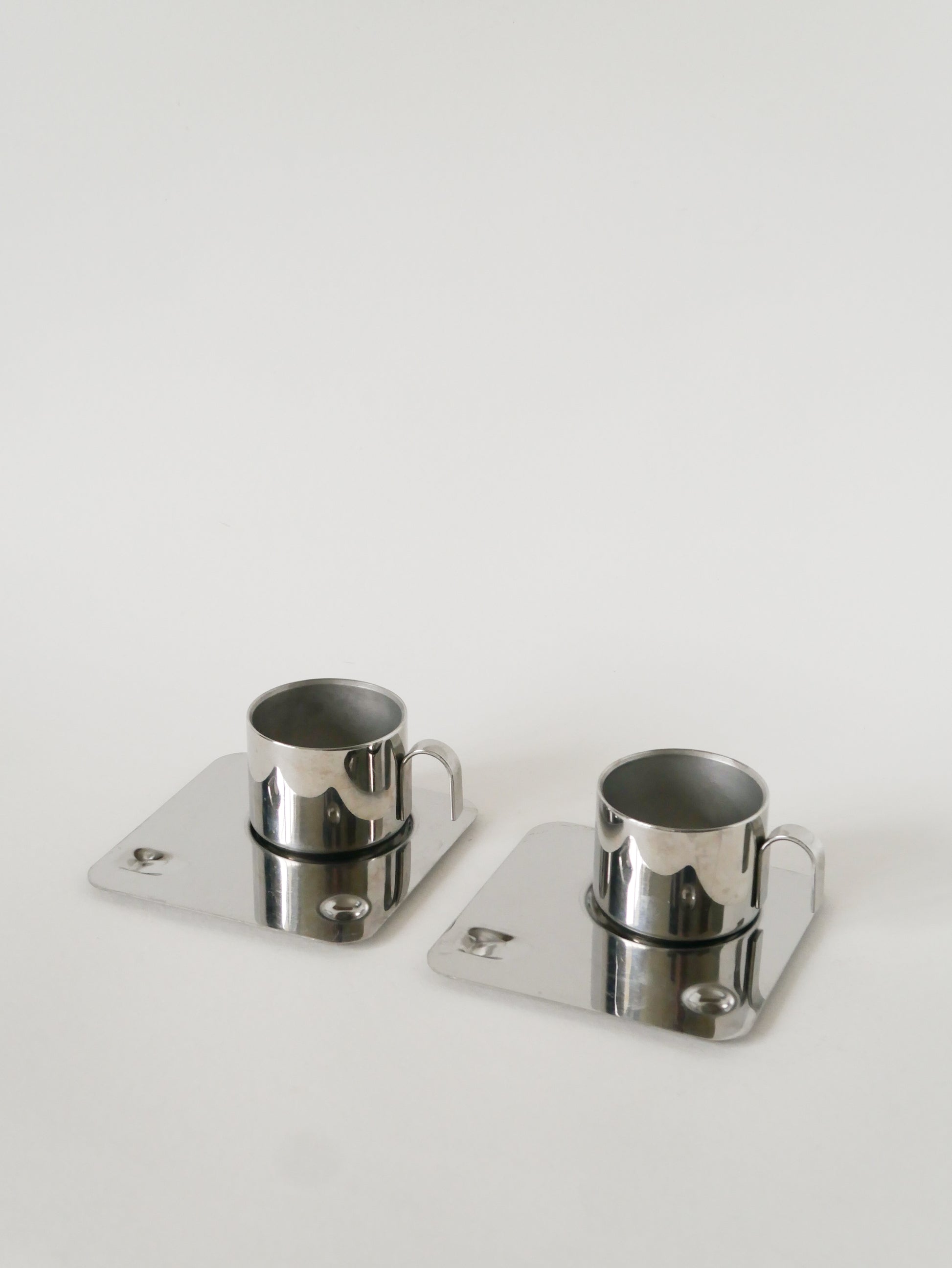 Superbe service à café en inox, Made in Italy, Design, 1970. En bon état général, à noter des traces du temps. Envoi rapide et soigné. Possibilité d'envois groupés - plus économique et plus écologique ! Dimensions : 5 X 6 cm ; sous-tasse : 12 cm.