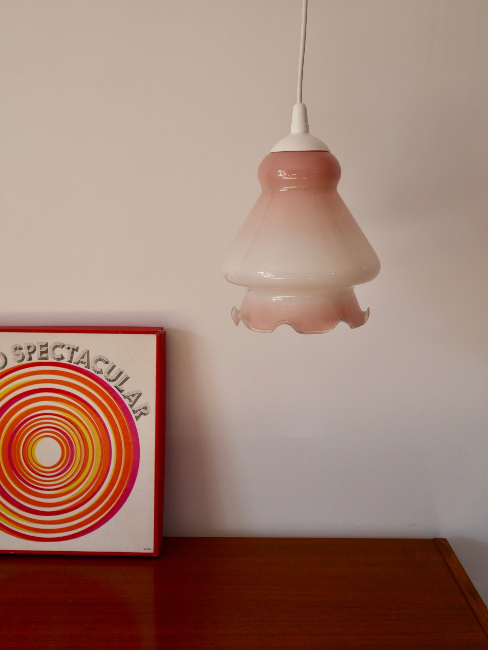 Superbe suspension en opaline dentelée rose poudré années 60. En excellent état. Dimensions : 21 X 16 X 16 cm.