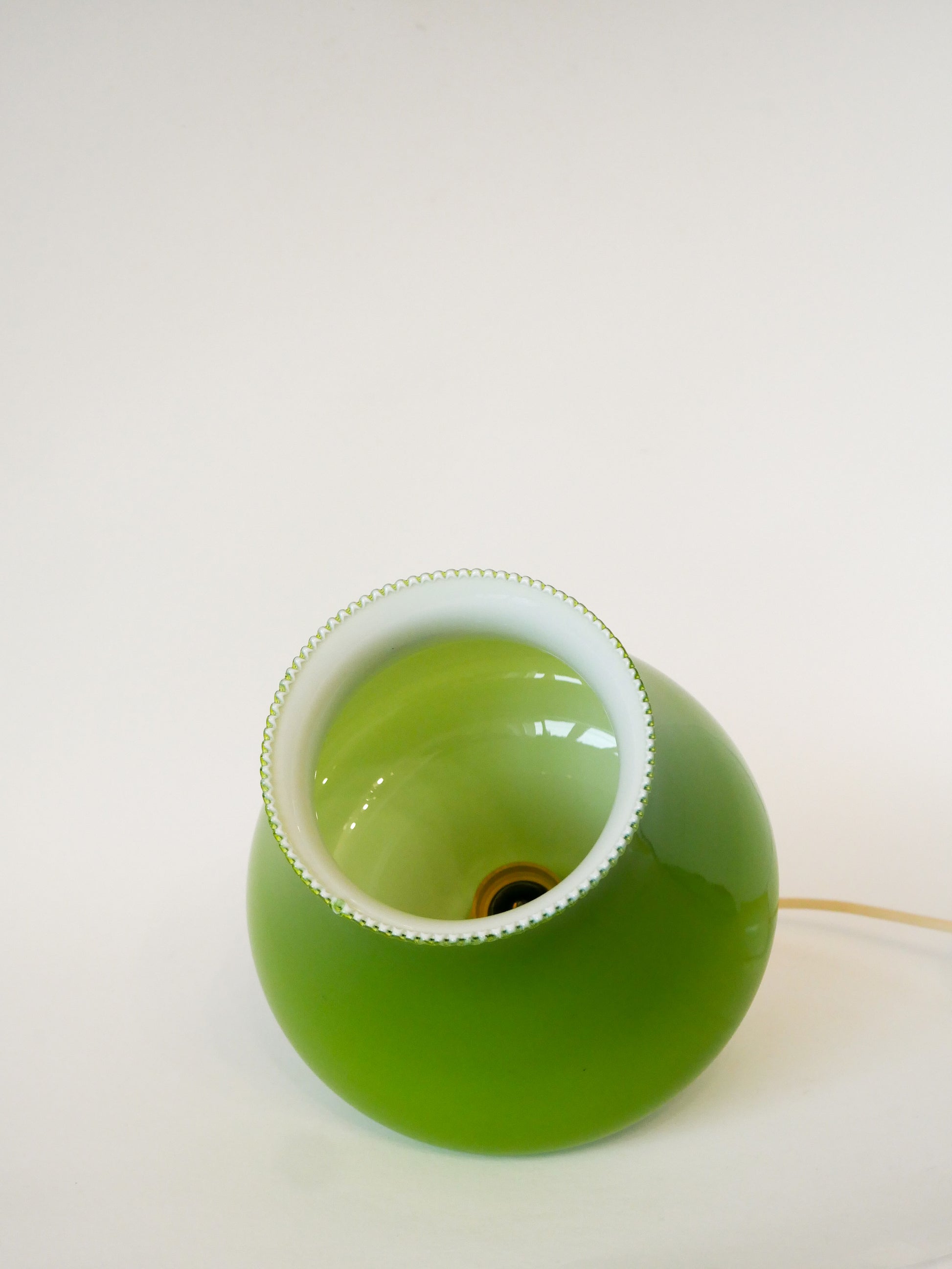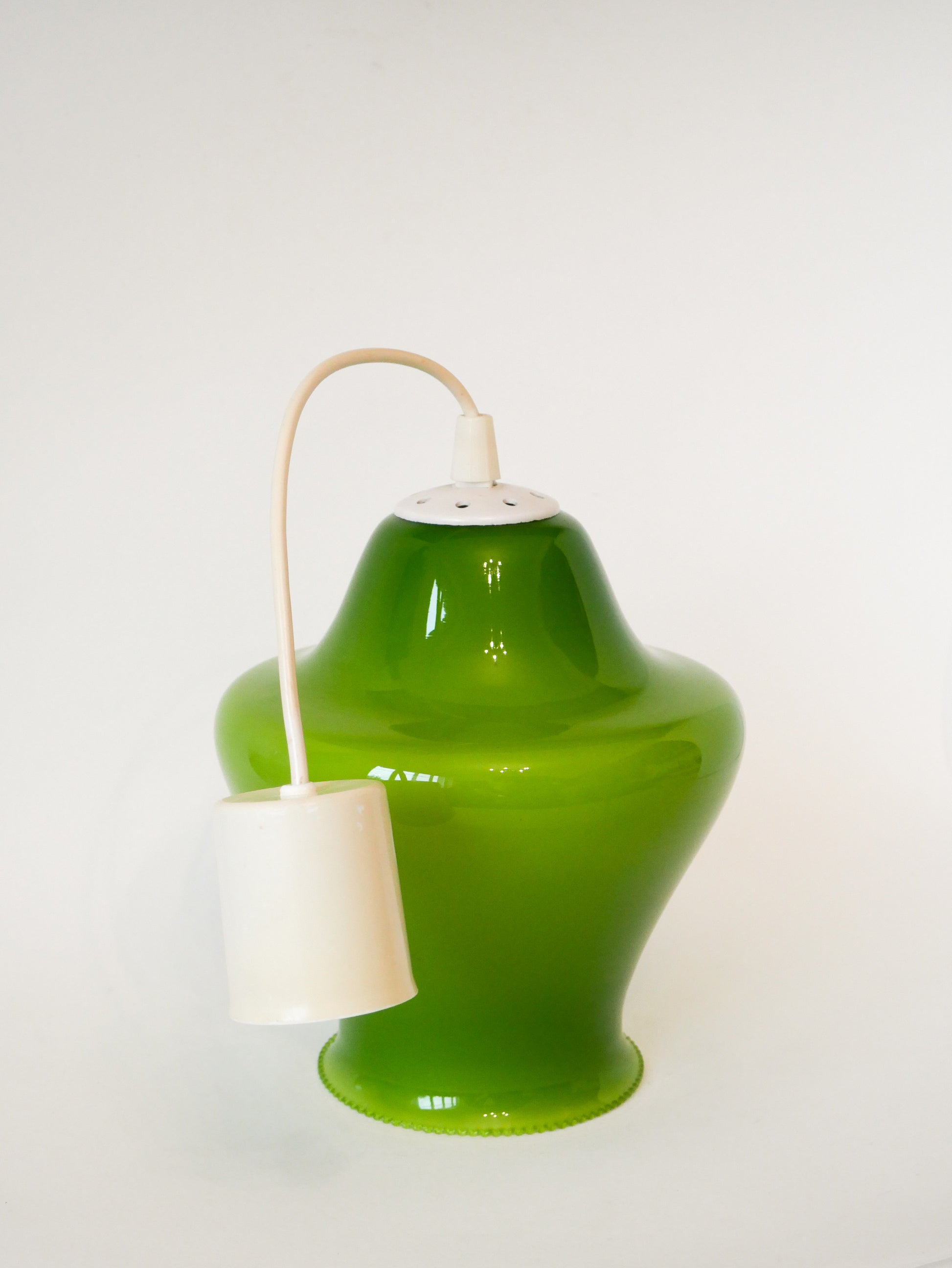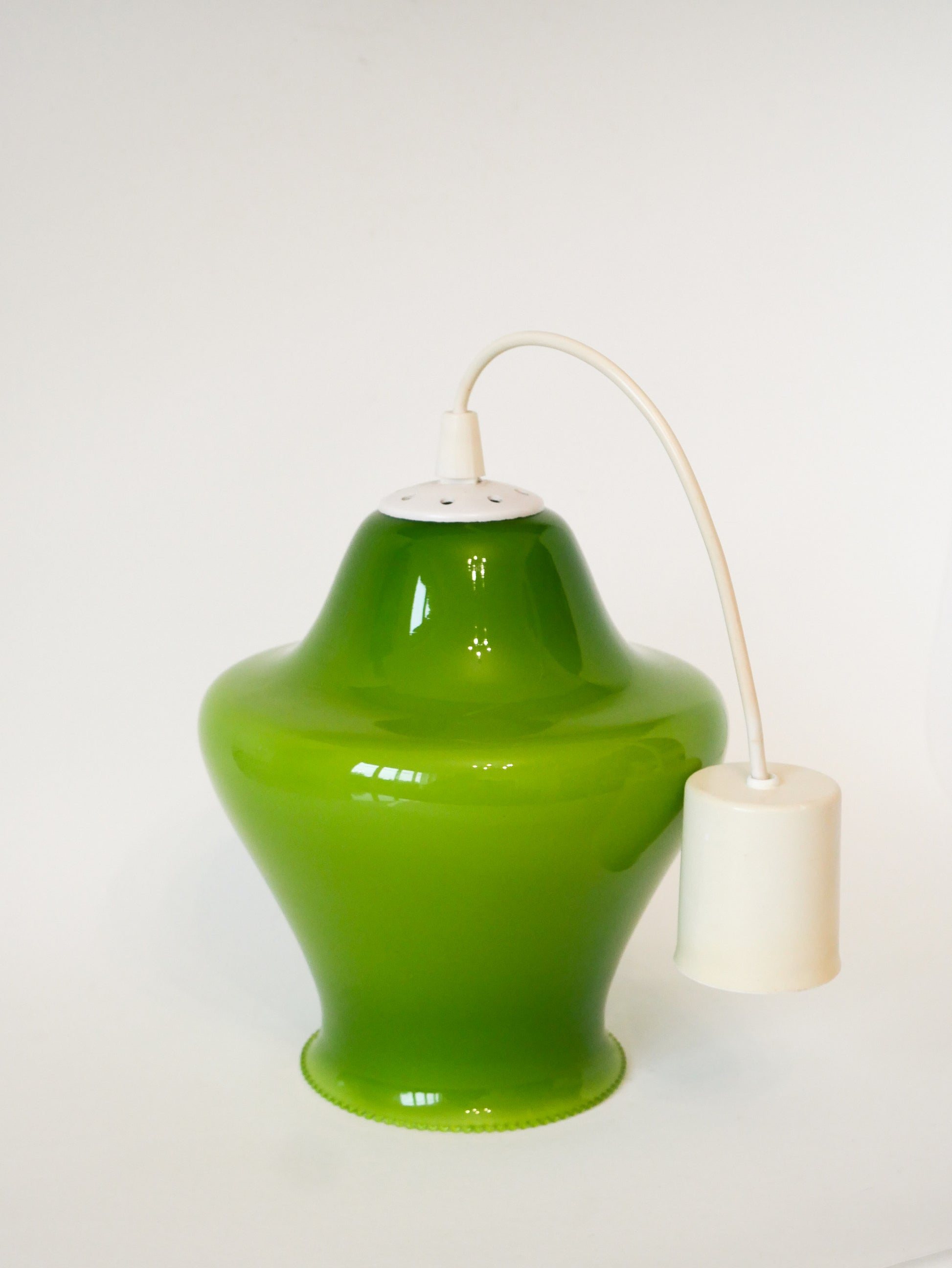 Magnifique suspension en opaline, Vert Pomme, Mushroom, Design, 1970. En excellent état. Envoi rapide et soigné. Possibilité d'envois groupés - plus économique et plus écologique ! Dimensions : 25 X 23 cm ; longueur de fil : 34 cm.