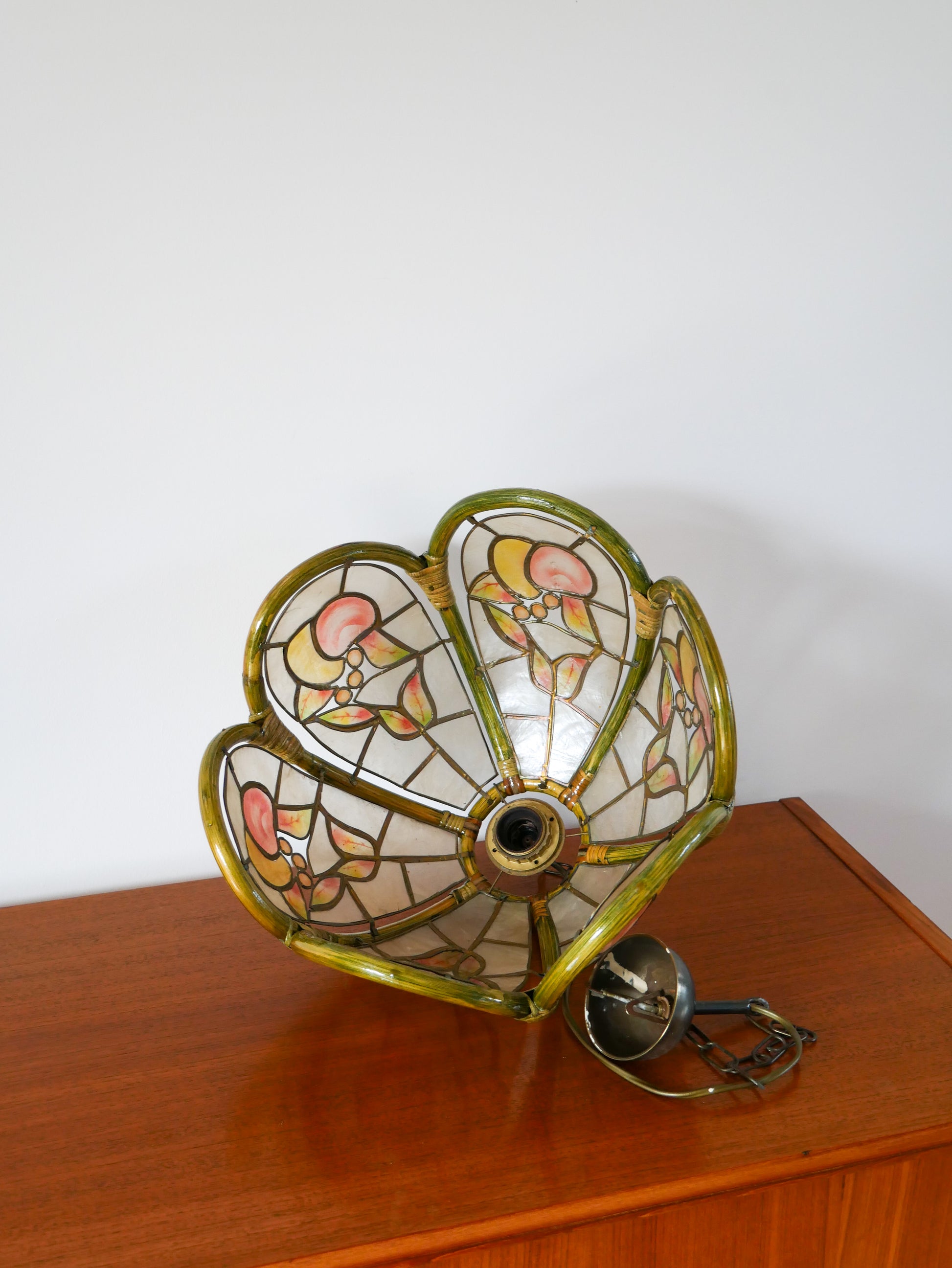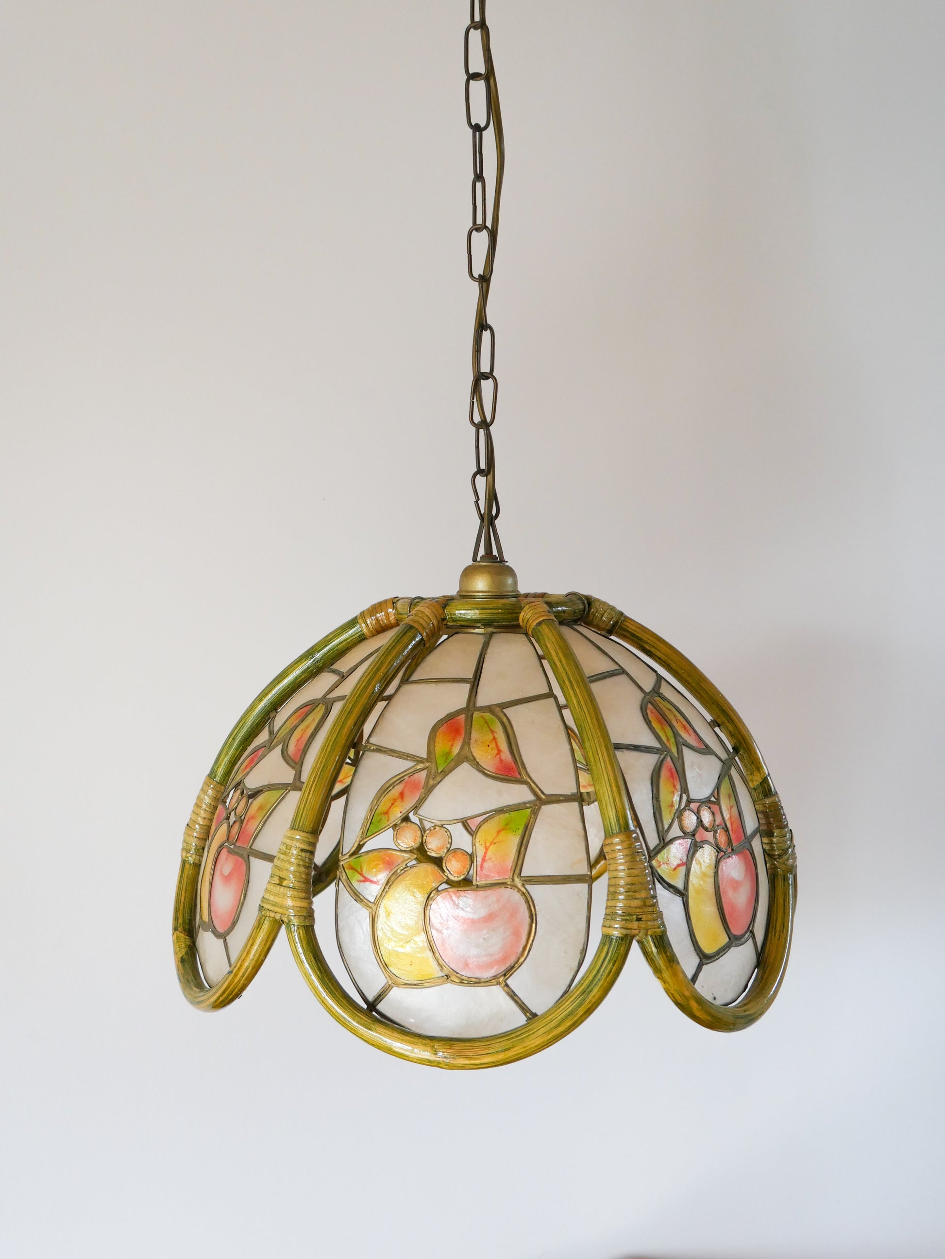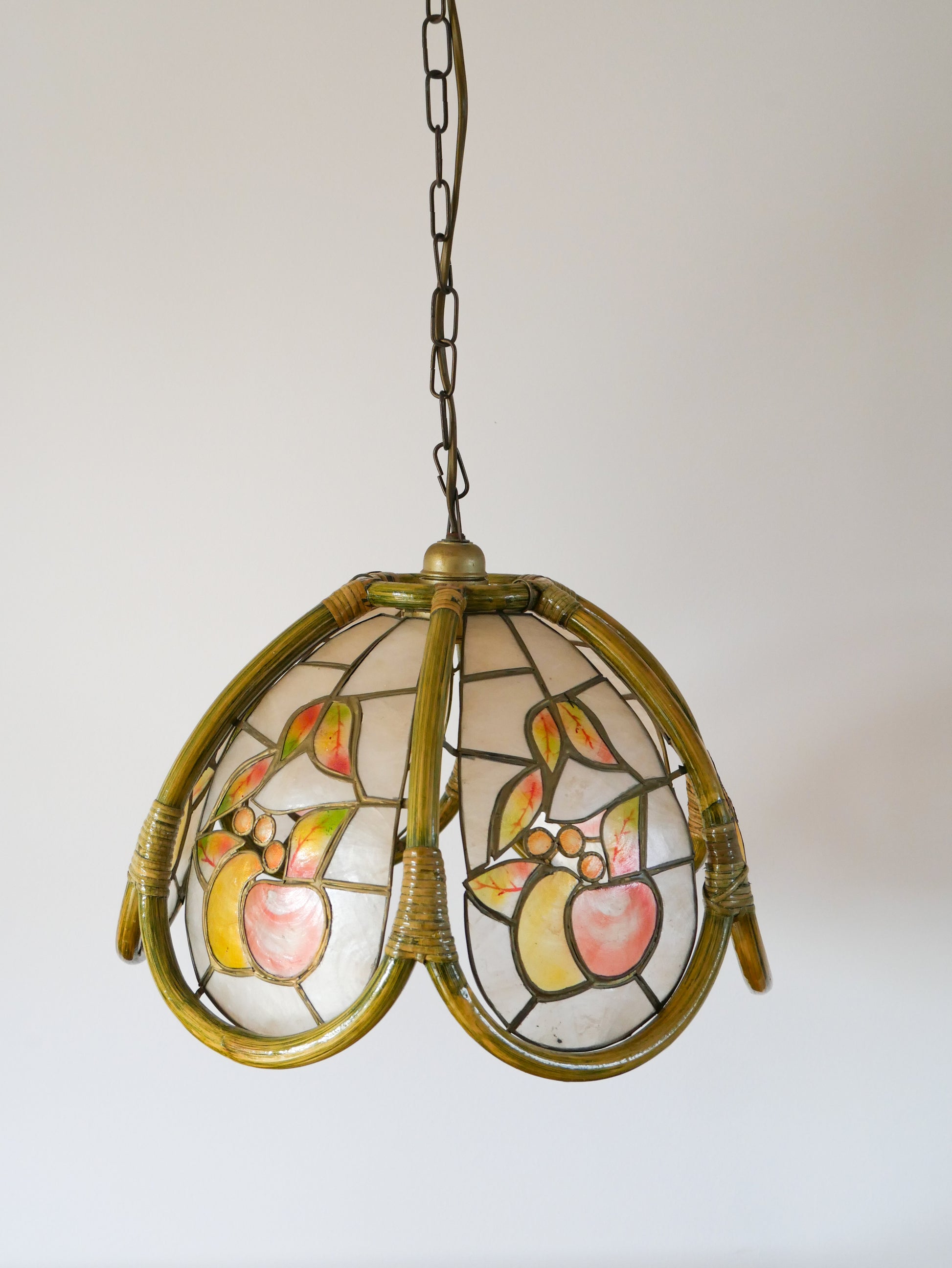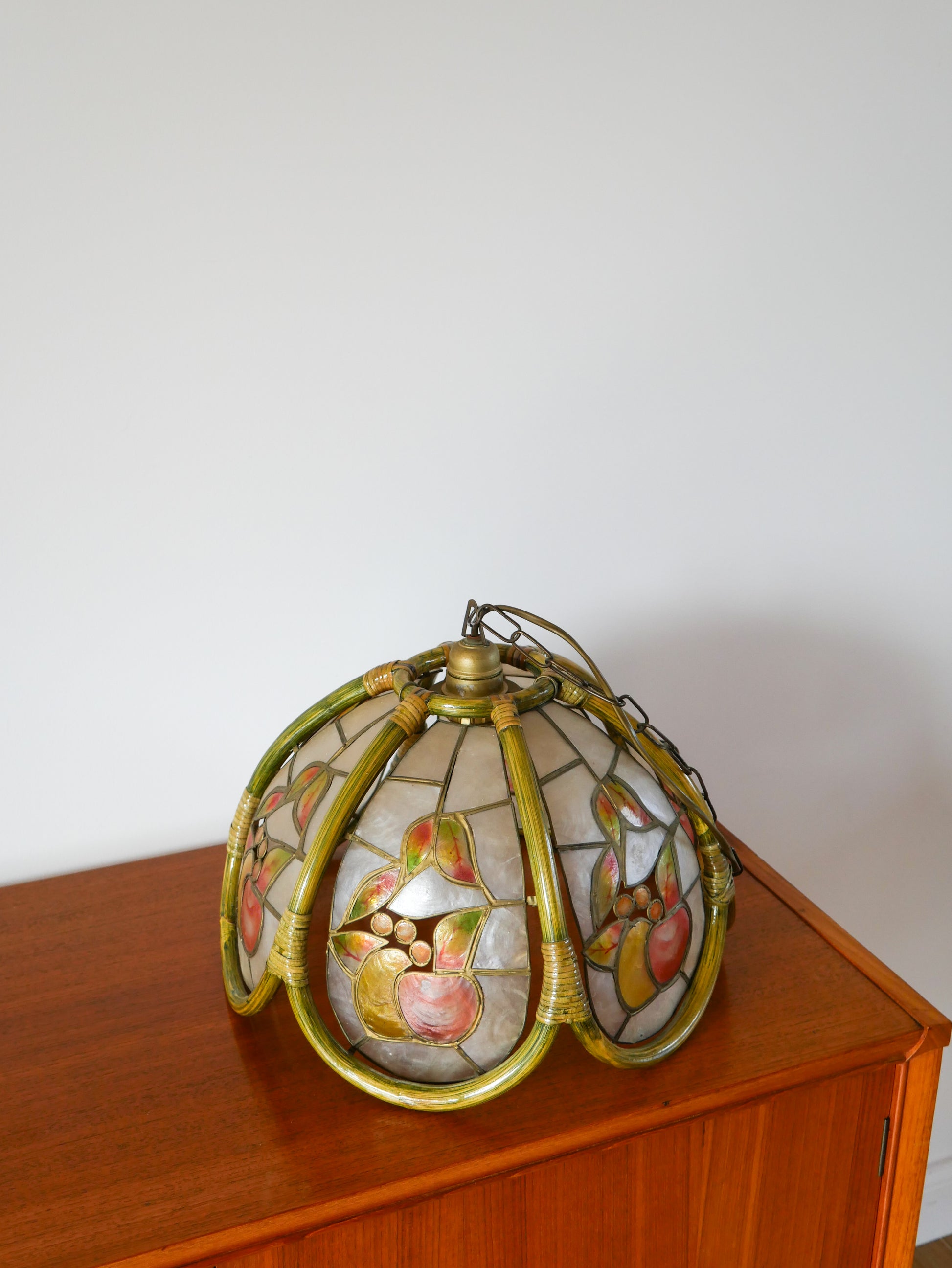 Superbe suspension en rotin, bambou, nacre et laiton 1970. En excellent état. Envoi rapide et soigné. Possibilité d'envois groupés - plus économique et plus écologique ! Dimensions : 37 X 23 cm.