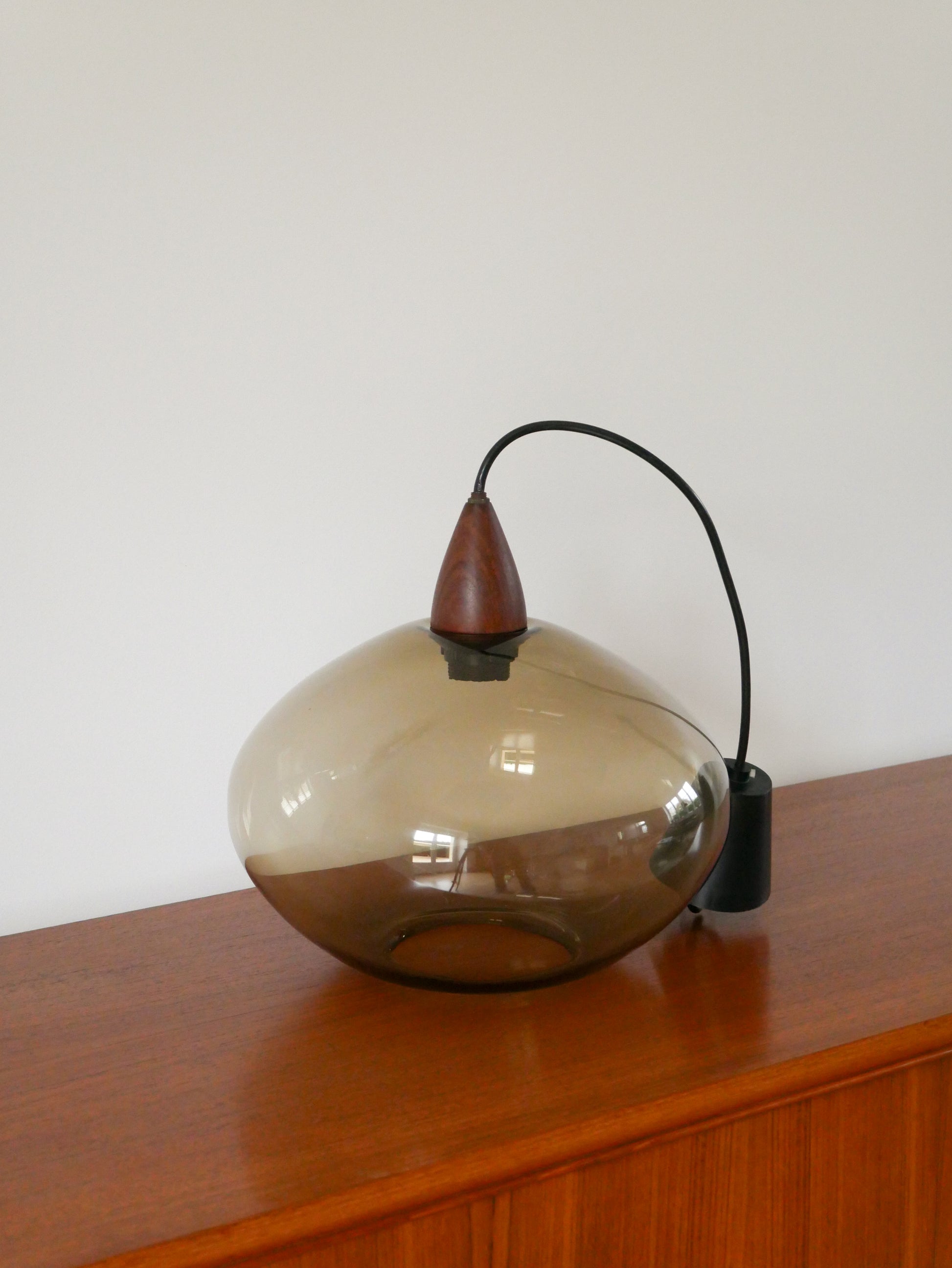 Suspension en verre fumé et teck, Design, 1970 - 33 X 33 cm