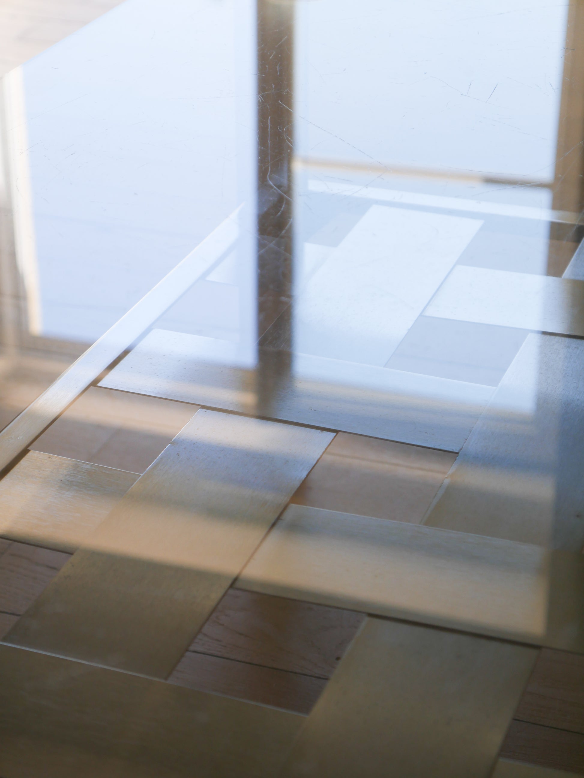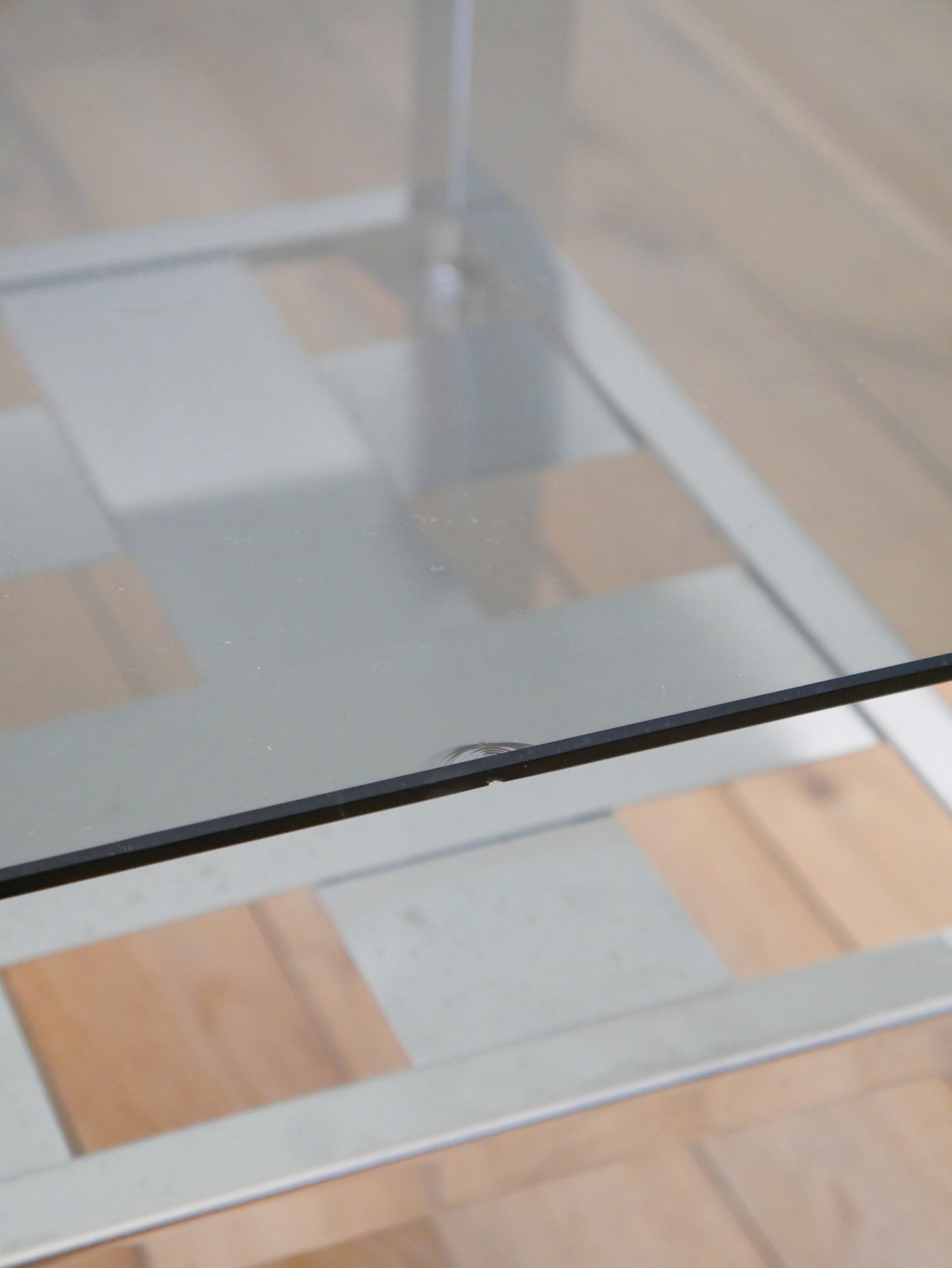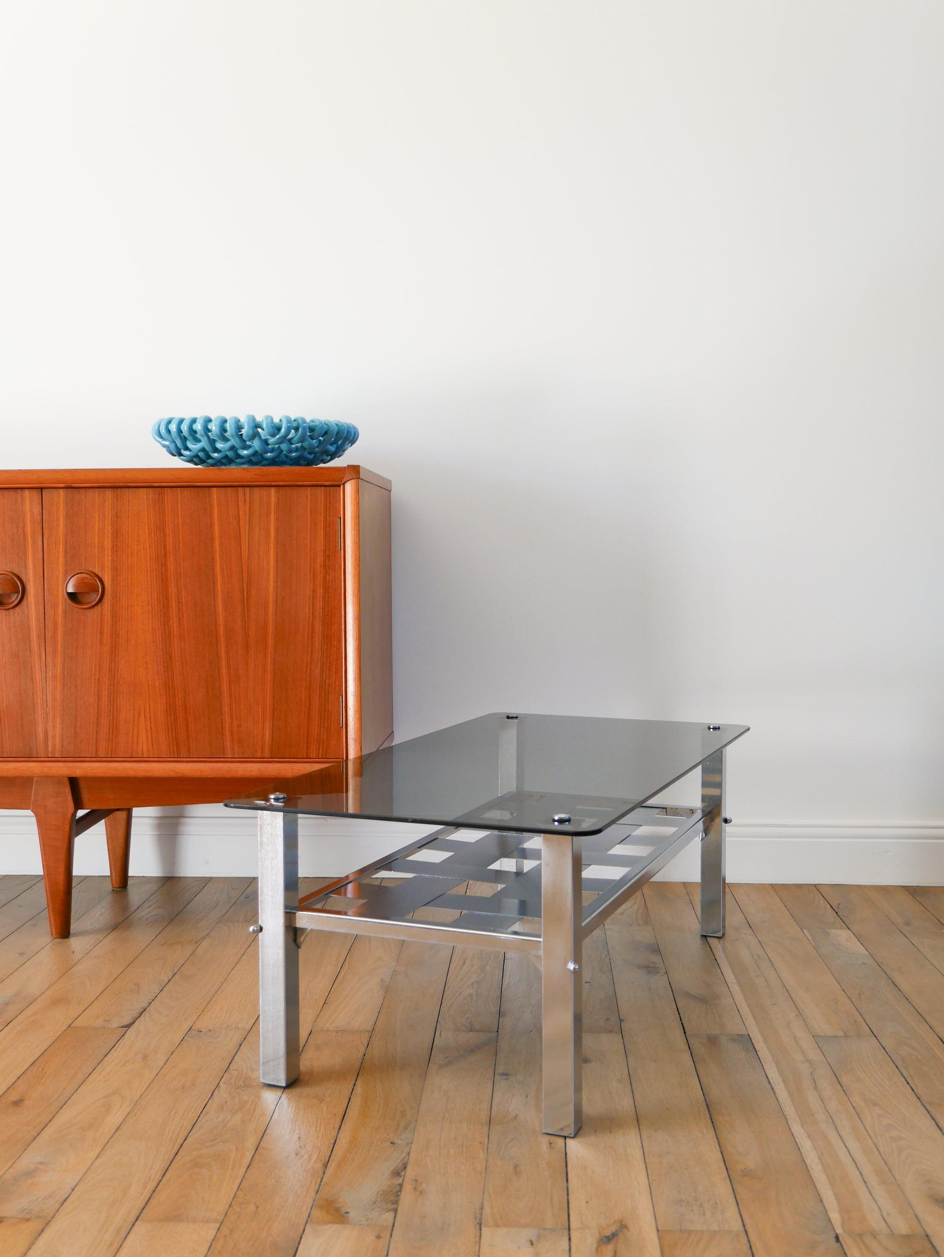 Table basse en aluminium et verre fumé, plateau rectangulaire, Design, 1980