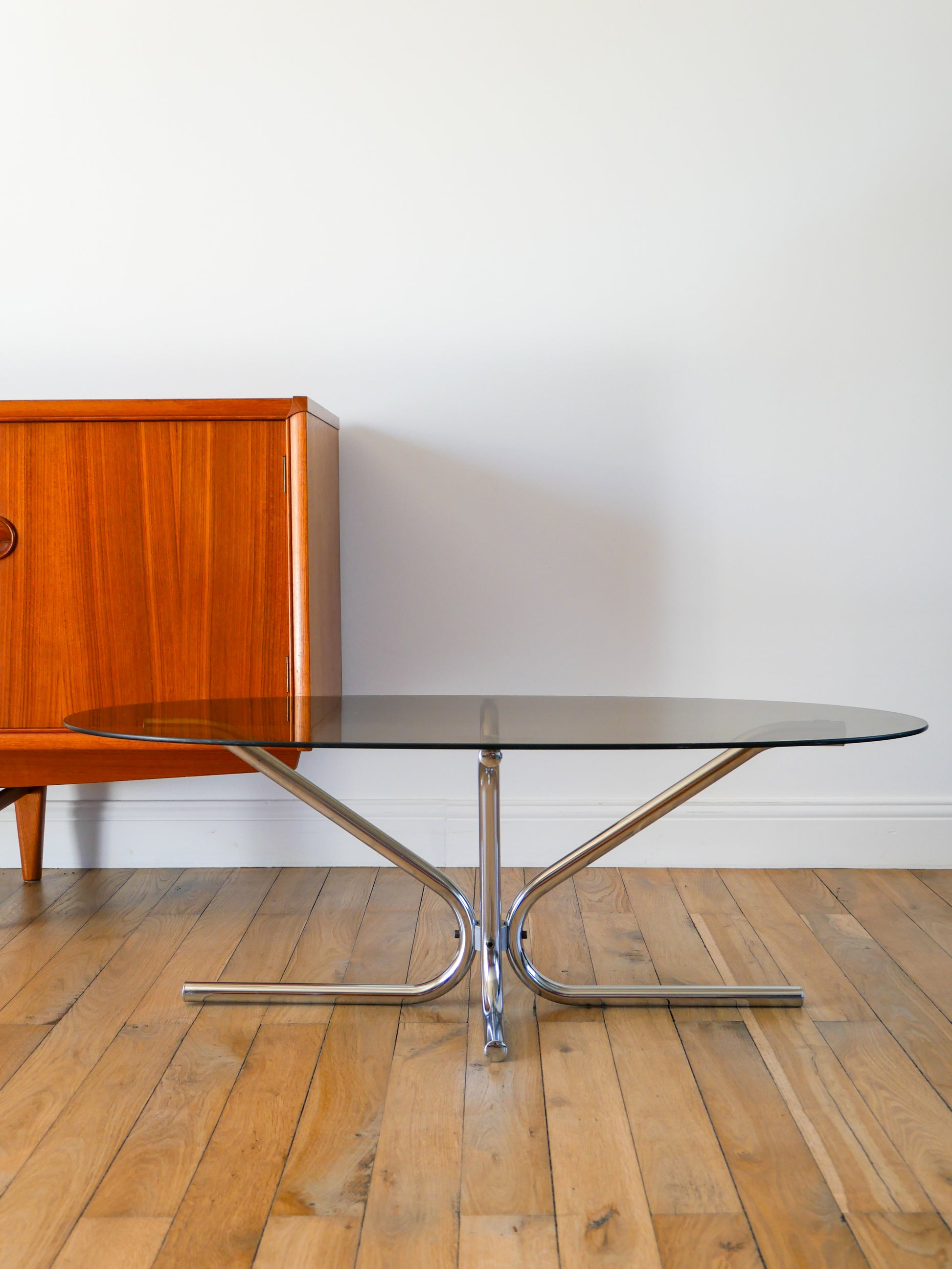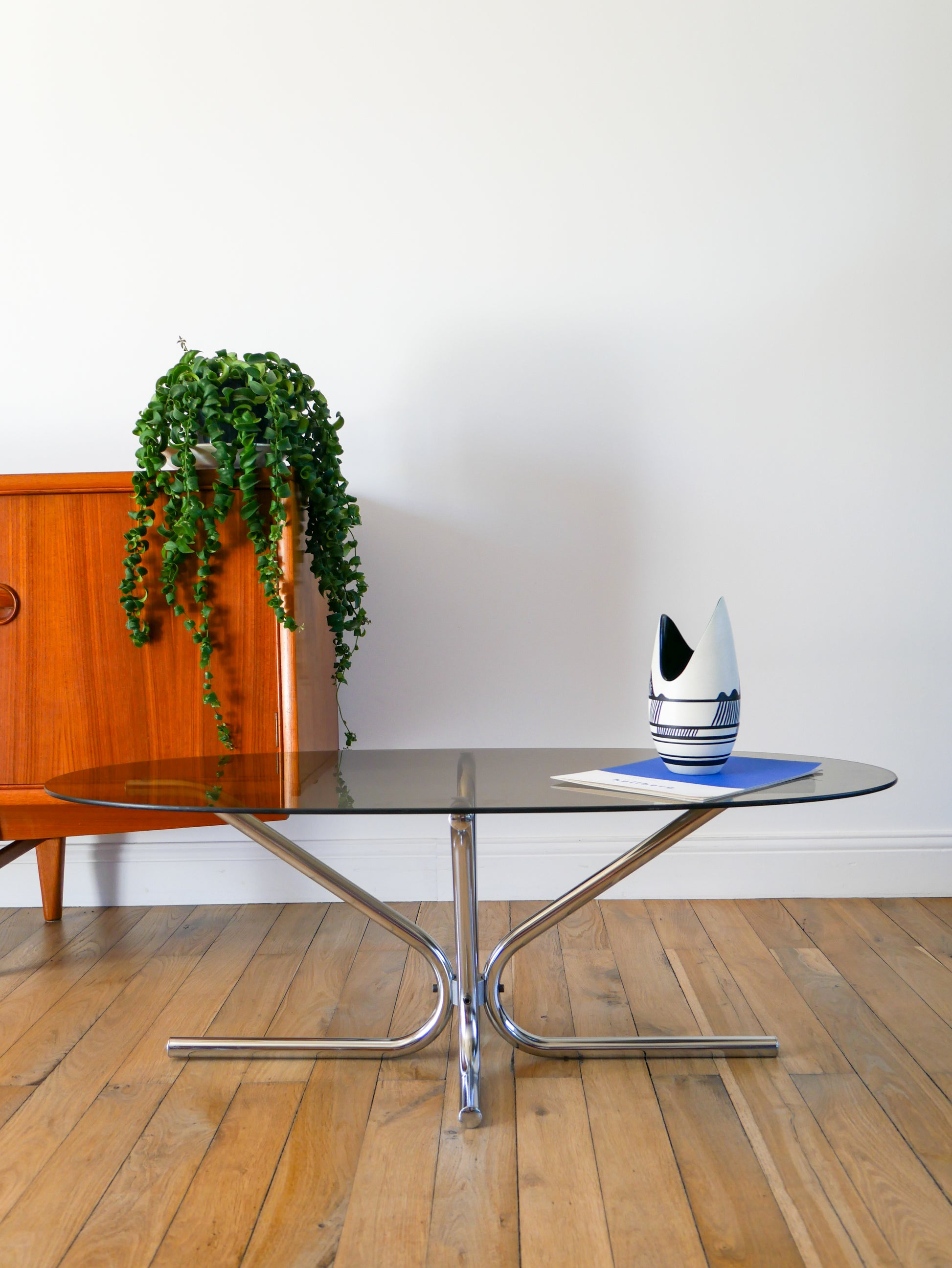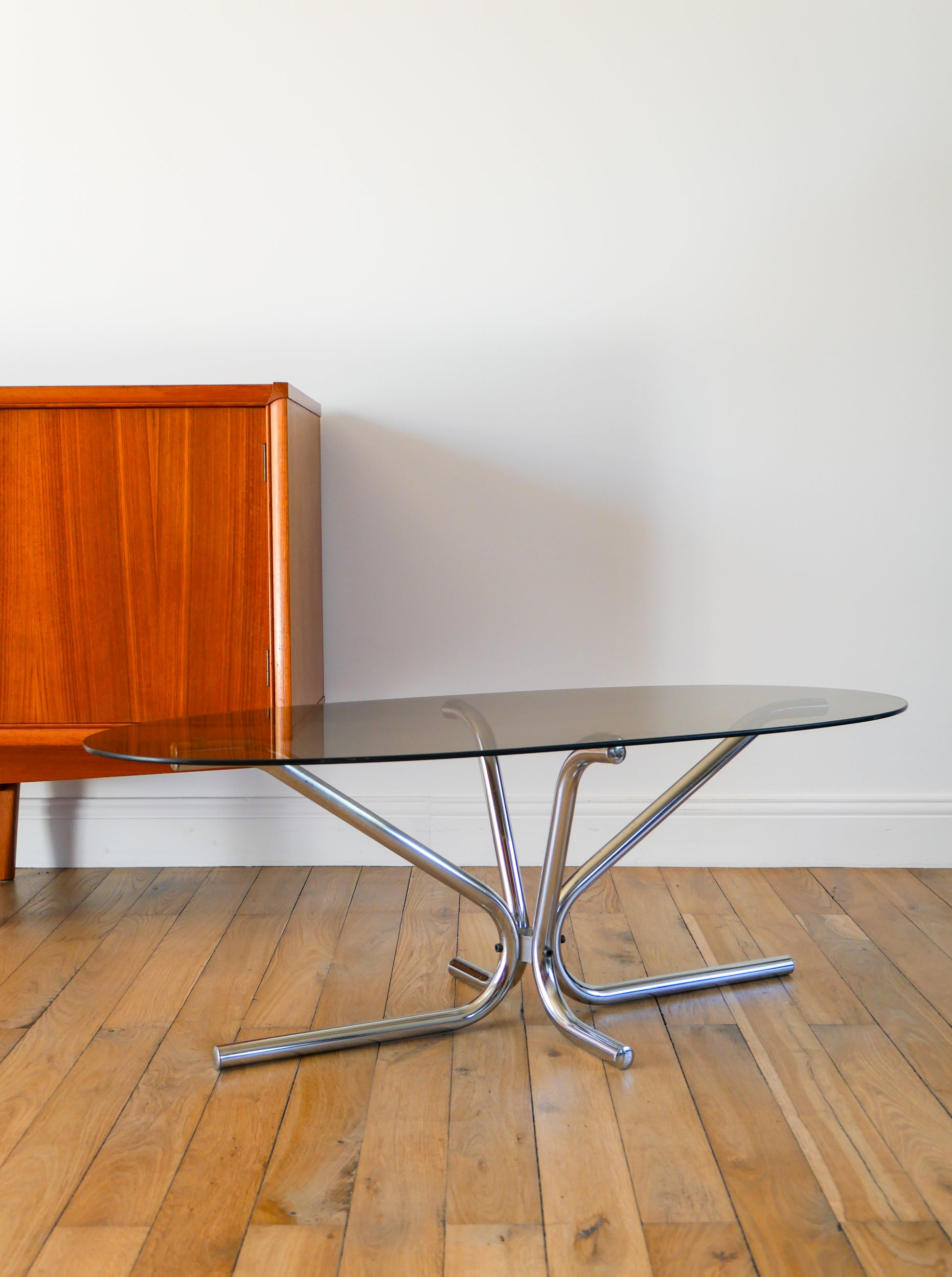 Table basse ovale en chrome et verre fumé, pieds tubulaires etoile, Design, 1970