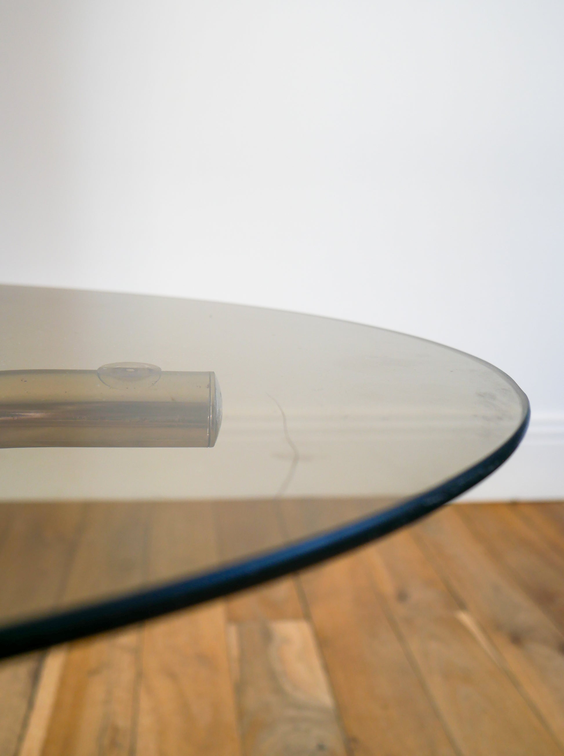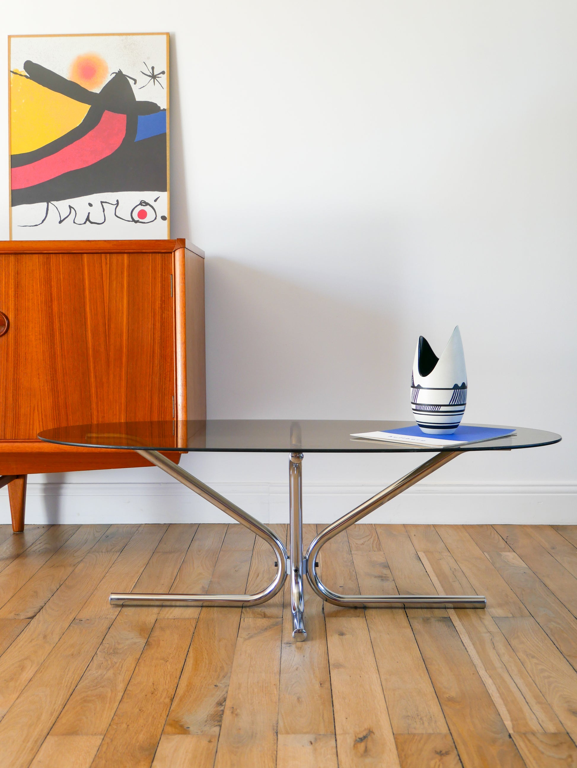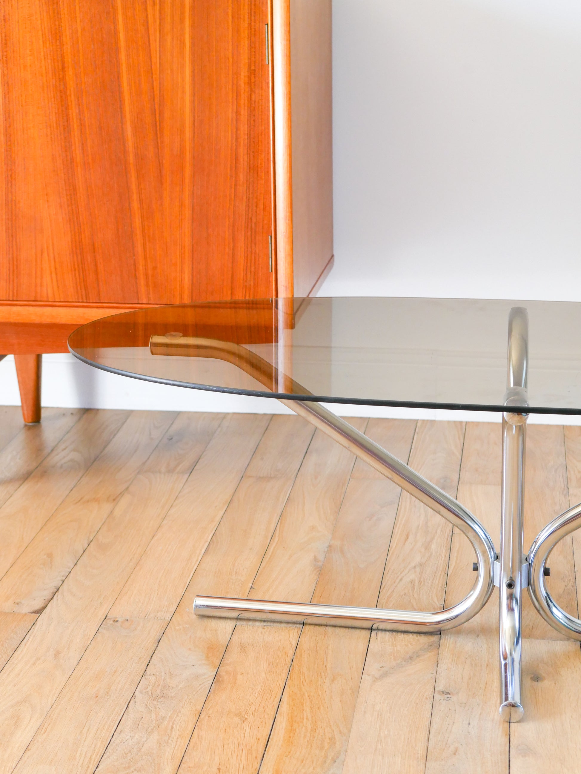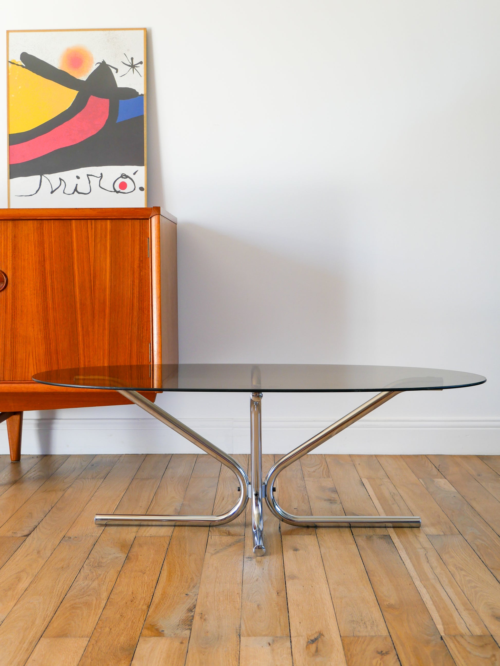 Table basse ovale en chrome et verre fumé, pieds tubulaires etoile, Design, 1970