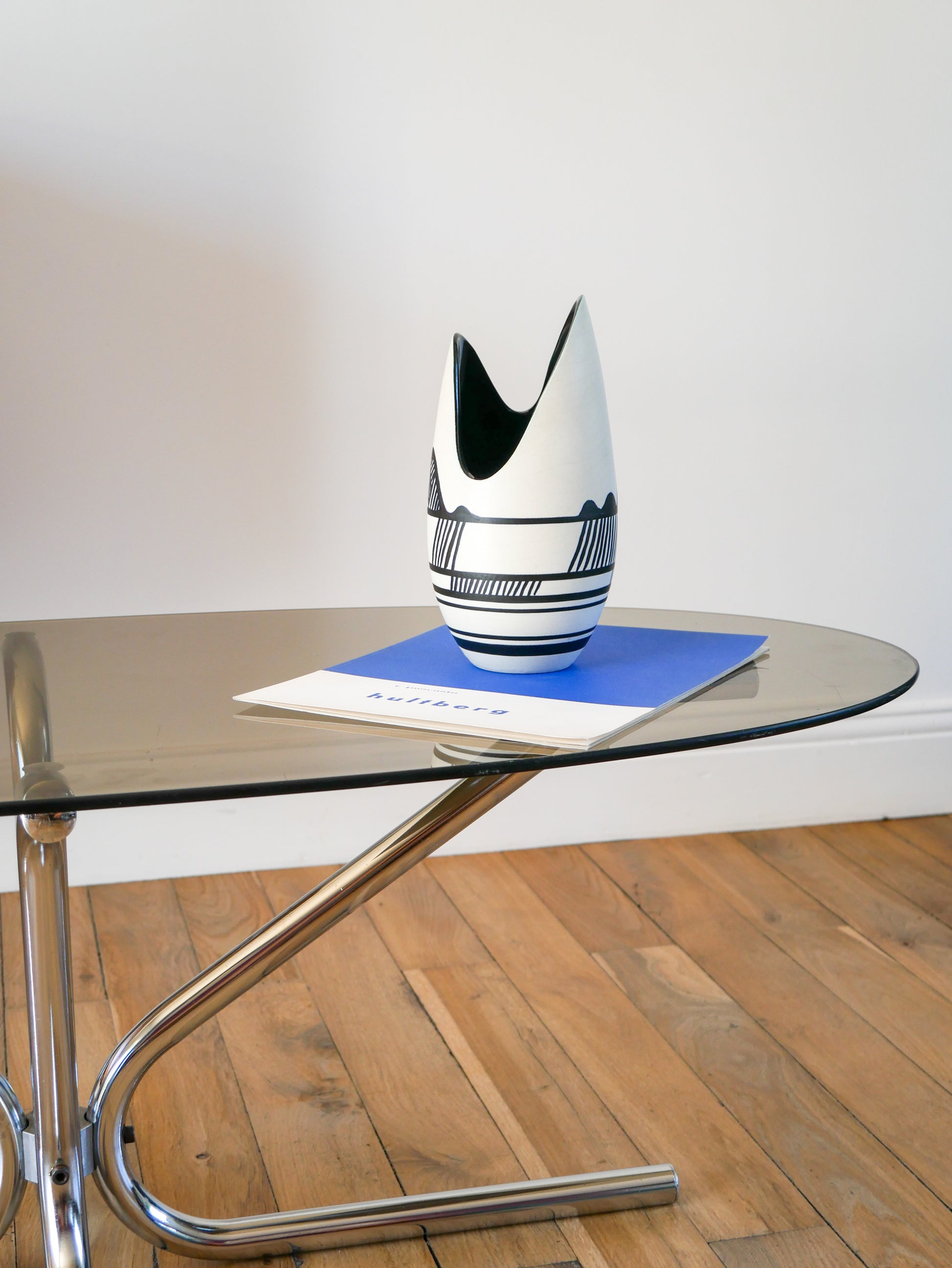 Superbe table basse ovale en chrome et verre fumé, pieds tubulaires etoile, Design, 1970. En très bon état, de rares traces du temps. Envoi rapide et soigné. Possibilité d'envois groupés - plus économique et plus écologique ! Dimensions : 103 X 44 X 36 cm.