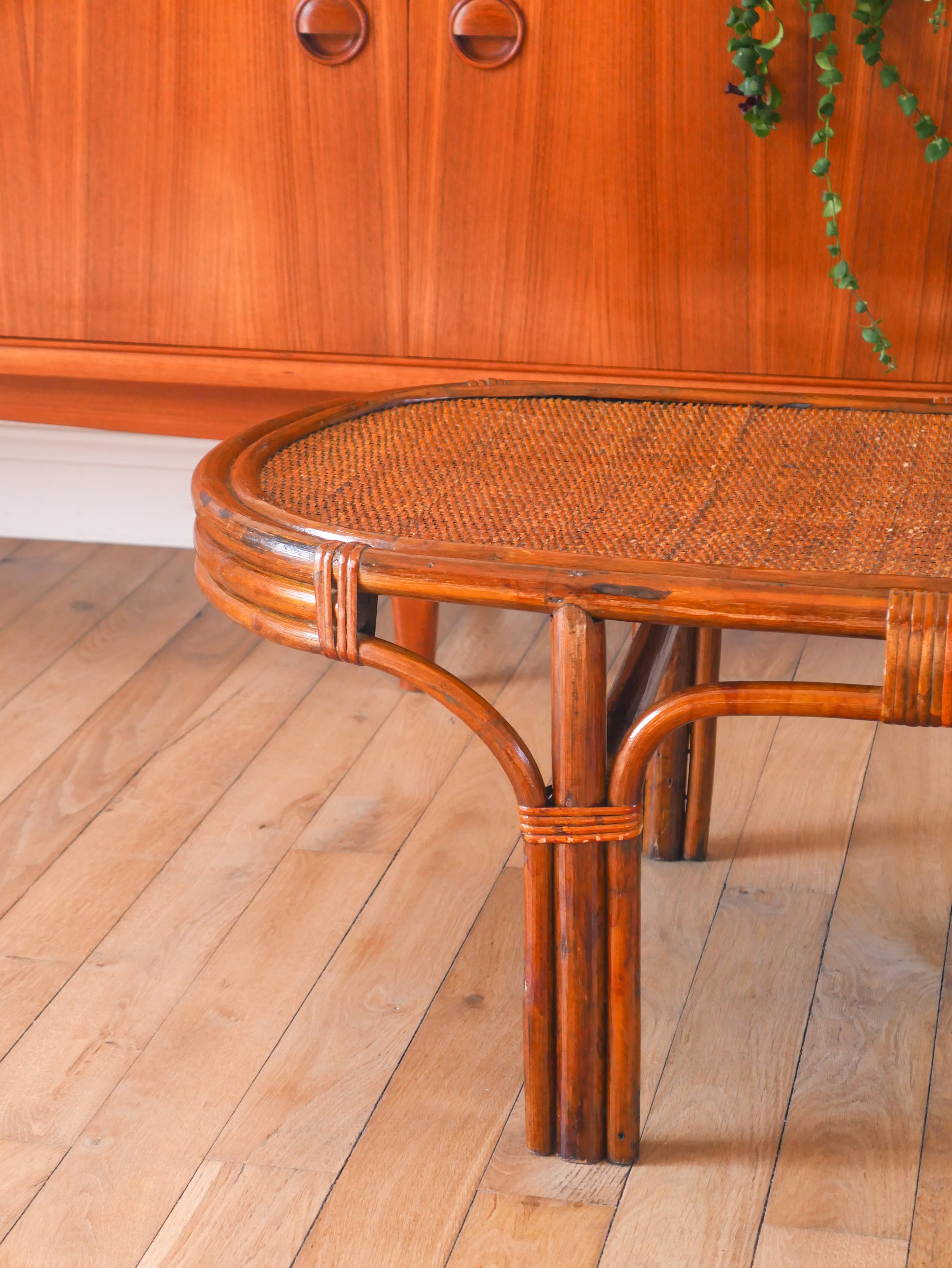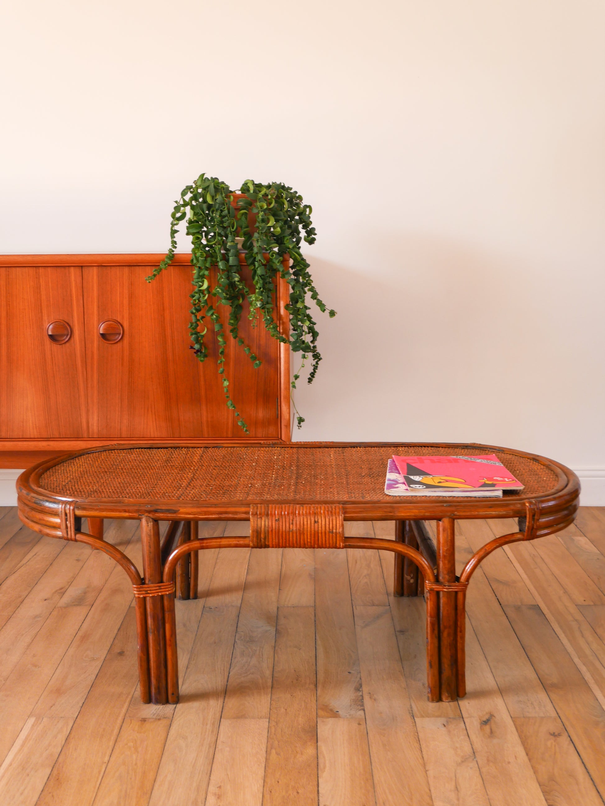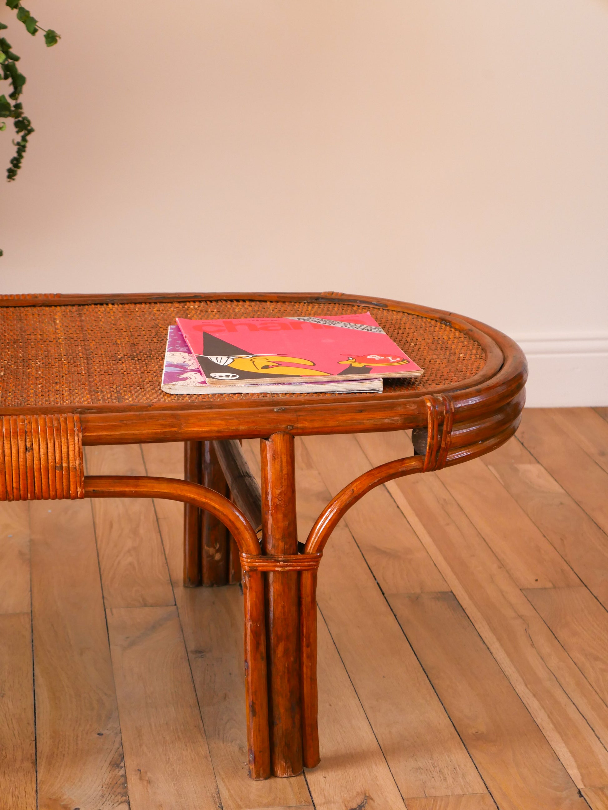 Jolie table basse ovale en rotin et bambou foncé, 1970. En très bon état, de rares traces du temps. Envoi rapide et soigné. Possibilité d'envois groupés - plus économique et plus écologique ! Dimensions : 107 X 64 X 26 cm.