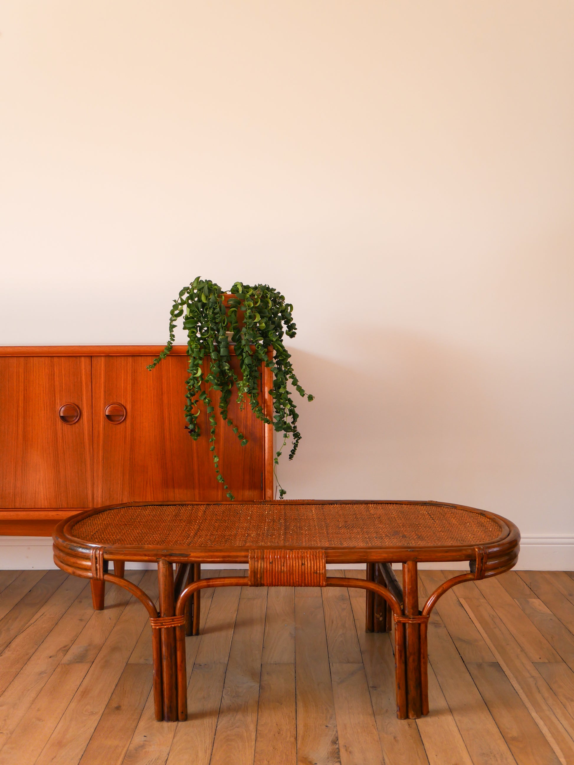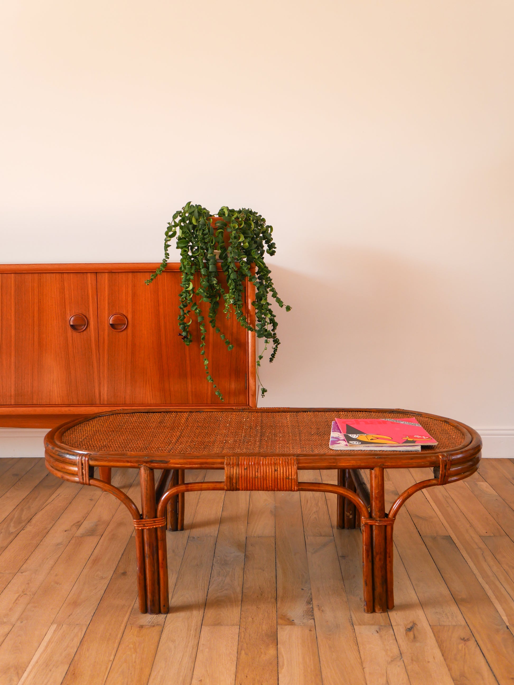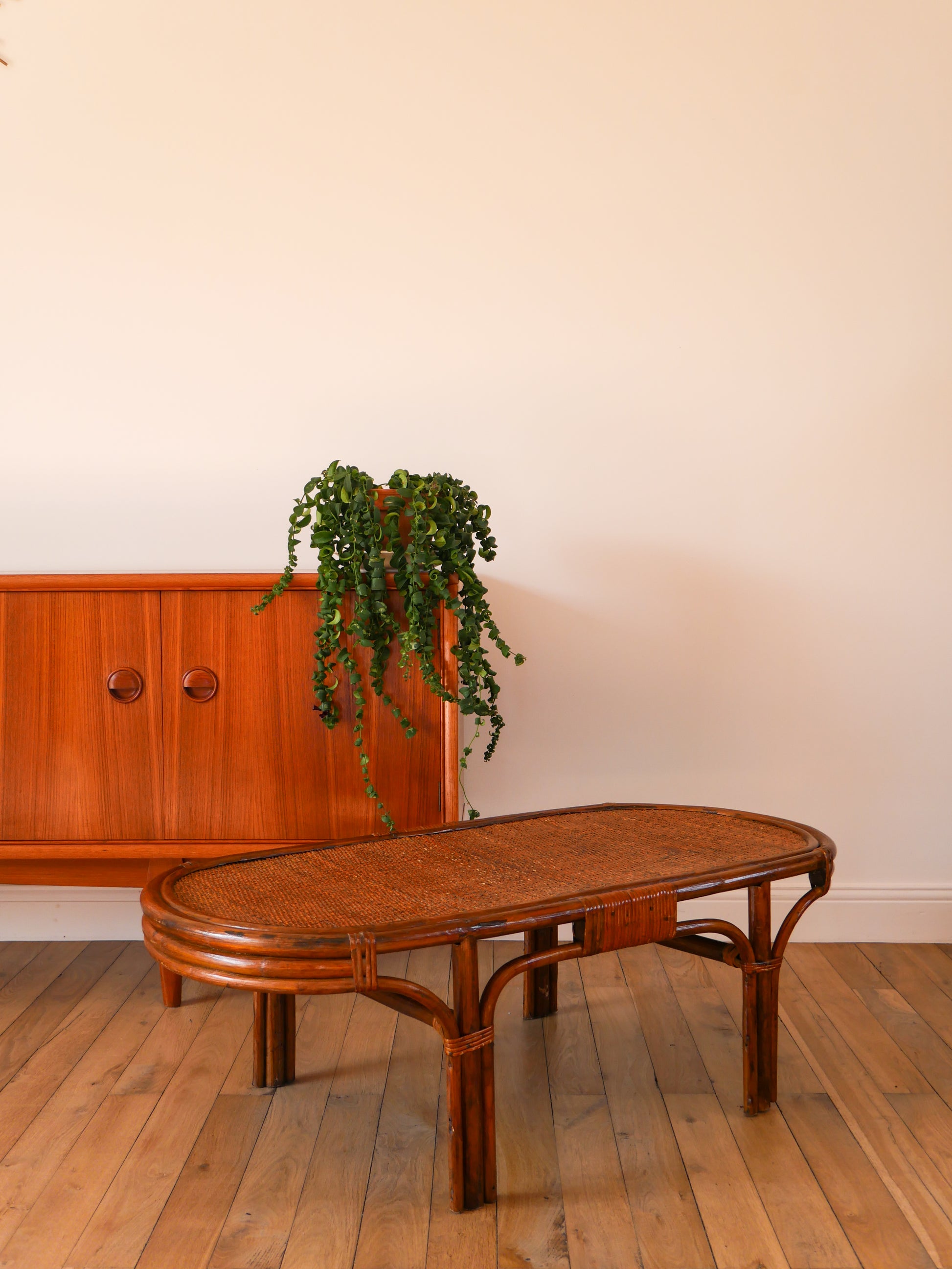 Jolie table basse ovale en rotin et bambou foncé, 1970. En très bon état, de rares traces du temps. Envoi rapide et soigné. Possibilité d'envois groupés - plus économique et plus écologique ! Dimensions : 107 X 64 X 26 cm.