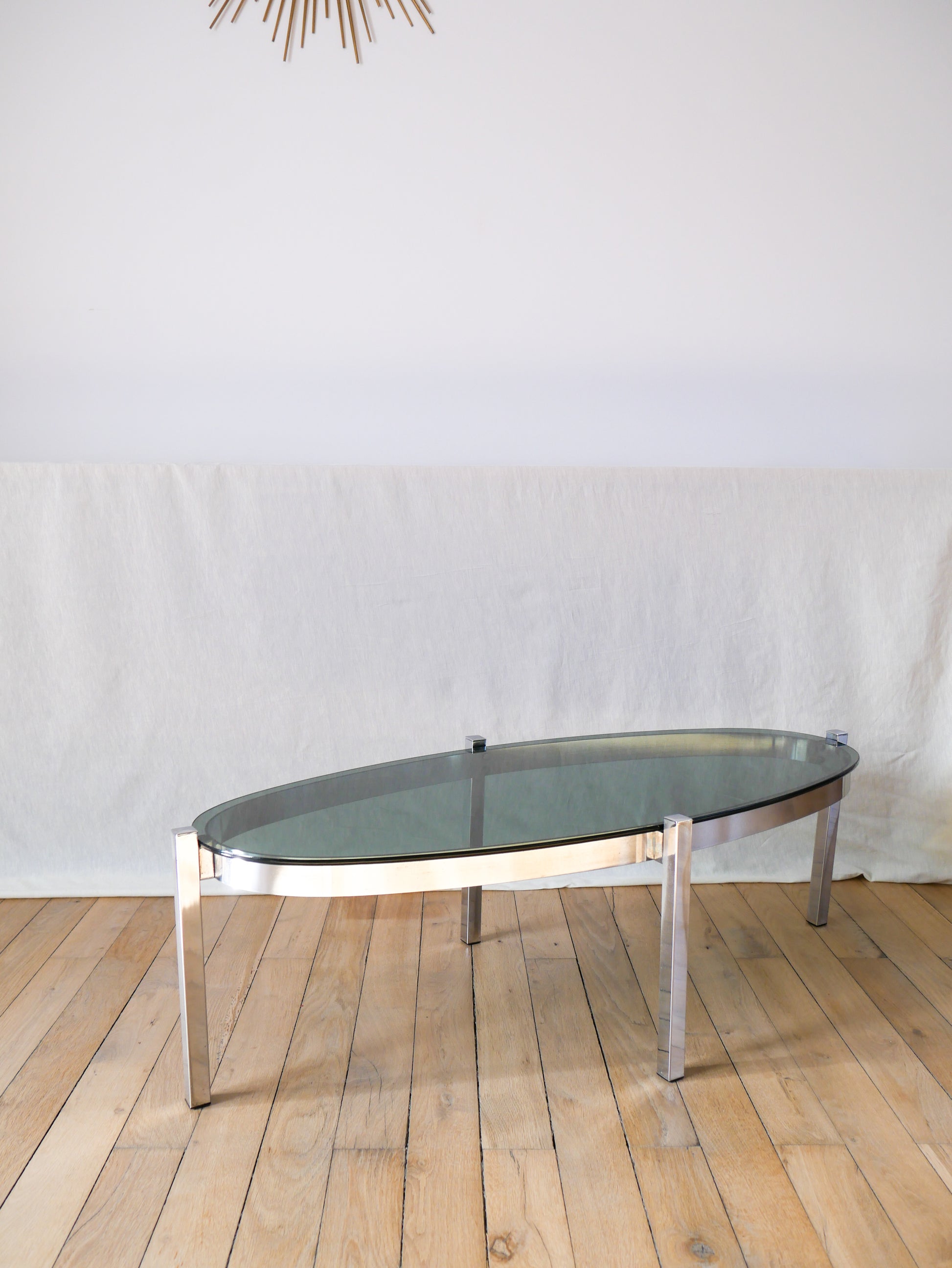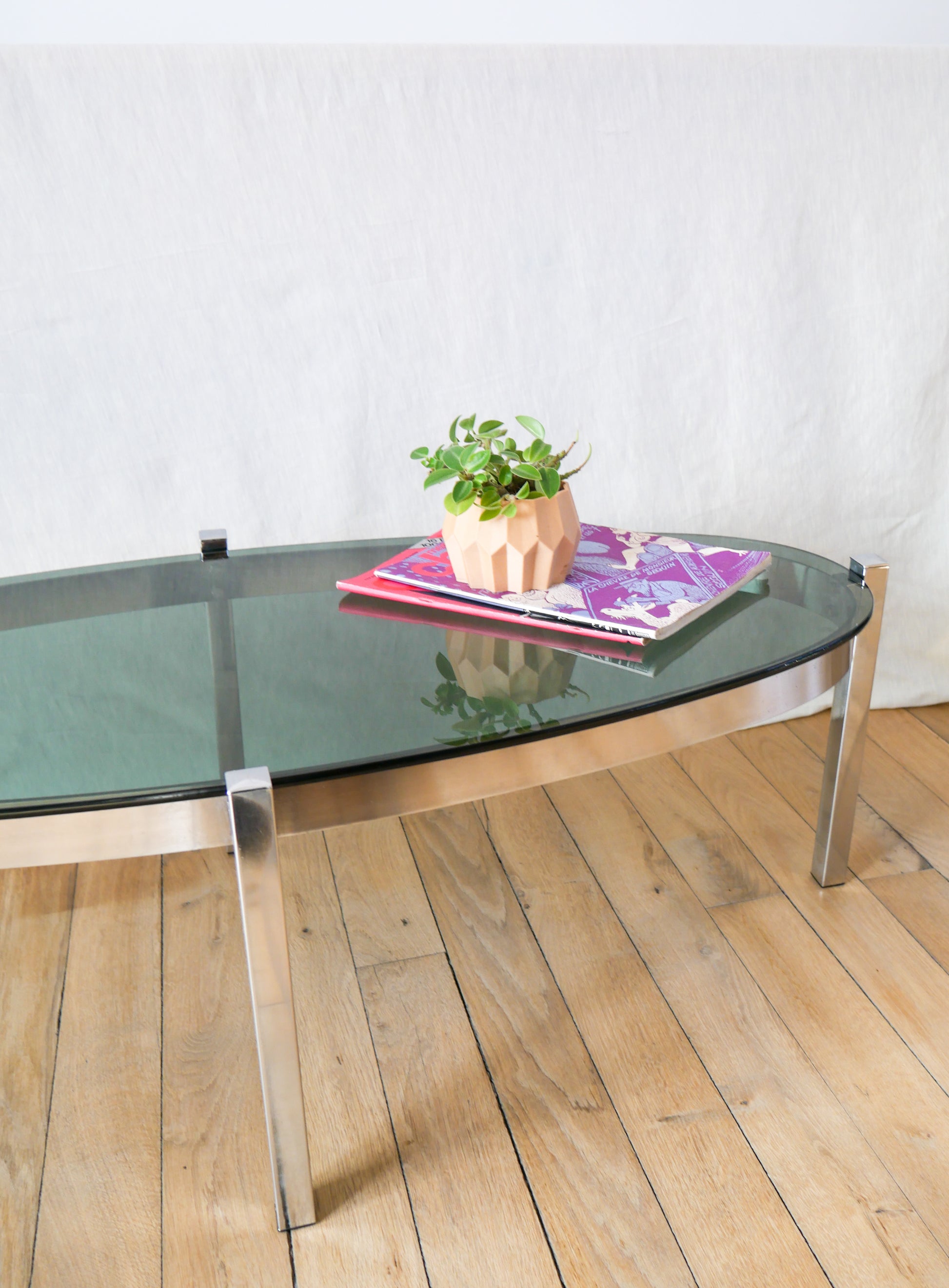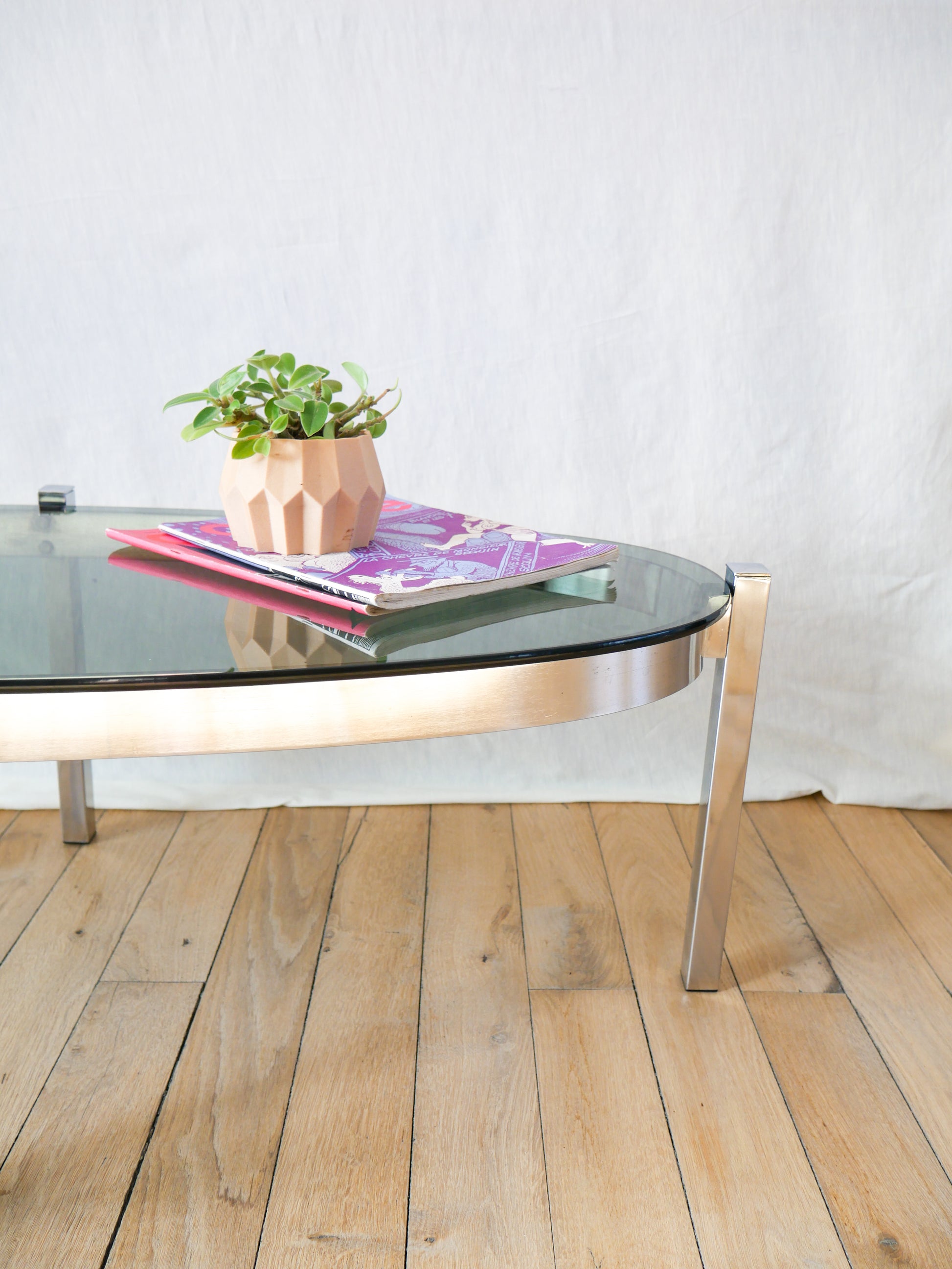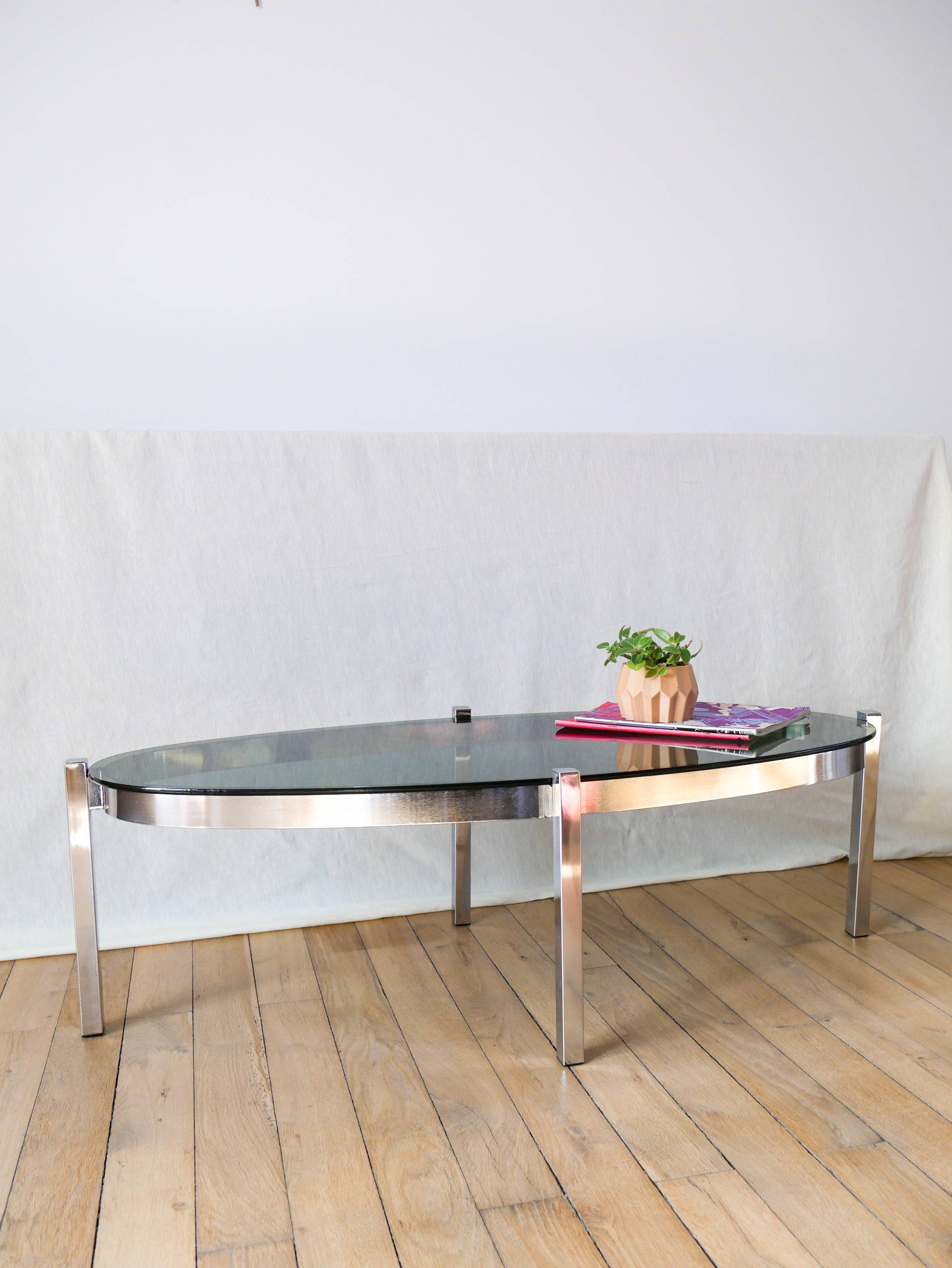 Magnifique table basse ovale en verre fumé et chrome Design 1970. En Très bon état, de rares traces du temps (présence de micro-rayures sur le plateau). Envoi rapide et soigné. Possibilité d'envois groupés - plus économique et plus écologique ! Dimensions : 110 X 51 X 34 cm.