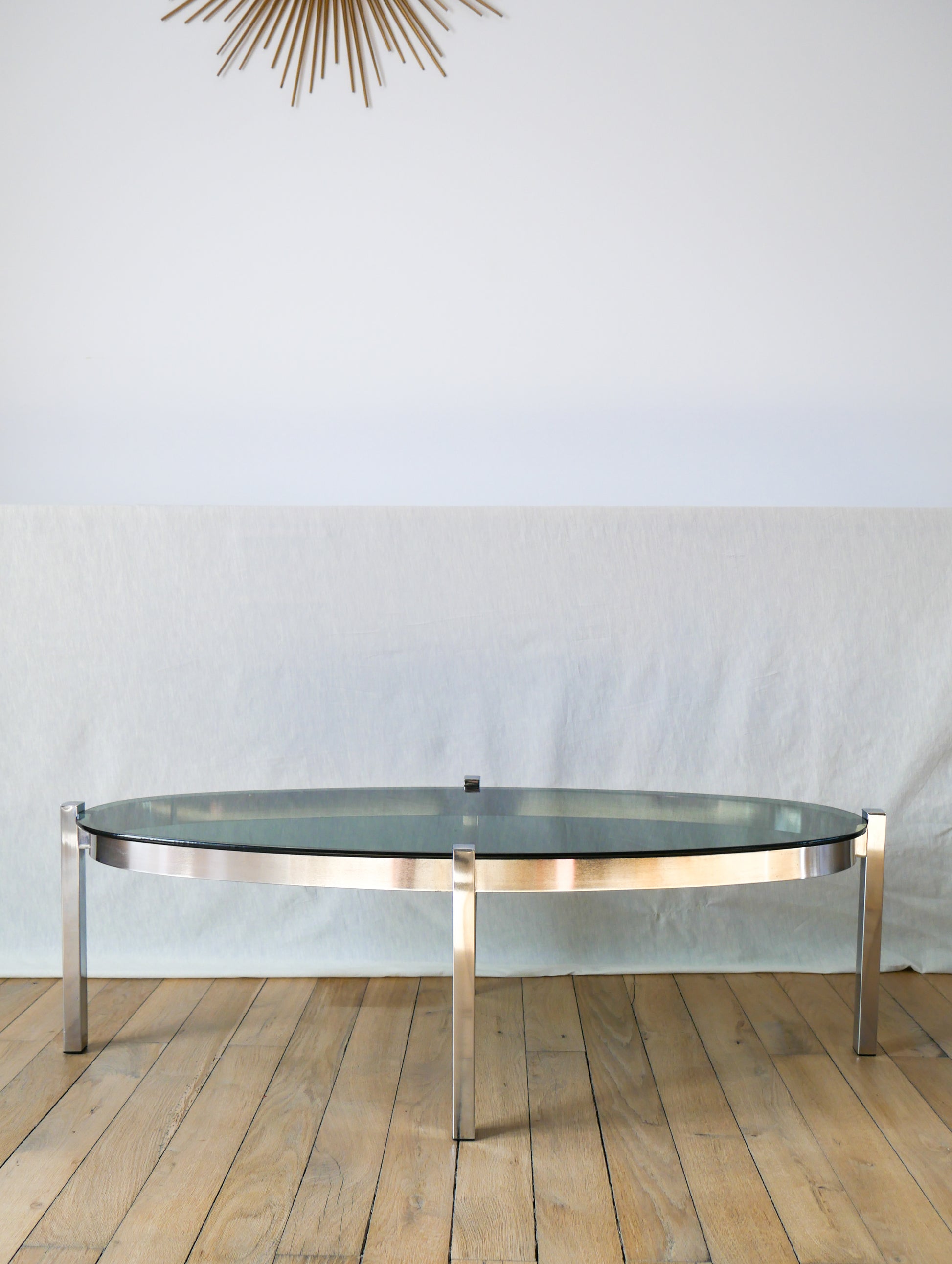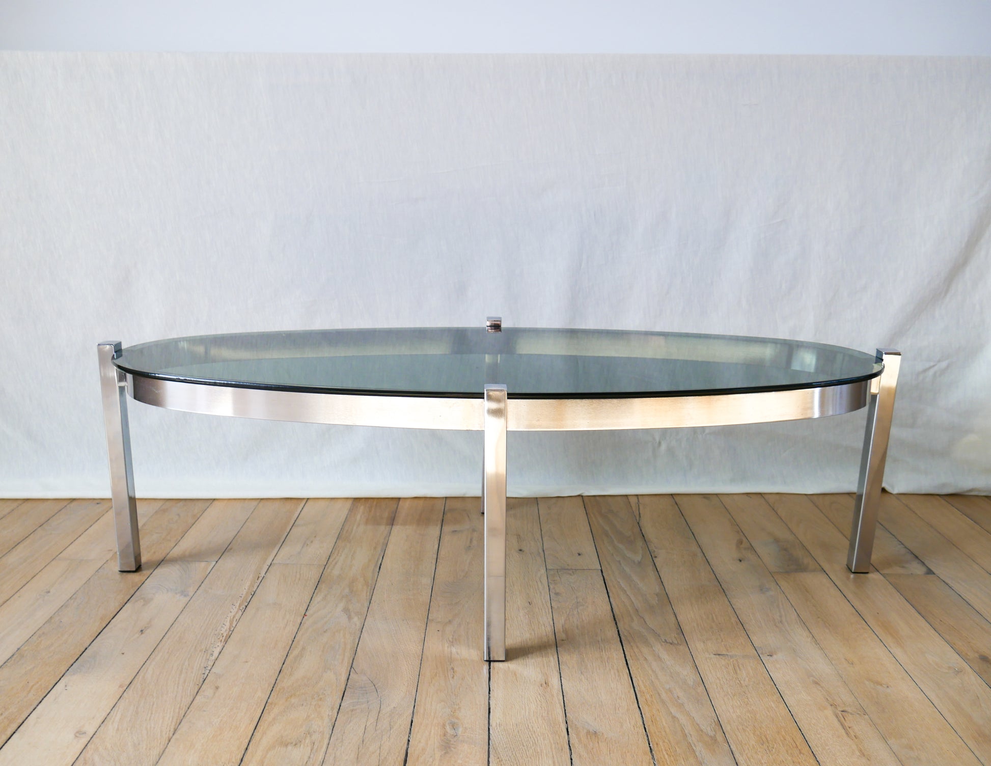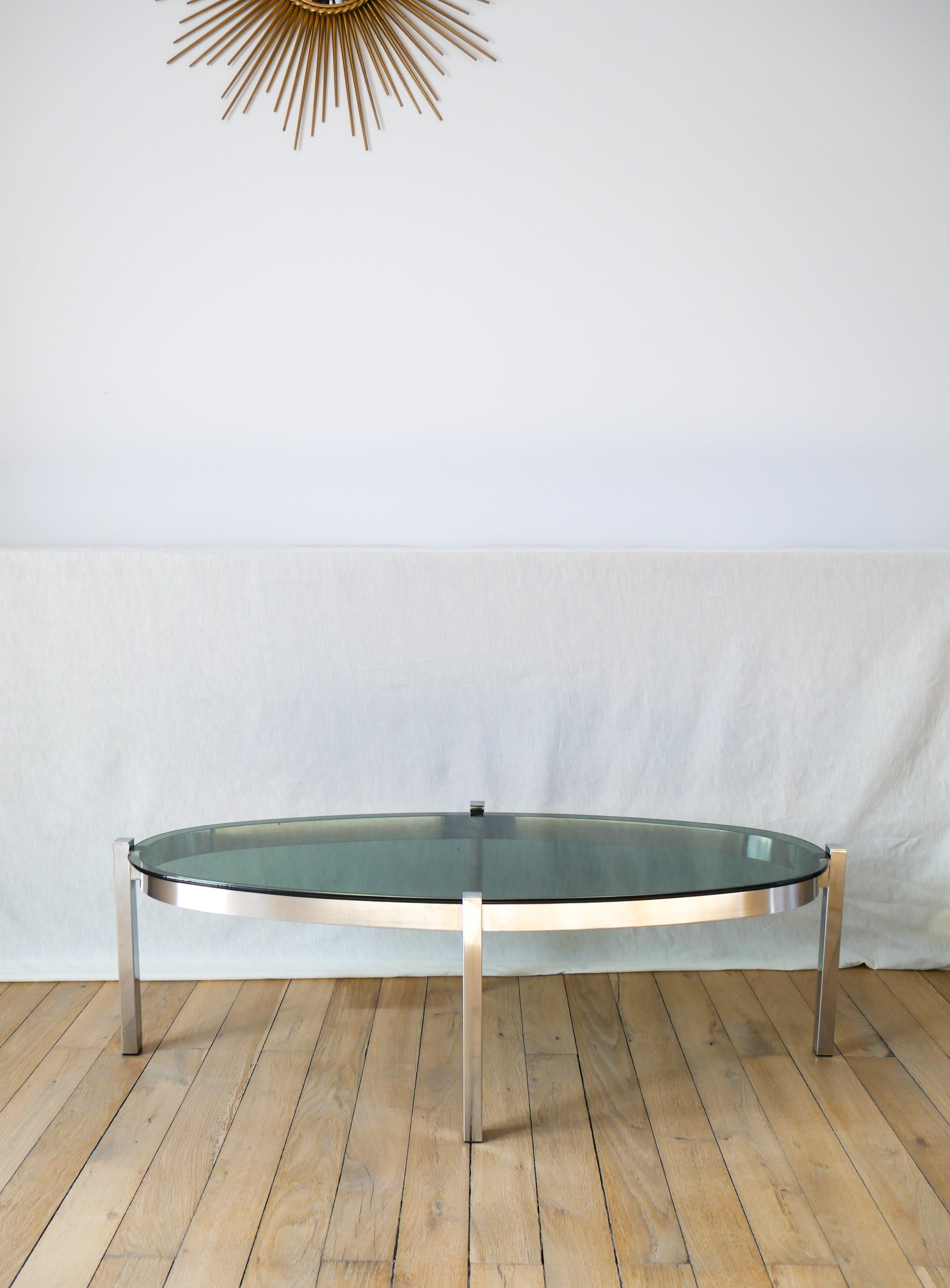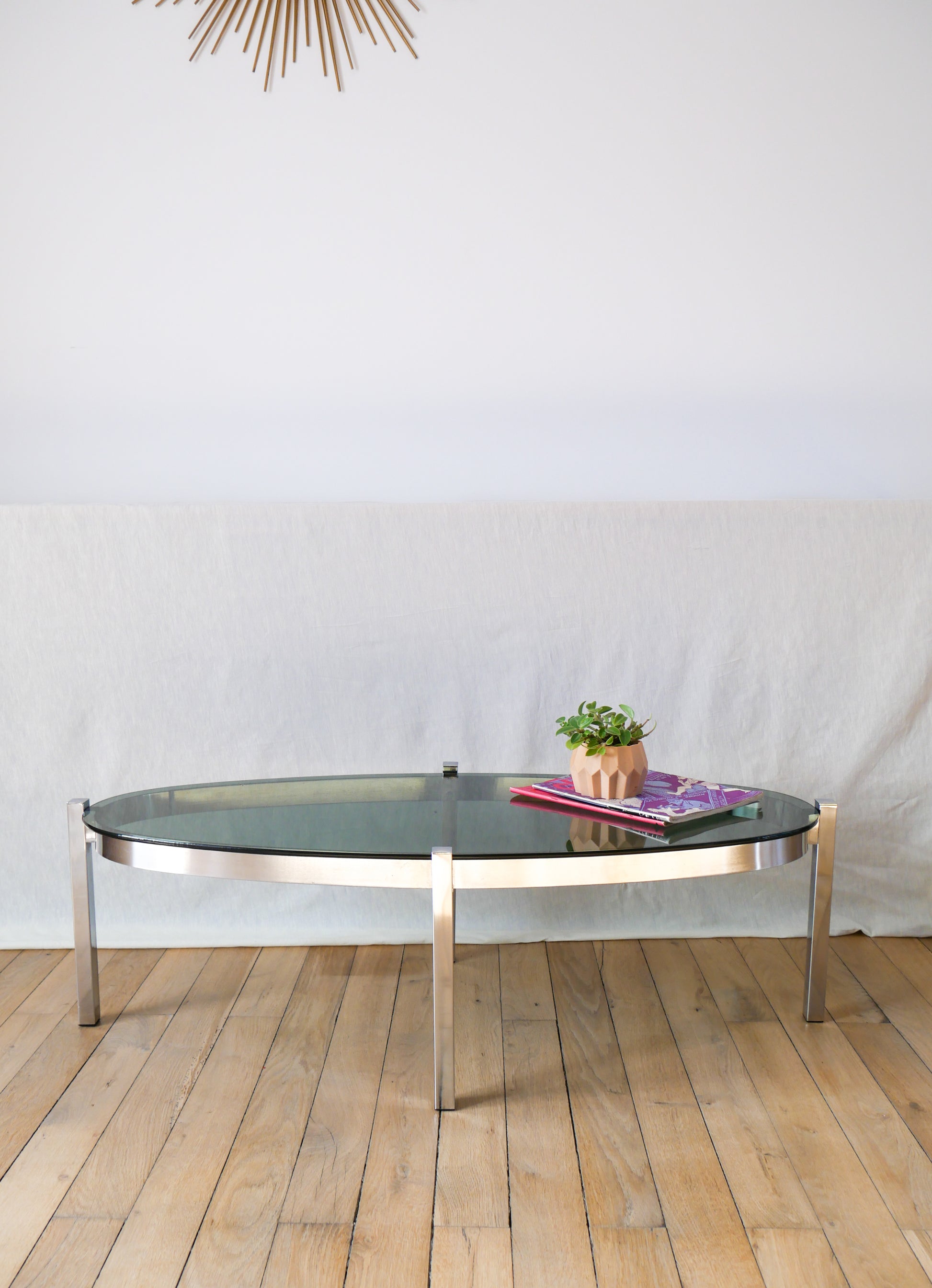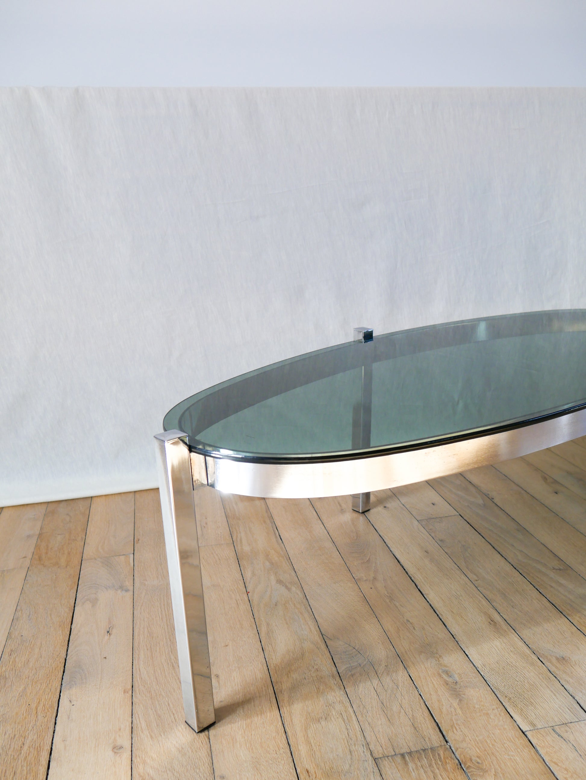 Magnifique table basse ovale en verre fumé et chrome Design 1970. En Très bon état, de rares traces du temps (présence de micro-rayures sur le plateau). Envoi rapide et soigné. Possibilité d'envois groupés - plus économique et plus écologique ! Dimensions : 110 X 51 X 34 cm.