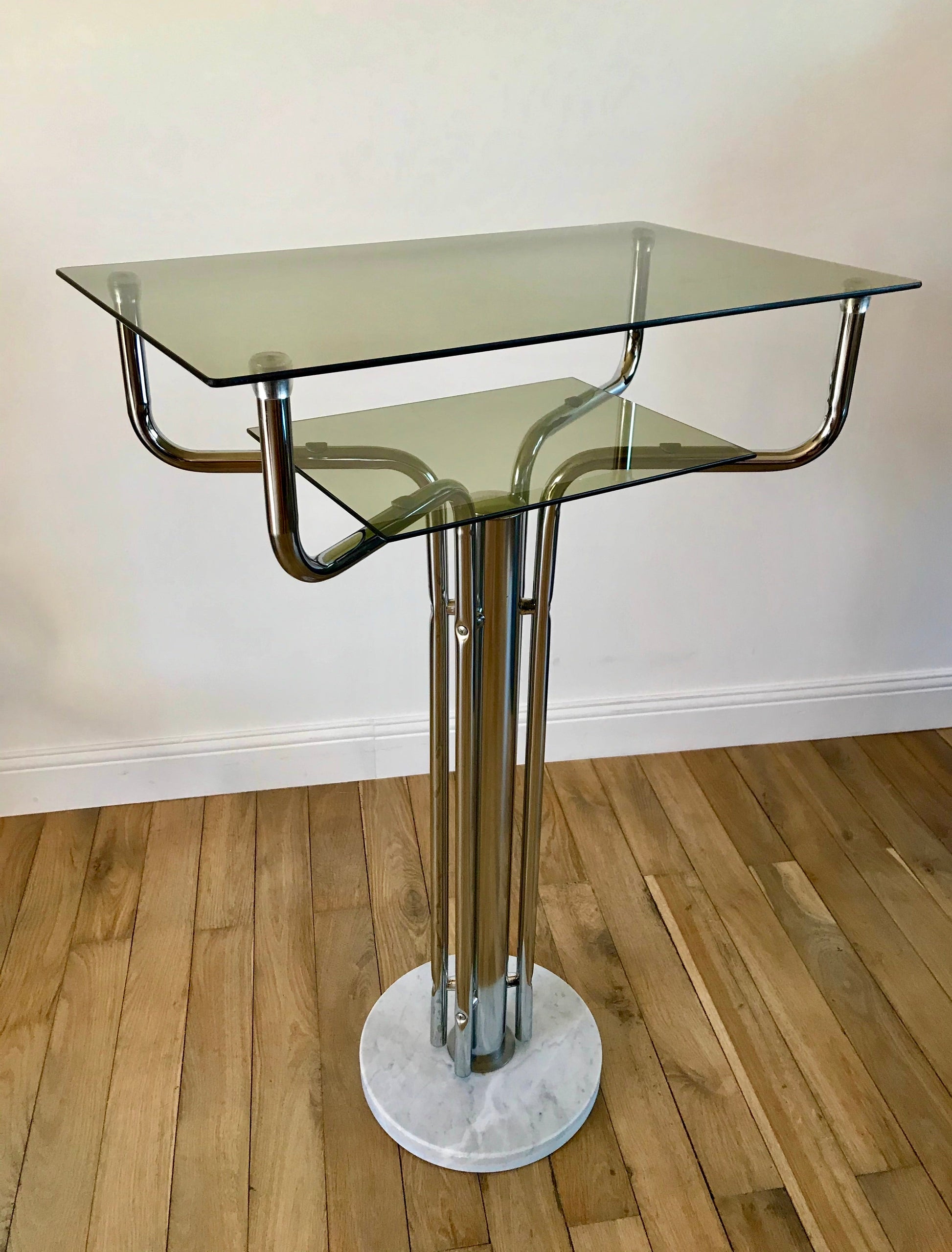 Table d'appoint design en chrome, marbre et verre fumé années 70
