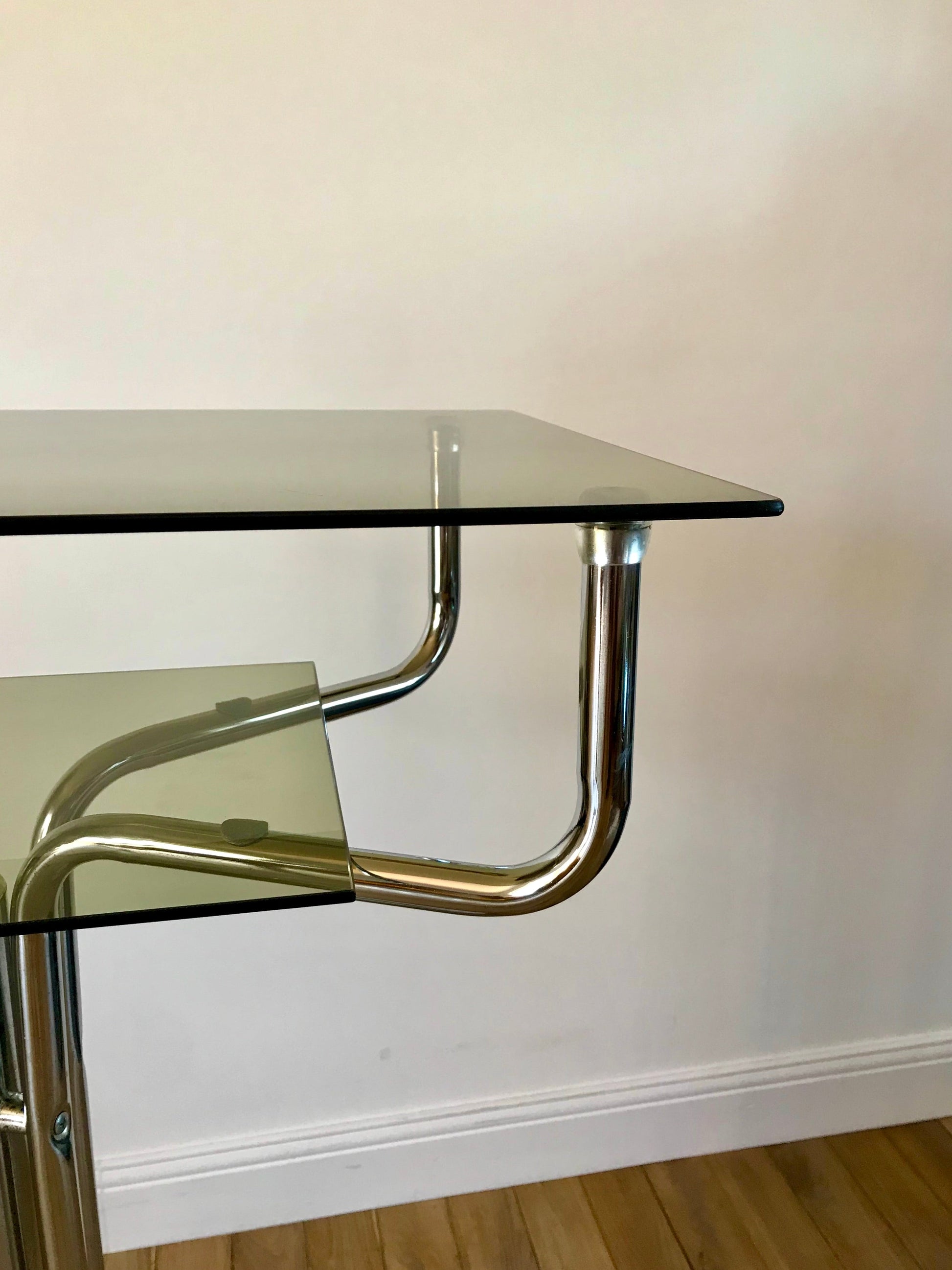 Magnifique table d'appoint design en chrome, marbre et verre fumé années 70. En excellent état. Dimensions : 96 X 36 X 60. Diamètre du pieds : 30 cm. Petit plateau en verre : 36 X 27 cm..