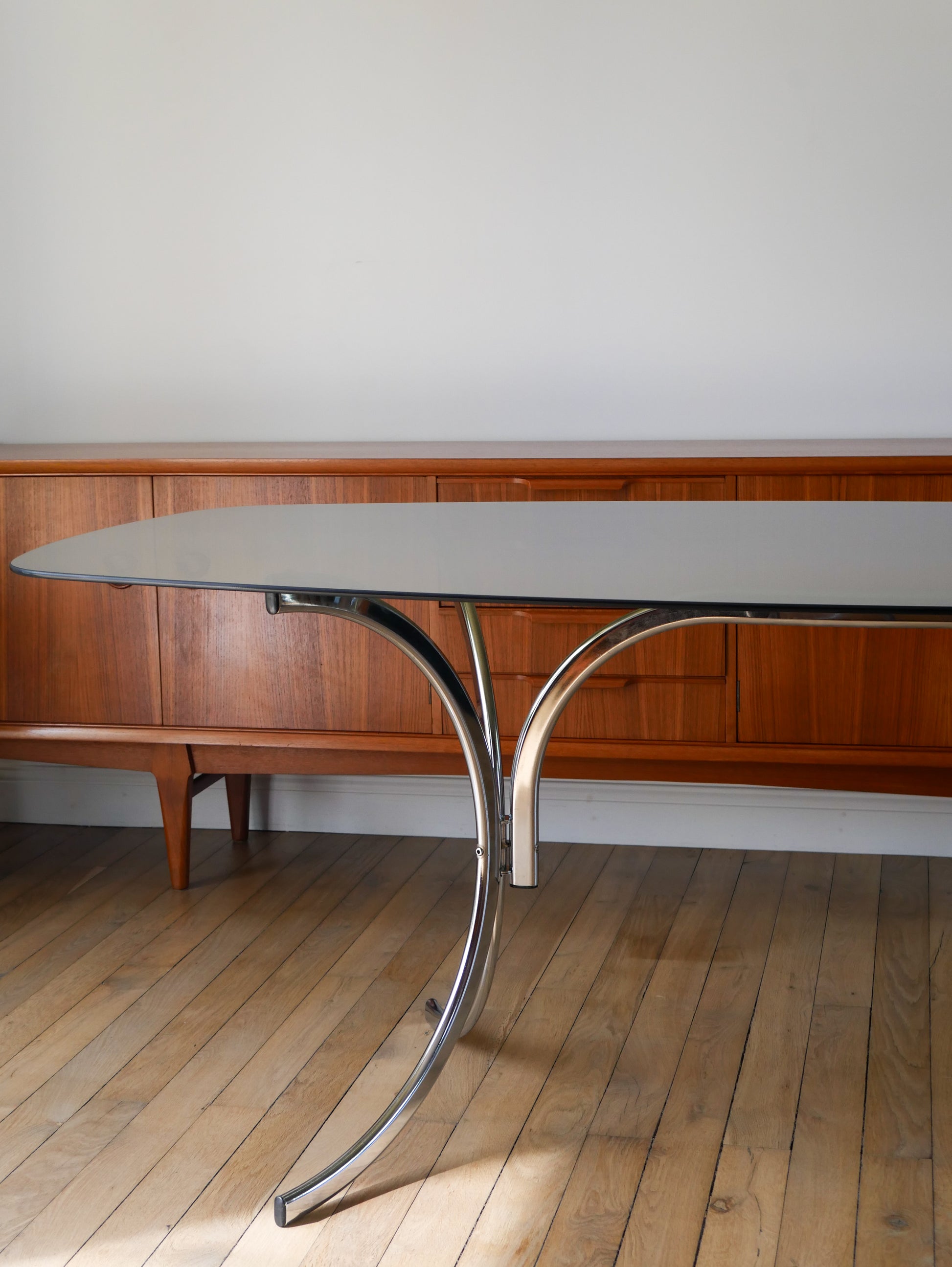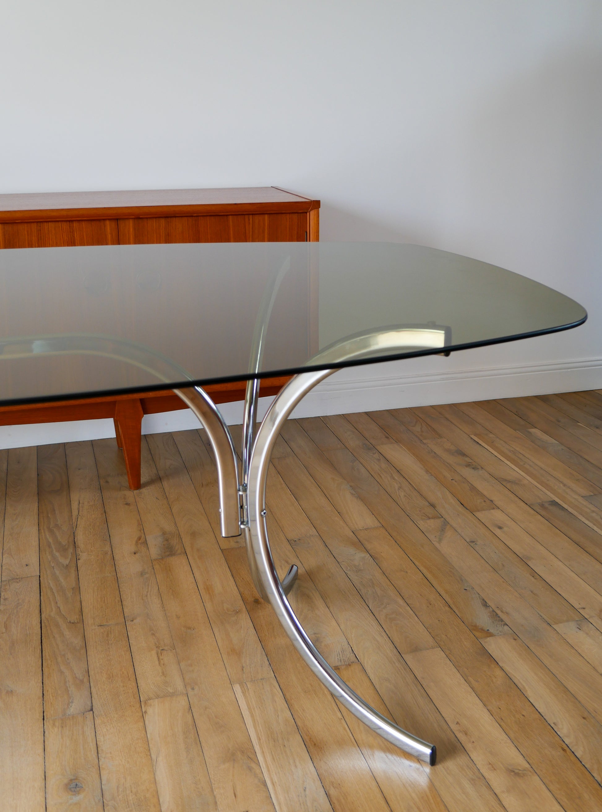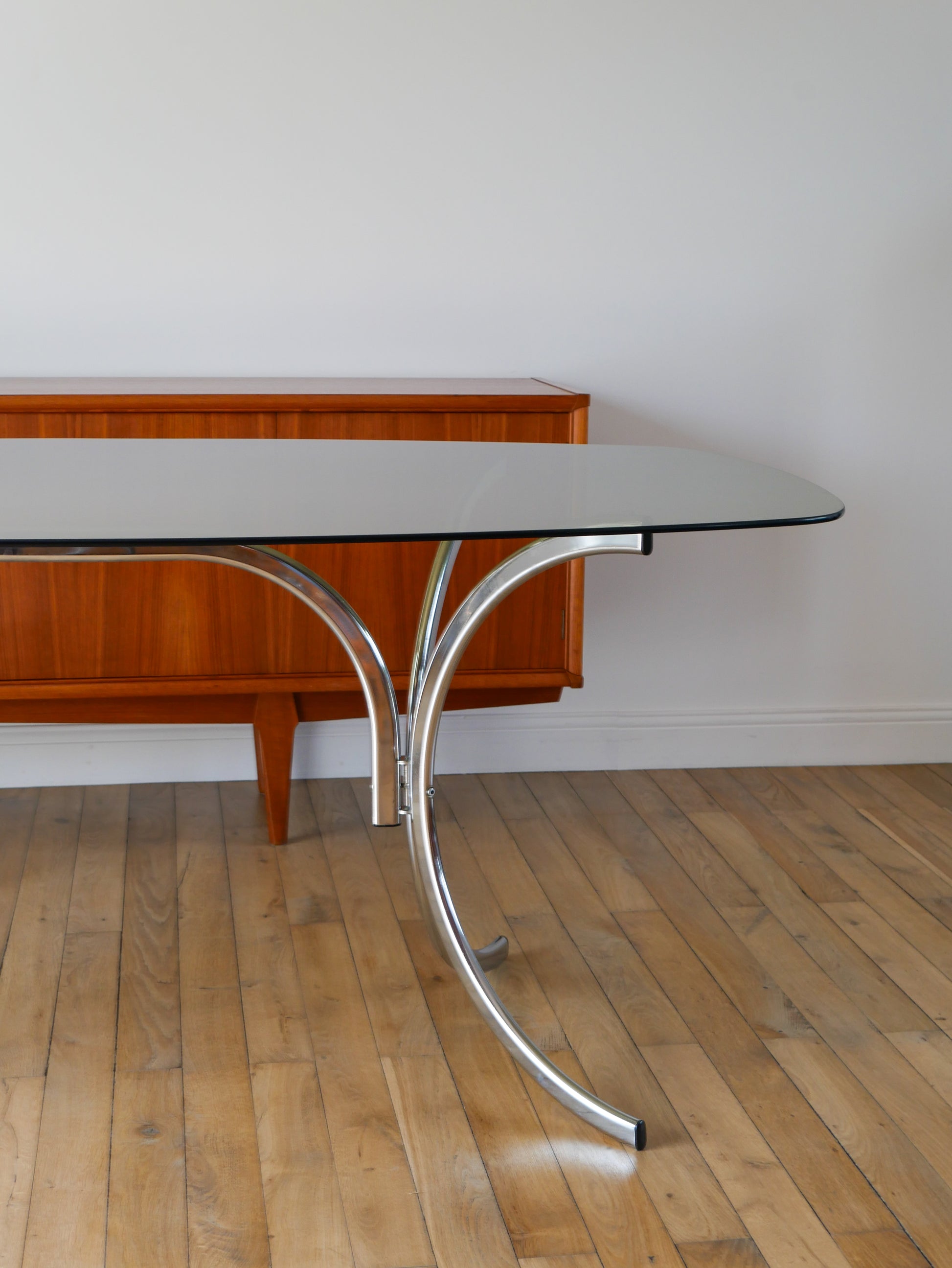 Table de salon en verre fumé et piètements en chrome, dans le goût de Gastone Rinaldi, Design, 1970