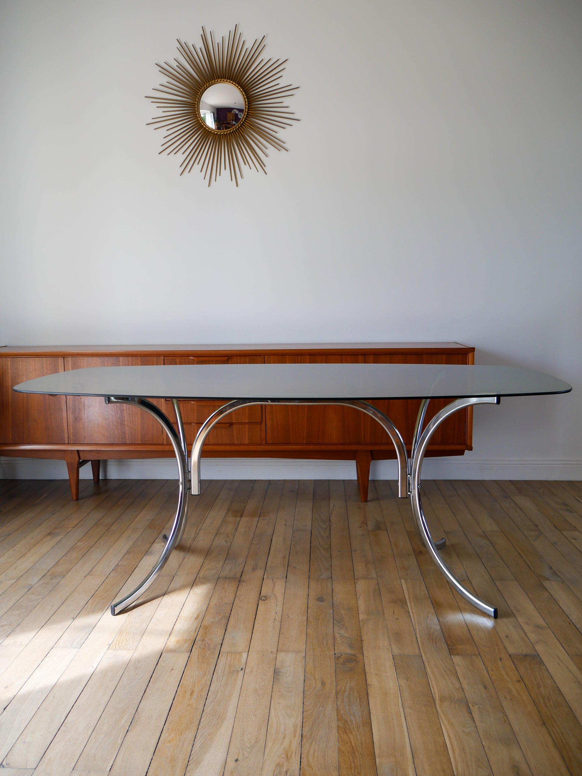 Magnifique table de salon en verre fumé et piètements en chrome, dans le goût de Gastone Rinaldi, Design, 1970. En très bon état, de rares traces du temps. Envoi rapide et soigné. Possibilité d'envois groupés - plus économique et plus écologique ! Dimensions : 180 X 96 X 73 cm.
