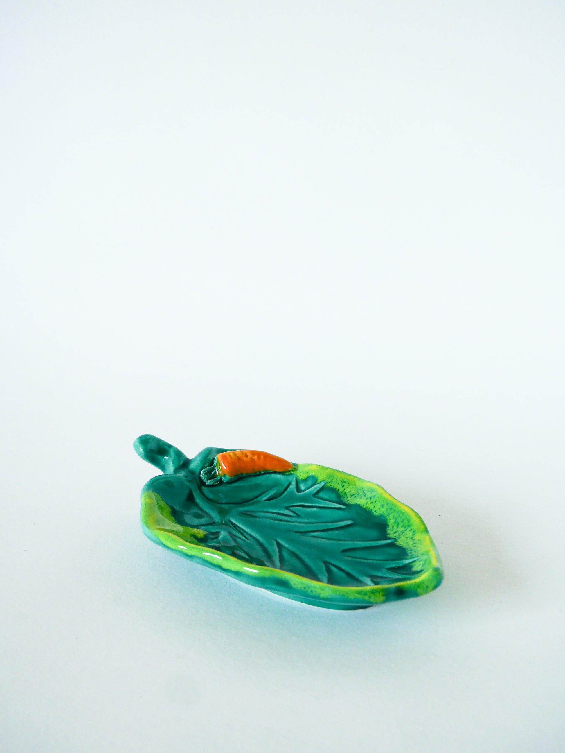 Vide-poche en céramique, modèle Feuille, Vert & Jaune, Signé Vallauris, 1970